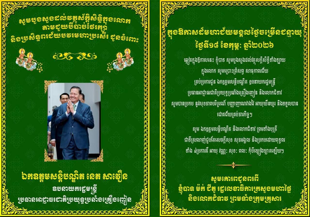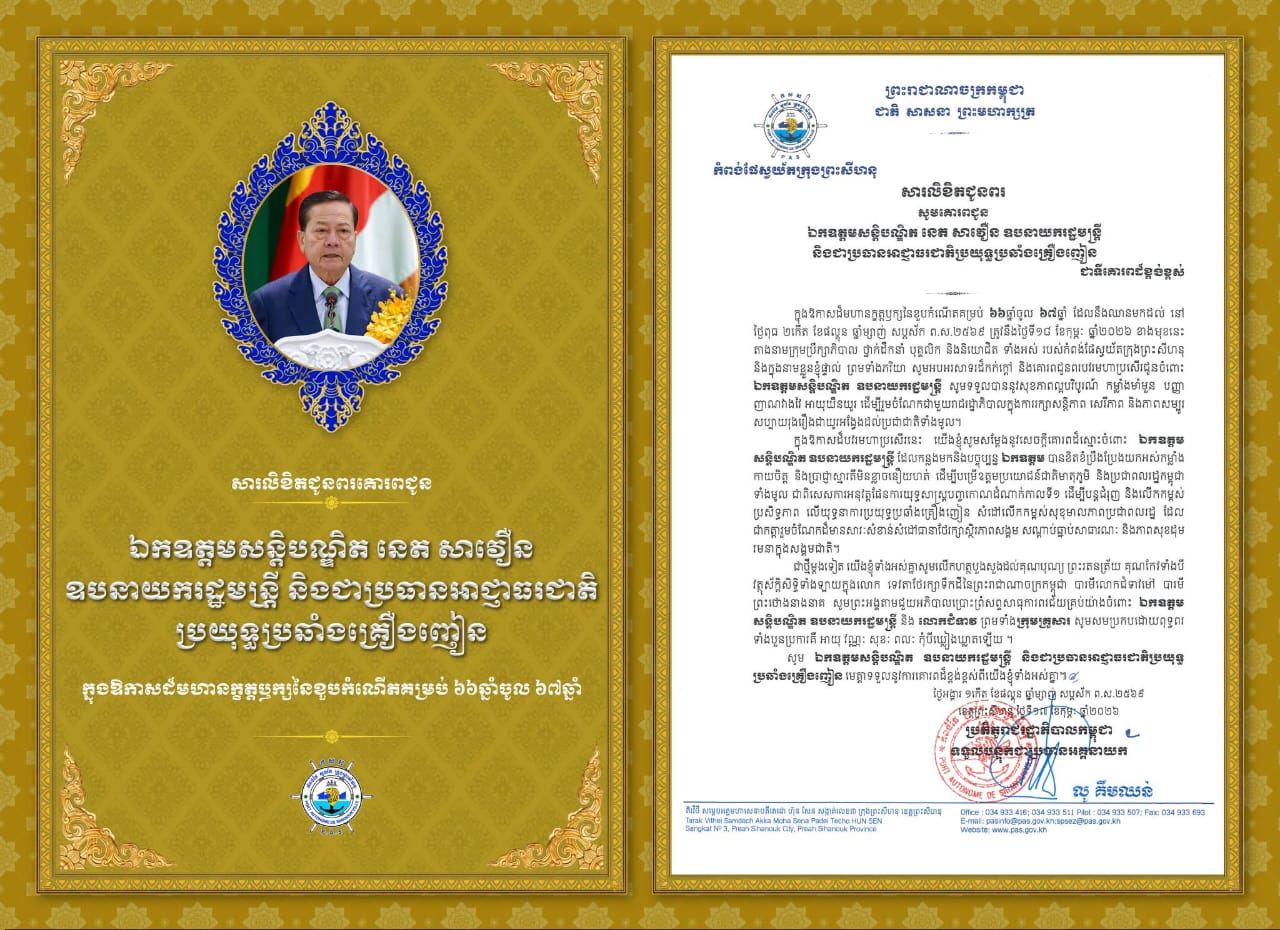 ឯកឧត្តមបណ្ឌិត ម៉ក់ ជីតូ រដ្ឋលេខាធិការក្រសួងមហាផ្ទៃ សូមគោរពជូនពរ ឯកឧត្តមសន្តិបណ្ឌិត នេត សាវឿន ឧបនាយករដ្ឋមន្ត្រី ក្នុងឱកាសខួបចម្រើនជន្មាយុគម្រប់ ៦៦ ឈានចូល ៦៧ឆ្នាំ ដែលឈាននឹងមកដល់នៅថ្ងៃទី១៨ ខែកុម្ភ: ឆ្នាំ២០២៦