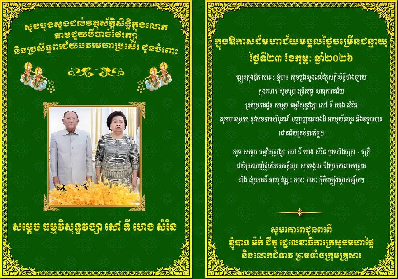 ឯកឧត្តមបណ្ឌិត ម៉ក់ ជីតូ រដ្ឋលេខាធិការក្រសួងមហាផ្ទៃ សូមគោរពជូនពរ សម្តេចធម្មវិសុទ្ធវង្សា សៅ ទី ហេង សំរិន ក្នុងឱកាសមហាជ័យមង្គលថ្ងៃចម្រើនជន្មាយុ ដែលនឹងឈានចូលមកដល់ថ្ងៃទី២៣ ខែកុម្ភ: ឆ្នាំ២០២៦ អានបន្ត