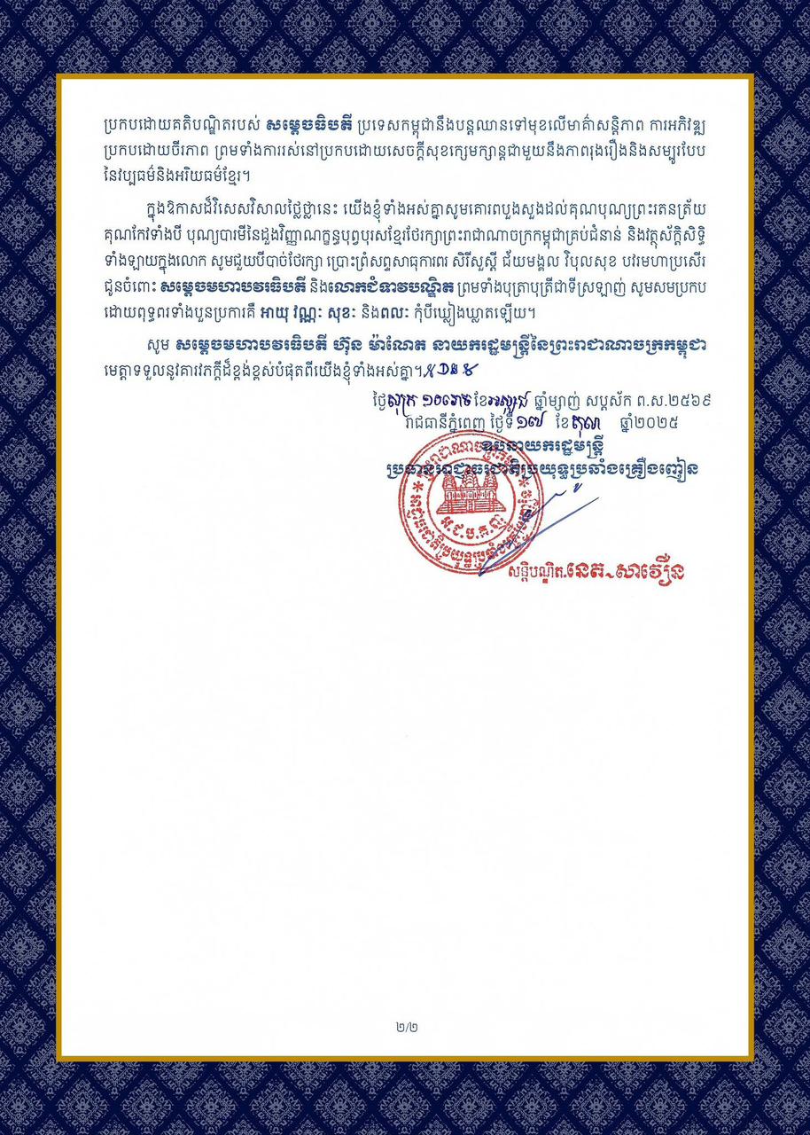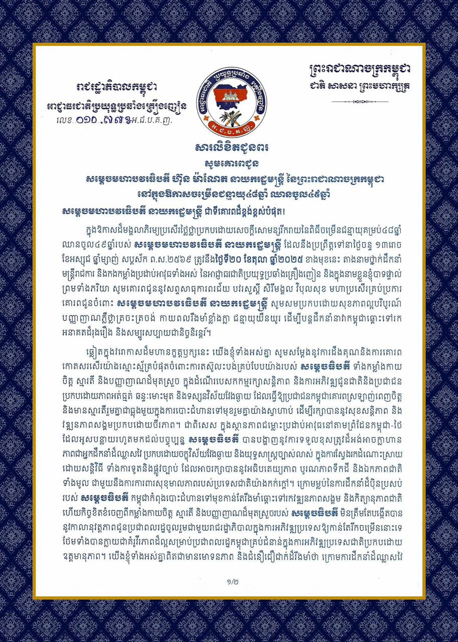 ឯកឧត្តមសន្តិបណ្ឌិត នេត សាវ៉ឿន ឧបនាយករដ្ឋមន្ត្រី ប្រធានអាជ្ញាធរជាតិប្រយុទ្ធប្រឆាំងគ្រឿងញៀន ផ្ញើសារលិខិតជូនពរ សម្តេចមហាបវរធិបតី ហ៊ុន ម៉ាណែត នាយករដ្ឋមន្ត្រី នៃព្រះរាជាណាចក្រកម្ពុជា នៅក្នុងឱកាសចម្រើនជន្មាយុ៤៨ឆ្នាំ ឈានចូល៤៩ឆ្នាំភ្នំពេញ)៖ ក្នុងឱកាសដ៏មង្គលសួស្តី នៃថ្ងៃខួបកំណើត សម្តេចមហាបវរធិបតី ហ៊ុន ម៉ាណែត នាយករដ្ឋមន្រ្តីនៃព្រះរាជាណាចក្រកម្ពុជា គម្រប់ ៤៨ឆ្នាំ ឈានចូល ៤៩ឆ្នាំ នាថ្ងៃទី២០ ខែតុលា ឆ្នាំ២០២៥ ឯកឧត្តមសន្តិបណ្ឌិត នេត សាវ៉ឿន ឧបនាយករដ្ឋមន្ត្រី ប្រធានអាជ្ញាធរជាតិប្រយុទ្ធប្រឆាំងគ្រឿងញៀន និងលោកជំទាវ ព្រមទាំងថ្នាក់ដឹកនាំ និងមន្ត្រីរាជការទាំងអស់ នៃអាជ្ញាធរជាតិប្រយុទ្ធប្រឆាំងគ្រឿងញៀន សូមផ្ញើសារលិខិតគោរពជូនពរ សម្តេចមហាបវរធិបតី ទទួលបានសុខភាពល្អបរិបូរណ៍ បញ្ញាញាណភ្លឺថ្លា អាយុយឺនយូរ ដើម្បីបន្តបេសកកម្មដ៏ឧត្តុង្គឧត្តម ដើម្បីដឹកនាំកម្ពុជាឱ្យរីកចម្រើនរុងរឿងតទៅ។នាឱកាសដ៏ថ្លៃថ្លានេះ យើងខ្ញុំទាំងអស់គ្នា សូមគោរពកោតសរសើរចំពោះ សម្តេចមហាបវរធិបតី ហ៊ុន ម៉ាណែត ដែលបានខិតខំប្រឹងប្រែងអស់ពីកម្លាំងកាយចិត្ត ប្រាជ្ញាស្មារតី ដោយមិនខ្លាចនឿយហត់ដឹកនាំរាជរដ្ឋាភិបាលបម្រើឧត្តមប្រយោជន៍ជាតិ និងប្រជាជន ជាពិសេសបន្តថែរក្សានូវសុខសន្តិភាព ស្ថិរភាពនយោបាយ ស្ថិរភាពម៉ាក្រូសេដ្ឋកិច្ច កំណើនសេដ្ឋកិច្ចខ្ពស់ ការពារបូរណភាពទឹកដី និងអធិបតេយ្យភាពជាតិ ដែលជាមូលដ្ឋានគ្រឹះដ៏សំខាន់ក្នុងការអភិវឌ្ឍប្រទេសជាតិលើគ្រប់វិស័យ។ក្រោមការដឹកនាំរាជរដ្ឋាភិបាលបន្តវេន របស់សម្តេចមហាបវរធិបតី ប្រជាជនកម្ពុជាបន្តរួមរស់ជាមហាគ្រួសារ ប្រកបដោយសុភមង្គល វិបុលភាព, មោទនភាពជាតិ កិត្យានុភាពជាតិ និងឧត្តមភាព នៃរាជរដ្ឋាភិបាលកម្ពុជា កាន់តែត្រូវបានលើកកម្ពស់នៅក្នុងក្របខ័ណ្ឌតំបន់ និងពិភពលោក។យើងខ្ញុំទាំងអស់គ្នា សូមបួងសួងដល់គុណបុណ្យព្រះរតនត្រ័យ គុណកែវទាំងបី ឫទ្ធិបារមីខ្លាំងក្លា វត្ថុស័ក្តិសិទ្ធិទាំងឡាយក្នុងលោក សូមមេត្តាតាមជួយបីបាច់ថែរក្សាប្រោះព្រំនូវសព្ទសាធុការពរជ័យ សិរីសួស្តី ជ័យមង្គល វិបុលសុខ គ្រប់ប្រការជូន សម្តេចមហាបវរធិបតី និងលោកជំទាវបណ្ឌិត ព្រមទាំងបុត្រាបុត្រី សូមមានជន្មាយុយឺនយូរ ជួបប្រទះតែសេចក្តី សុខចម្រើន មានសុភមង្គលក្នុងក្រុមគ្រួសារ មានសុខុមាលភាពល្អបរិបូរណ៍ និងសូមប្រកបដោយព្រះពុទ្ធពរដ៏ប្រពៃថ្លៃថ្លា បួនប្រការគឺ អាយុ វណ្ណៈ សុខៈ ពលៈ ជានិច្ចនិរន្តរ៍កុំបីឃ្លៀងឃ្លាតឡើយ៕