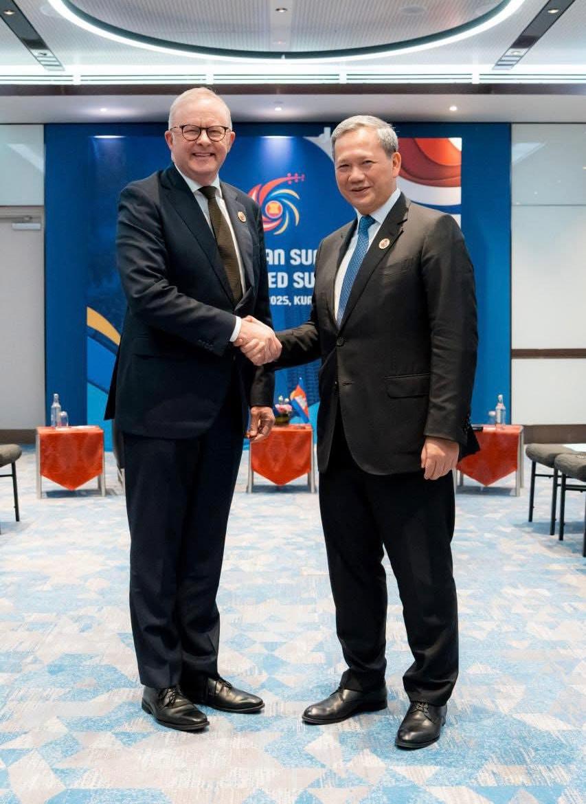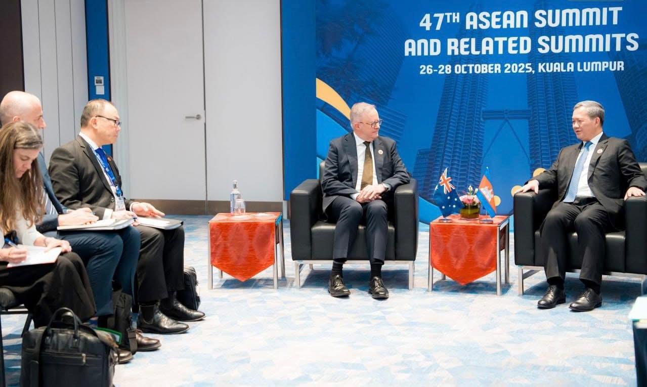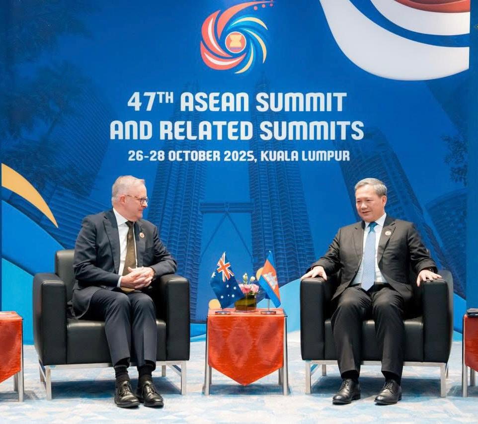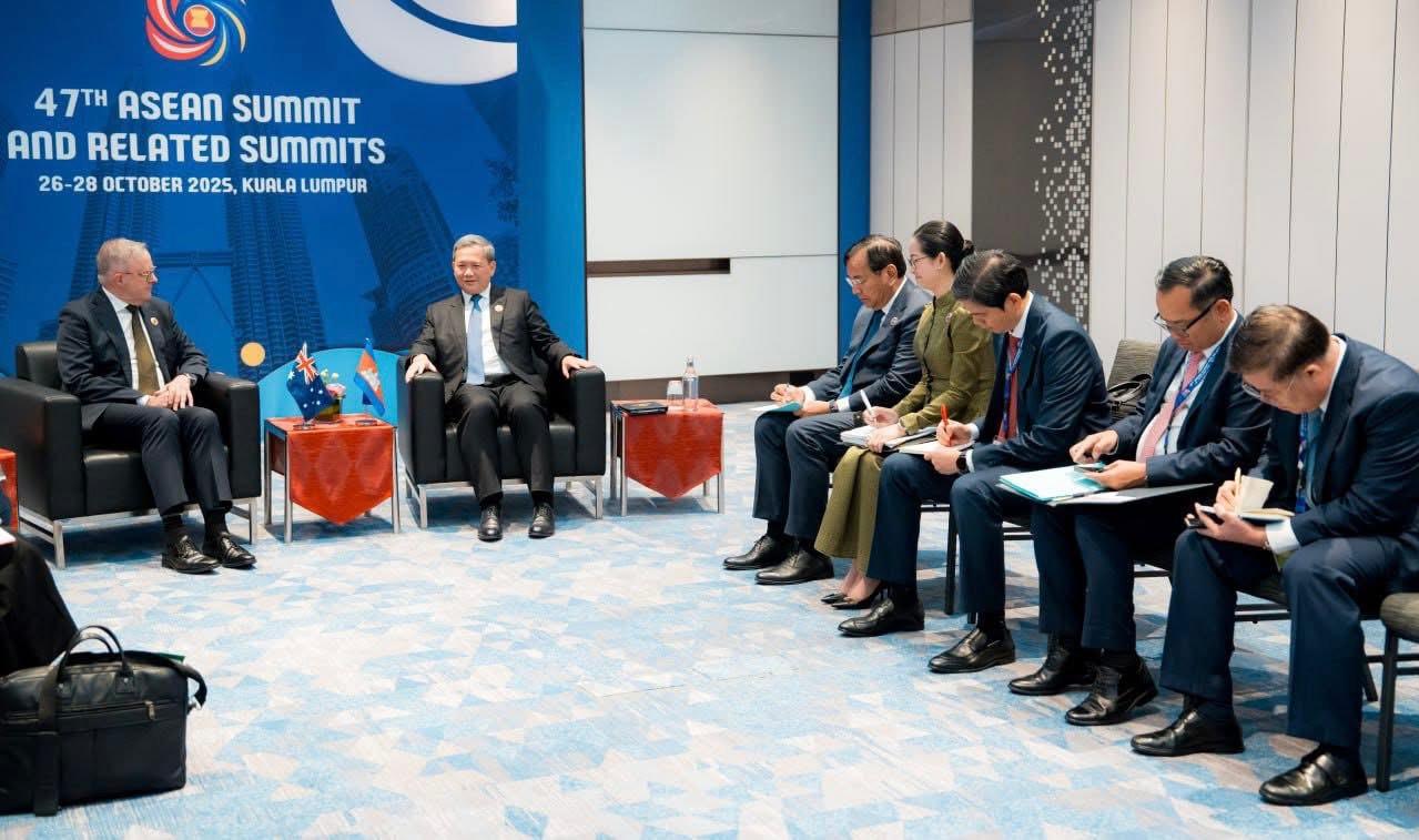 កម្ពុជា និងអូស្ត្រាលី ឯកភាពពង្រឹងនិងពង្រីកកិច្ចសហប្រតិបត្តិការថែមទៀតនារសៀល ថ្ងៃទី២៧ ខែតុលា ឆ្នាំ២០២៥, សម្តេចមហាបវរធិបតី ហ៊ុន ម៉ាណែត នាយករដ្ឋមន្រ្តី នៃព្រះរាជាណាចក្រកម្ពុជា និង ឯកឧត្តម Anthony Albanese នាយករដ្ឋមន្ត្រីអូស្ត្រាលី បានជួបពិភាក្សាការងារទ្វេភាគី ក្នុងឱកាសចូលរួមកិច្ចប្រជុំកំពូលអាស៊ាន លើកទី៤៧ និងកិច្ចប្រជុំកំពូលពាក់ព័ន្ធ នៅទីក្រុងគូឡាឡាំពួ ប្រទេសម៉ាឡេស៊ី នៅថ្ងៃទី២៦-២៨ ខែតុលា ឆ្នាំ២០២៥។ក្នុងឱកាសនៃជំនួប, សម្ដេចបវរធិបតីបានវាយតម្លៃខ្ពស់ចំពោះវឌ្ឍនភាពនៃទំនាក់ទំនង និងកិច្ចសហប្រតិបត្តិការដ៏ល្អប្រសើររវាងកម្ពុជា និងអូស្ត្រាលី បន្ទាប់ពីជំនួបទ្វេភាគីរវាង សម្ដេចបវរធិបតី និងឯកឧត្តម Anthony Albanese កាលពីខែមីនា ឆ្នាំ២០២៤ នៅទីក្រុងម៉ែលប៊ន ប្រទេសអូស្ត្រាលី។ សម្ដេចបវរធិបតីបានគូសបញ្ជាក់ថា ទំហំពាណិជ្ជកម្មរវាងប្រទេសទាំងពីរបានកើនឡើងដល់ជិត៦០០លានដុល្លារ ក្នុងឆ្នាំ២០២៤ និងបានអរគុណអូស្ត្រាលីដែលបានបង្កើនចំនួនអាហារូបករណ៍សម្រាប់និស្សិតកម្ពុជា តាមសំណើរបស់សម្តេចបវរធិបតី ពី ៥០កន្លែង ឡើងដល់ ៦២កន្លែង សម្រាប់ឆ្នាំ២០២៥។ សម្ដេចបវរធិបតីក៏បានកត់សម្គាល់វឌ្ឍនភាពនៃកិច្ចសហប្រតិបត្តិការ ក្នុងវិស័យការពារជាតិ និងសន្តិសុខ ដោយនាវាចម្បាំង HMAS Ballarat របស់កងទ័ពជើងទឹកអូស្ត្រាលី បានចូលសំចតនៅកំពង់ផែស្វយ័តក្រុងព្រះសីហនុ និងបានធ្វើទស្សនកិច្ចនៅមូលដ្ឋានសមុទ្ររាម នាថ្ងៃទី១០-១៥ ខែតុលា ឆ្នាំ២០២៥កន្លងទៅ។ ជាការឆ្លើយតប, ឯកឧត្តមនាយករដ្ឋមន្ត្រីអូស្ត្រាលី បានឯកភាពចំពោះការវាយតម្លៃរបស់សម្ដេចបវរធិបតី ចំពោះទំនាក់ទំនង និងកិច្ចសហប្រតិបត្តិការរវាងប្រទេសទាំងពីរ នៅក្នុងវិស័យពាណិជ្ជកម្ម និងសេដ្ឋកិច្ច, សន្តិសុខ និងការពារជាតិ ព្រមទាំងការផ្លាស់ប្ដូរប្រជាជននិងប្រជាជន។ ជាមួយគ្នានេះ, ឯកឧត្តមនាយករដ្ឋមន្ត្រីអូស្ត្រាលីបានរំលឹកអំពីដំណើរទស្សនកិច្ចរបស់រូបឯកឧត្តមនៅកម្ពុជាចំនួន ៣លើកកន្លងមក និងបានកត់សម្គាល់អំពីសក្កានុពលរបស់កម្ពុជាក្នុងវិស័យទេសចរណ៍ផងដែរ។ ឯកឧត្តមនាយករដ្ឋមន្ត្រីអូស្ត្រាលី ក៏បានវាយតម្លៃខ្ពស់ចំពោះកិច្ចប្រឹងប្រែងរបស់កម្ពុជាក្នុងការប្រយុទ្ធប្រឆាំងឧក្រិដ្ឋកម្មសាយប័រ និងការឆបោកតាមប្រព័ន្ធបច្ចេកវិទ្យា ដោយឯកឧត្តមនាយករដ្ឋមន្ត្រីអូស្ត្រាលីបានចាត់ទុកបញ្ហាទាំងនេះជាបញ្ហាប្រឈមរបស់ប្រទេសទាំងអស់។ ឯកឧត្តមនាយករដ្ឋមន្ត្រីអូស្ត្រាលី ក៏បានស្វាគមន៍ការវិវត្តជាវិជ្ជមានចំពោះដំណោះស្រាយនៃជម្លោះព្រំដែនរវាងប្រទេសកម្ពុជានិងថៃ និងបានវាយតម្លៃខ្ពស់អំពីភាពជាអ្នកដឹកនាំរបស់សម្ដេចបវរធិបតី ក្នុងដំណើរការរកដំណោះស្រាយនេះ។ថ្នាក់ដឹកនាំទាំងពីរក៏បានឯកភាពបន្តពង