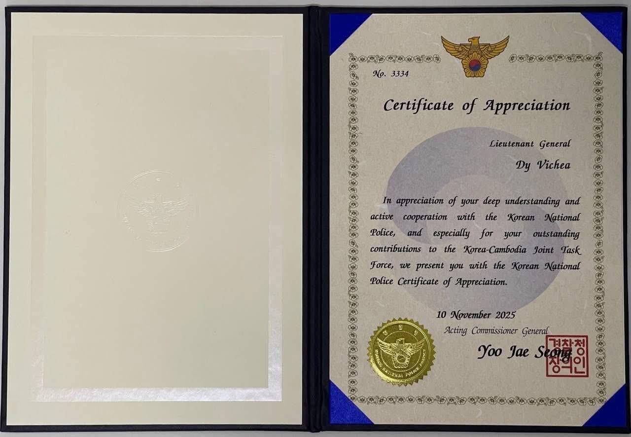 អគ្គស្នងការនគរបាលជាតិកូរ៉េ បានជូនលិខិតសរសើរដល់ឯកឧត្តម ឧត្តមសេនីយ៍ឯក ឌី វិជ្ជា អគ្គស្នងការរងនគរបាលជាតិកម្ពុជា និងជាប្រធាននាយកដ្ឋានកណ្តាលសន្តិសុខ ចំពោះកិច្ចសហប្រតិបត្តិការយ៉ាងសកម្មរបស់ឯកឧត្តមជាមួយនគរបាលជាតិកូរ៉េ ជាពិសេស ចំពោះការរួមចំណែកដ៏ឆ្នើមរបស់ឯកឧត្តមនៅក្នុងក្រុមការងាររួមកូរ៉េ-កម្ពុជា (Cambodia-Korea-Cambodia Joint Task Force)។