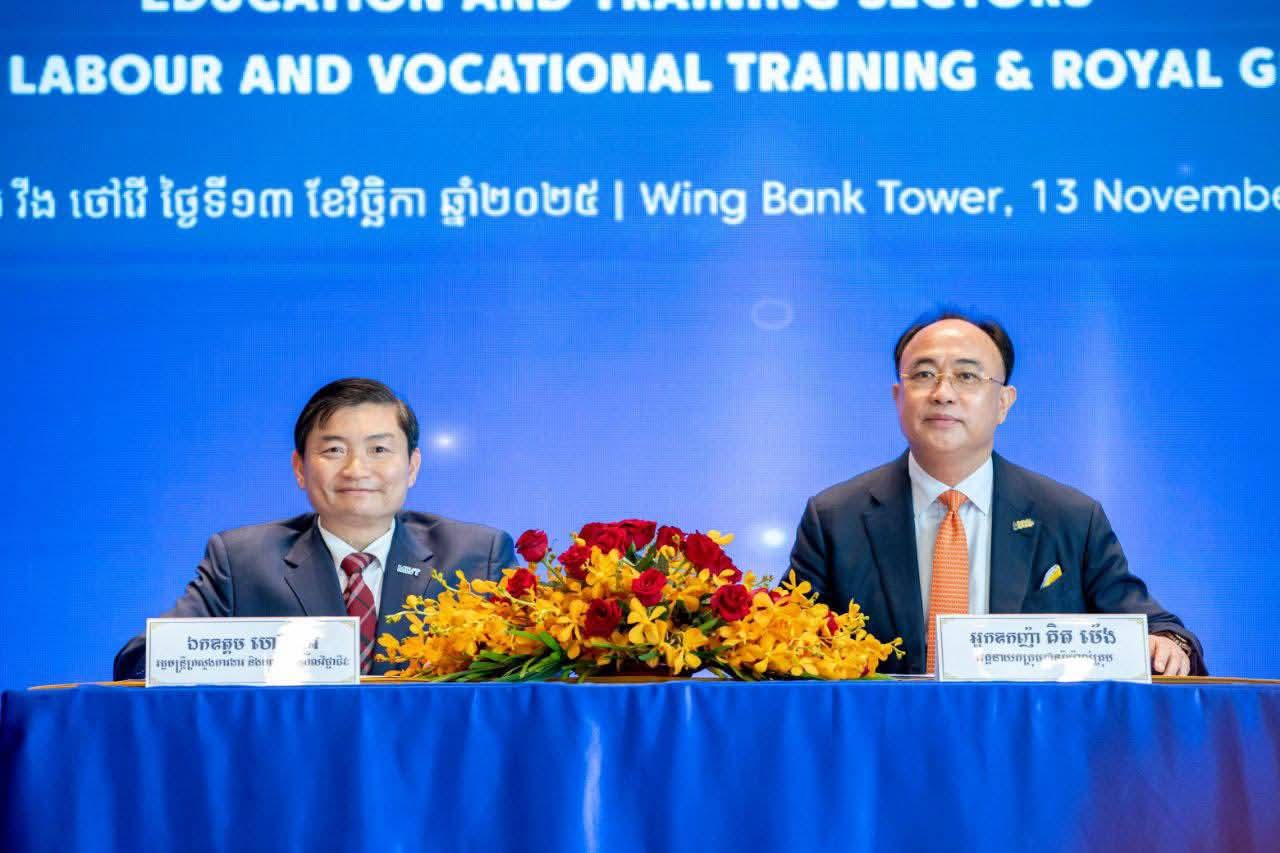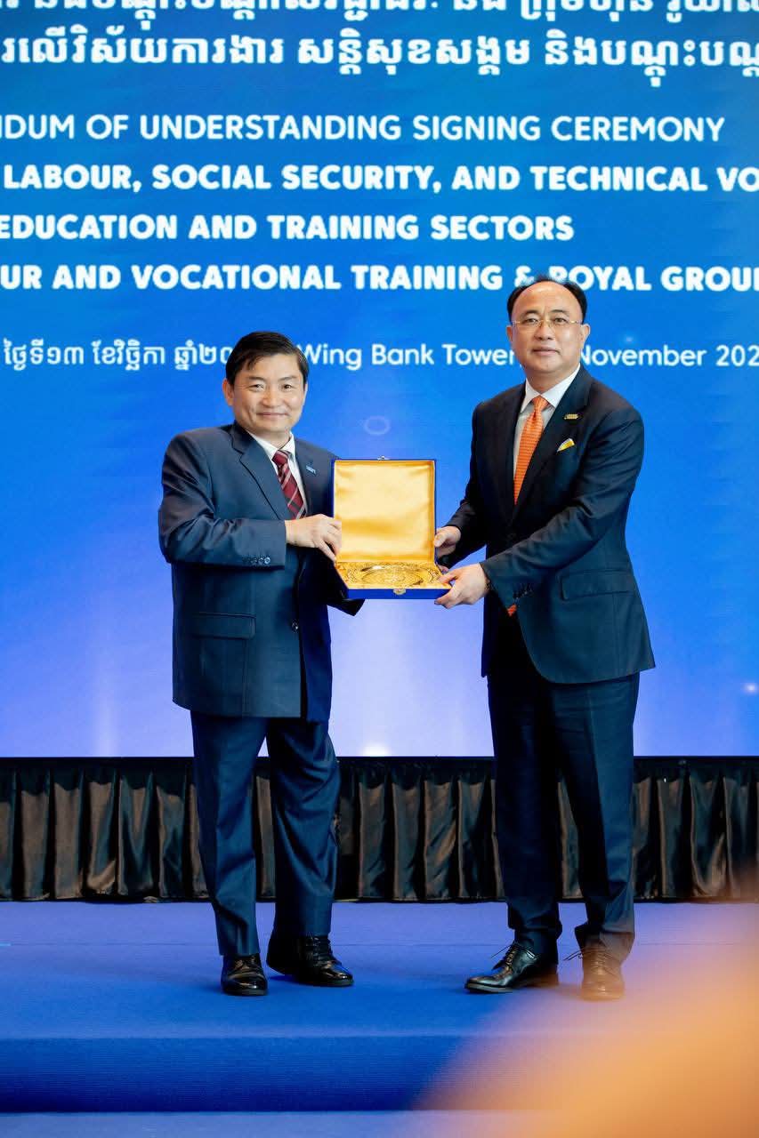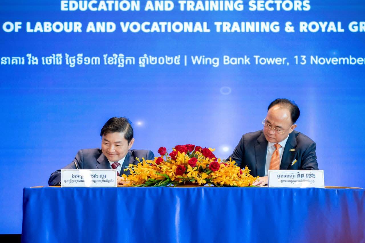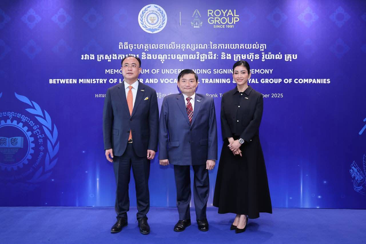 ក្រសួងការងារ និងបណ្ដុះបណ្ដាលវិជ្ជាជីវៈ និងក្រុមហ៊ុន រ៉ូយ៉ាល់គ្រុប ពង្រីកកិច្ចសហប្រតិបត្តិការលើវិស័យការងារ សន្តិសុខសង្គម និងបណ្តុះបណ្តាលវិជ្ជាជីវៈ(ភ្នំពេញ)៖នៅថ្ងៃទី១៣ ខែវិច្ឆិកា ឆ្នាំ២០២៥ ឯកឧត្តម ហេង សួរ រដ្ឋមន្ត្រីក្រសួងការងារ និងបណ្ដុះបណ្ដាលវិជ្ជាជីវៈ និងអ្នកឧកញ៉ា គិត ម៉េង ប្រធានក្រុមប្រឹក្សាភិបាល និងជាអគ្គនាយកប្រតិបត្តិក្រុមហ៊ុន រ៉ូយ៉ាល់គ្រុប បានអញ្ជើញជាអធិបតីដ៏ខ្ពង់ខ្ពស់ និងជាហត្ថលេខីក្នុងពិធីចុះអនុស្សរណៈនៃការយោគយល់គ្នាស្តីពីកិច្ចសហប្រតិបត្តិការលើវិស័យការងារ សន្តិសុខសង្គម និងបណ្តុះបណ្តាលវិជ្ជាជីវៈ អមដោយវត្តមានចូលរួមលោកជំទាវអ្នកឧកញ៉ា ម៉ៅ ចំណាន គិត ម៉េង អនុប្រធានក្រុមប្រឹក្សាភិបាលក្រុមហ៊ុន រ៉ូយ៉ាល់គ្រុប និងជាប្រធានសមាគមសិល្ប:ករខ្មែរ នៅអគារវីងថៅវើ ដើម្បីបង្កើតភាពជាដៃគូរវាងរដ្ឋ និងឯកជន ដែលផ្ដោតលើការពង្រឹងការអភិវឌ្ឍកម្លាំងពលកម្មនៅកម្ពុជា លើកកម្ពស់ឱកាសការងារ លើកកម្ពស់បរិយាបន្នហិរញ្ញវត្ថុ និងការទូទាត់ប្រាក់តាមប្រព័ន្ធឌីជីថល និងជំរុញកិច្ចសហការយ៉ាងមានប្រសិទ្ធភាពរវាងភាគីទាំងពីរ។ ថ្លែងក្នុងពិធីនេះ អ្នកឧកញ៉ា គិត ម៉េង បានលើកឡើងពីកត្តាសុខសន្តិភាព បានផ្ដល់ឱកាសឱ្យក្រុមហ៊ុនរ៉ូយ៉ាល់គ្រុប មានលទ្ធភាពក្នុងការអភិវឌ្ឍរីកចម្រើនទាំងការកសាងធនធានមនុស្ស ដែលជាកត្តាសំខាន់មិនអាចខ្វះបាន ដើម្បីធានាបានថា កម្លាំងពលកម្មអាចឆ្លើយតបទៅនឹងបម្រែបម្រួលយ៉ាងឆាប់រហ័សនៃបច្ចេកវិទ្យា ដែលរហូតមកបច្ចុប្បន្នក្រុមហ៊ុនរ៉ូយ៉ាល់គ្រុប មានបុត្រសម្ព័ន្ធលើវិស័យជាច្រើនចំនួន២២ ក្រុមហ៊ុន។ អ្នកឧកញ៉ា ក៏បានបង្ហាញពីក្តីរីករាយដោយបានចូលរួមចំណែកជាមួយរាជរដ្ឋាភិបាល ជាពិសេសក្រសួងការងារ និងបណ្តុះបណ្តាលវិជ្ជាជីវ: ក្នុងការអភិវឌ្ឍប្រទេសជាតិឱ្យរីកចម្រើន រួមទាំងសកម្មភាពជួយការងារសង្គម និងការងារមនុស្សធម៌ជាច្រើន ដើម្បីជួយដល់កម្មករនិយោជិត និងប្រជាជនកម្ពុជា។ នាក្នុងឱកាសនោះដែរ ឯកឧត្តម ហេង សួរ បានថ្លែងការកោតសរសើរ និងវាយតម្លៃខ្ពស់ចំពោះការវិវត្តរីកចម្រើនឥតឈប់ឈររបស់ក្រុមហ៊ុន រ៉ូយ៉ាល់គ្រុប ក្រោមការដឹកនាំរបស់អ្នកឧកញ៉ា ដែលជាក្រុមហ៊ុនវិនិយោគជនជាតិខ្មែរដ៏ធំជាងគេមួយចាប់ផ្តើមដំបូងនៅកម្ពុជា រហូតបង្កើតបានក្រុមហ៊ុនបុត្រសម្ព័ន្ធជាច្រើន និងបានផ្តល់ឱកាសការងារជាច្រើនជូនដល់ប្រជាពលរដ្ឋកម្ពុជា និងបានចូលរួមទាក់ទាញវិនិយោគទុនថ្មីៗជាច្រើនមកកម្ពុជាជាបន្តបន្ទាប់ ហើយក៏មានការនាំមកនូវបច្ចេកវិទ្យាថ្មីៗសម្រាប់ចូលរួមចំណែកអភិវឌ្ឍប្រទេសជាតិ។ ឯកឧត្តមរដ្ឋមន្រ្តី ក៏បានសង្កត់ធ្ងន់លើសារ:សំខាន់ ការរក្សាបាននូវសន្តិភាព គឺជាការរក្សាបាននូវក្តីសង