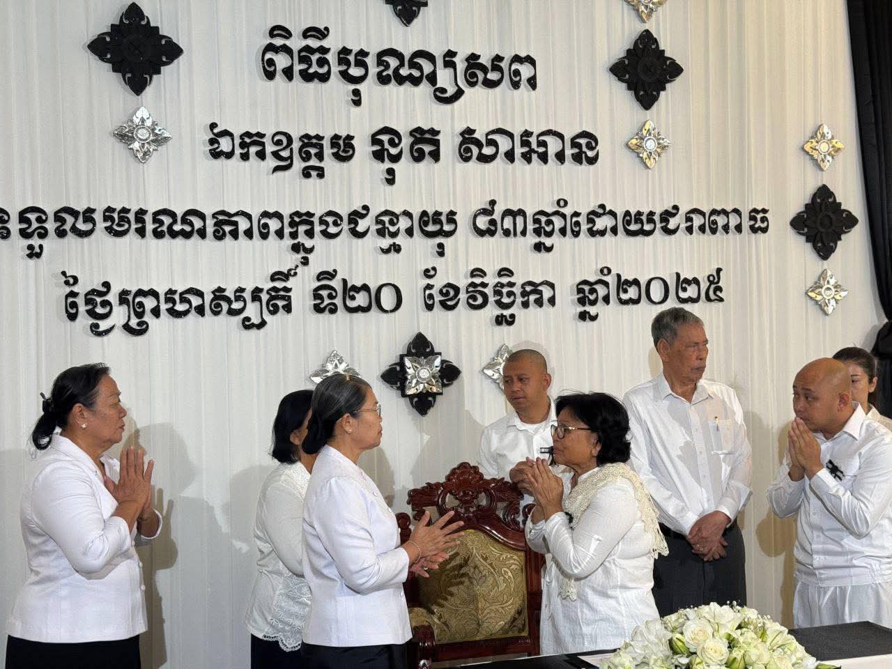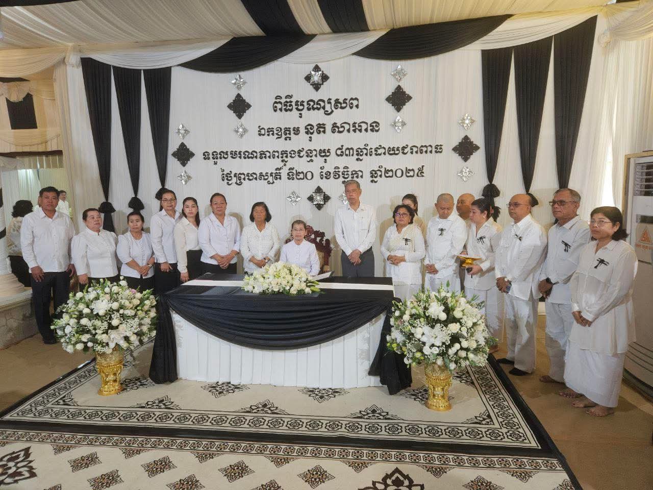 សម្តេច ម៉ែន សំអន អញ្ជើញចូលរួមគោរពវិញ្ញាណក្ខន្ធ ឯកឧត្តម នុត សាអាន==================សម្តេចកិត្តិសង្គហបណ្ឌិត ម៉ែន សំអន ឧត្តមប្រឹក្សាផ្ទាល់ព្រះមហាក្សត្រ និងជាប្រធានក្រុមប្រឹក្សាជាតិរណសិរ្សសាមគ្គី អភិវឌ្ឍន៍មាតុភូមិកម្ពុជា បានអញ្ជើញគោរពវិញ្ញាណក្ខន្ធ ឯកឧត្តម នុត សាអាន នាព្រឹកថ្ងៃសុក្រ ១កើត ខែមិគសិរ ឆ្នាំម្សាញ់ សប្តស័ក ព.ស. ២៥៦៩ ត្រូវនឹង ថ្ងៃទី២១ ខែវិច្ឆិកា ឆ្នាំ២០២៥ នៅគេហដ្ឋានផ្ទះលេខ២៦១ ផ្លូវត្រឡក់ផ្អែម សង្កាត់ទន្លេបាសាក់ ខណ្ឌចំការមន រាជធានីភ្នំពេញ។គួររំលឹកផងថា ឯកឧត្តម នុត សាអាន ប្រធានគណៈកម្មាធិការជាតិប្រឆាំងទារុណកម្ម អំពើឃោរឃៅ អំពើអមនុស្សធម៌ អំពើធ្វើទុក្ខបុកម្នេញ ឬទណ្ឌកម្ម និងជាសមាជិកក្រុមប្រឹក្សាជាតិរណសិរ្សសាមគ្គី អភិវឌ្ឍន៍មាតុភូមិកម្ពុជា បានទទួលមរណភាពកាលពីថ្ងៃព្រហស្បតិ៍ ១៥រោច ខែកត្តិក ឆ្នាំម្សាញ់ សប្តស័ក ព.ស.២៥៦៩ ត្រូវនឹងថ្ងៃទី២០ ខែវិច្ឆិកា ឆ្នាំ២០២៥ វេលាម៉ោង ១១:៣០នាទីថ្ងៃត្រង់ ក្នុងជន្មាយុ ៨៣ឆ្នាំ ដោយជរាពាធ ។នៅក្នុងសមានទុក្ខដ៏ក្រៀមក្រំនេះ សម្តេចកិត្តិសង្គហបណ្ឌិតក៏បានចូលរួមរំលែកទុក្ខជាមួយ លោកជំទាវ ទិត្យ ខាំដារ៉ា ព្រមទាំងក្រុមគ្រួសារ និងបានបួងសួង ដល់តេជៈបារមីនៃព្រះពុទ្ធ ព្រះធម៌ ព្រះសង្ឃ តាមជួយថែរក្សាដួងវិញ្ញាណក្ខន្ធរបស់ ឯកឧត្តម នុត សាអាន បានទៅសោយសុខក្នុងឋានសុគតិភពកុំបីឃ្លៀងឃ្លាតឡើយ៕