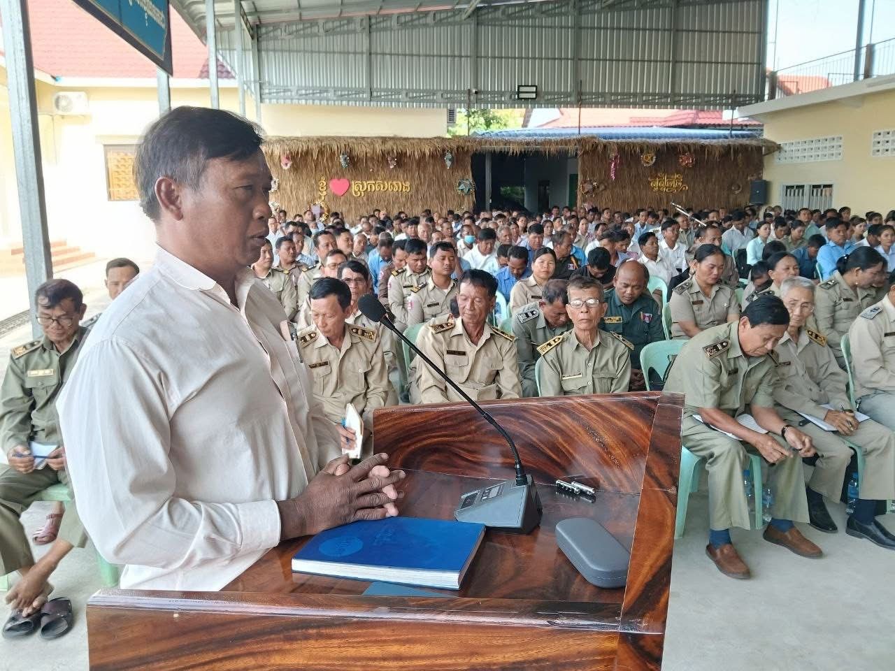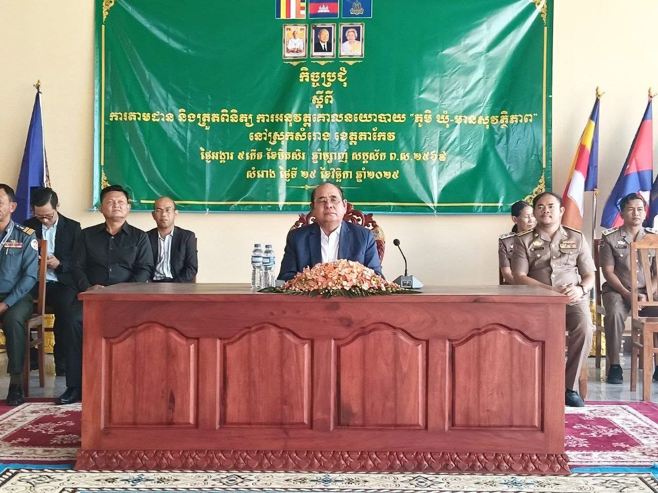 ឯកឧត្តមបណ្ឌិត ម៉ក់ ជីតូ រដ្ឋលេខាធិការក្រសួងមហាផ្ទៃ អញ្ជើញជាអធិបតីដឹកនាំកិច្ចប្រជុំតាមដាន និងត្រួតពិនិត្យ ការអនុវត្តគោលនយោបាយ ភូមិ ឃុំ សង្កាត់ មានសុវត្ថិភាព តាមបណ្តាស្រុក ក្នុងក្របខណ្ឌក្រសួងមហាផ្ទៃ នៅសាលាស្រុកសំរោង ខេត្តតាកែវ ==================នៅរសៀលថ្ងៃអង្គារ ៥កើត ខែមិគសិរ ឆ្នាំម្សាញ់ សប្តស័ក ពុទ្ធសករាជ ២៥៦៩ ត្រូវនឹងថ្ងៃទី២៥ ខែវិច្ឆិកា ឆ្នាំ២០២៥ ឯកឧត្តមបណ្ឌិត ម៉ក់ ជីតូ រដ្ឋលេខាធិការក្រសួងមហាផ្ទៃ បានអញ្ជើញជាអធិបតីដឹកនាំកិច្ចប្រជុំតាមដាន និងត្រួតពិនិត្យ ការអនុវត្តគោលនយោបាយ «ភូមិ ឃុំ សង្កាត់ មានសុវត្ថិភាព » តាមបណ្តាស្រុក ក្នុងក្របខណ្ឌក្រសួងមហាផ្ទៃ នៅសាលាស្រុកសំរោង ខេត្តតាកែវ៕ ដោយមានការចូលរួមពីតំណាងឯកឧត្តម អភិបាលខេត្ត ស្នងការនគរបាលខេត្ត មេបញ្ជាការកងរាជអាវុធហត្ថខេត្ត ក្រុមប្រឹក្សាស្រុក កងកម្លាំងទាំង៣របស់ស្រុក មេឃុំ មេភូមិ យុវជន និងស្ត្រី ប្រជាការពារ ជនបង្គោល អាចារ្យវត្ត នាយកសាលា សរុបប្រមាណ៣២០នាក់ ។