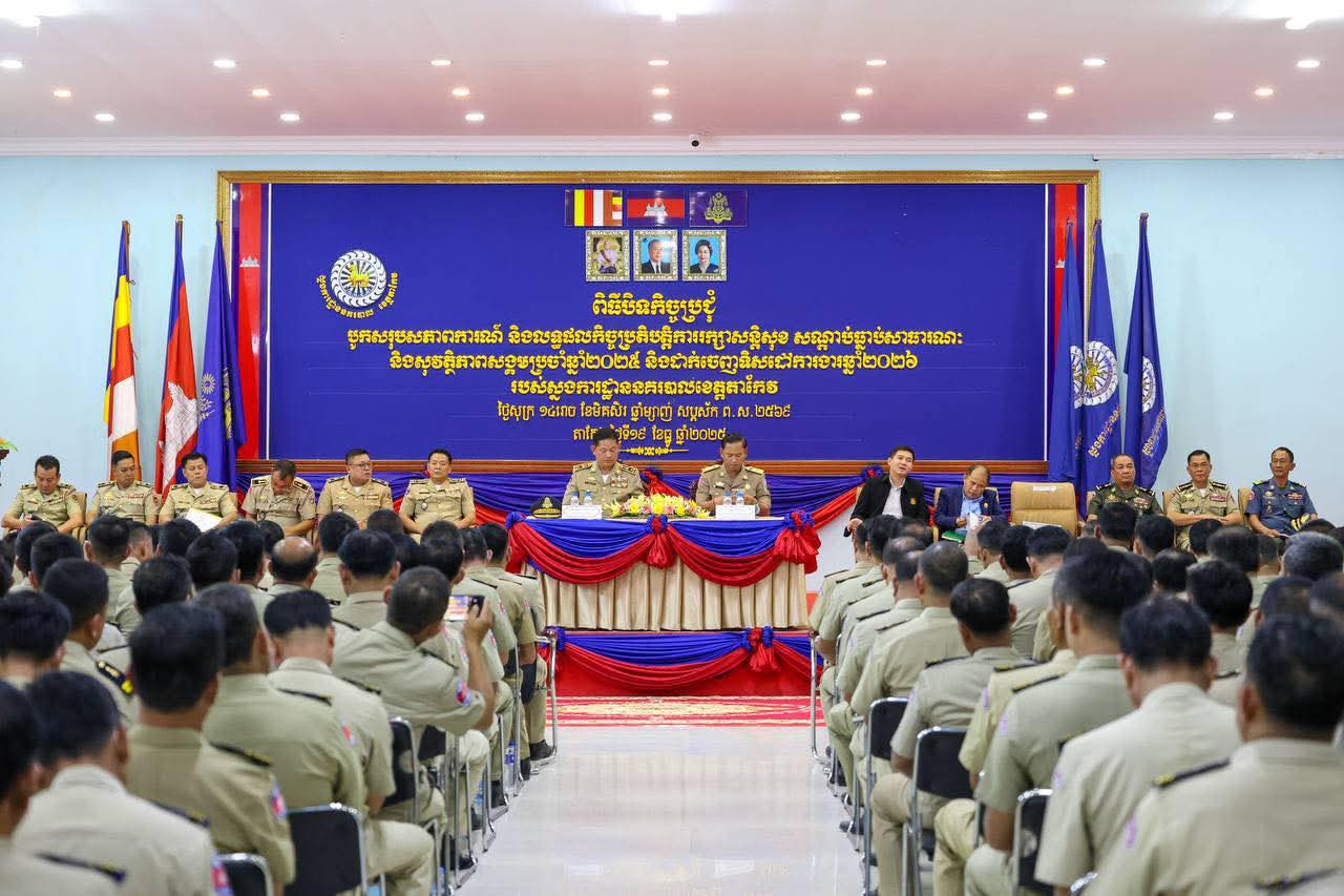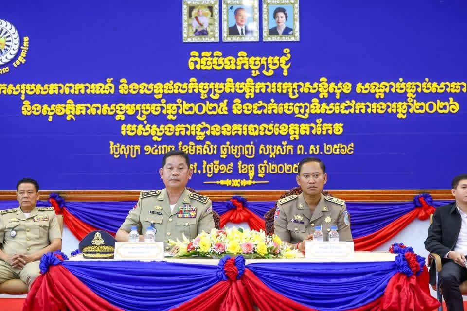 អភិបាលខេត្តតាកែវ អញ្ជើញជាអធិបតីក្នុងពិធីបិទកិច្ចប្រជុំបូកសរុបសភាពការណ៍និងលទ្ធផលកិច្ចប្រតិបត្តិការរក្សាសន្តិសុខសណ្តាប់ធ្នាប់សាធារណៈប្រចាំឆ្នាំ២០២៥ និងទិសដៅការងារឆ្នាំ២០២៦ របស់ស្នងការដ្ឋាននគរបាលខេត្តតាកែវ================នារសៀលថ្ងៃសុក្រ ១៤រោច ខែមិគសិរ ឆ្នាំម្សាញ់ សប្តស័ក ពុទ្ធសករាជ ២៥៦៩ ត្រូវនឹងថ្ងៃទី១៩ ខែធ្នូ ឆ្នាំ២០២៥ ឯកឧត្តម វ៉ី សំណាង អភិបាល នៃគណៈអភិបាលខេត្តតាកែវ និង ឯកឧត្តម ឧត្តមសេនីយ៍ឯក ចេវ ហាក់ អគ្គស្នងការរងនគរបាលជាតិ តំណាងដ៏ខ្ពង់ខ្ពស់ ឯកឧត្តម នាយឧត្តមសេនីយ៍ ស ថេត អគ្គស្នងការនគរបាលជាតិ បានអញ្ជើញជាអធិបតីក្នុងពិធីបិទកិច្ចប្រជុំបូកសរុបសភាពការណ៍ និងលទ្ធផលកិច្ចប្រតិបត្តិការរក្សាសន្តិសុខសណ្តាប់ធ្នាប់សាធារណៈ និងសុវត្តិភាពសង្គមប្រចាំឆ្នាំ២០២៥ និងដាក់ចេញទិសដៅការងារឆ្នាំ២០២៦ របស់ស្នងការដ្ឋាននគរបាលខេត្តតាកែវ។