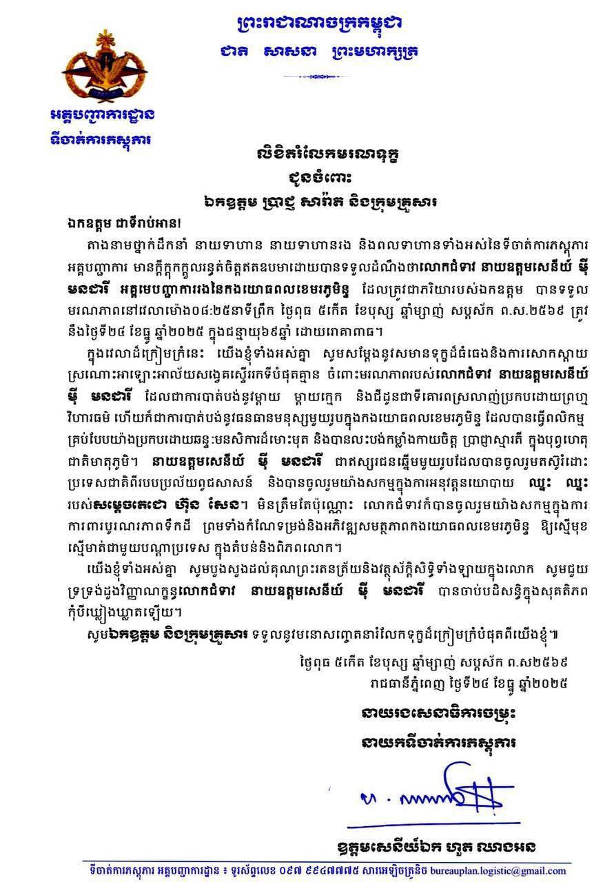 ឯកឧត្ដម ឧត្ដមសេនីយ៍ឯក ហួត ឈាងអន ផ្ញើសាររំលែកទុក្ខជូនឯកឧត្ដម ប្រាជ្ញ សារ៉ាត និងក្រុមគ្រួសារ ចំពោះមរណភាព លោកជំទាវ នាយឧត្ដមសេនីយ៍ ម៉ី មនដារី(ភ្នំពេញ)៖ ឯកឧត្ដម ឧត្ដមសេនីយ៍ឯក ហួត ឈាងអន នាយរងសេនាធិការចម្រុះ និងជានាយកទីចាត់ការភស្តុភារ អគ្គបញ្ជាការ ព្រមទាំងនាយទាហាន នាយទាហានរង និងពលទាហានទាំងអស់ ផ្ញើសាររំលែកទុក្ខជូន ឯកឧត្ដម ប្រាជ្ញ សារ៉ាត ចំពោះមរណភាពលោកជំទាវ នាយឧត្ដមសេនីយ៍ ម៉ី មនដារី អគ្គមេបញ្ជាការរងនៃកងយោធពលខេមរភូមិន្ទ ដែលត្រូវជាភរិយារបស់ឯកឧត្ដម បានទទួលមរណភាពនៅវេលាម៉ោង ៨:២៥នាទីព្រឹក ថ្ងៃពុធ ៥កើត ខែបុស្ស ឆ្នាំម្សាញ់ សប្តស័ក ពុទ្ធសករាជ ២៥៦៩ ត្រូវនឹងថ្ងៃទី២៤ ខែធ្នូ ឆ្នាំ២០២៥ ដោយរោគាពាធ ក្នុងជន្មាយុ ៦៩ឆ្នាំ។ក្នុងវេលាដ៏ក្រៀមក្រំនេះ យើងខ្ញុំទាំងអស់គ្នា សូមសម្តែងនូវសមានទុក្ខដ៏ធំធេង និងការសោកស្តាយស្រណោះអាឡោះអាល័យ សង្វេគស្ទើររកទីបំផុតគ្មាន ចំពោះមរណភាពរបស់លោកជំទាវ នាយឧត្ដមសេនីយ៍ ម៉ី មនដារី អគ្គមេបញ្ជាការរងនៃកងយោធពលខេមរភូមិន្ទ ដែលជាការបាត់បង់នូវម្ដាយ ម្ដាយក្មេក និងជីដូនជាទីគោរពស្រលាញ់ប្រកបដោយព្រហ្មវិហារធម៌ ហើយក៏ជា ការបាត់បង់នូវធនធានមនុស្សមួយរូប ក្នុងកងយោធពលខេមរភូមិន្ទ ដែលបានធ្វើពលិកម្មគ្រប់បែបយ៉ាងប្រកបដោយឆន្ទៈ មនសិការដ៏មោះមុត និងបានលះបង់កម្លាំងកាយចិត្ត ប្រាជ្ញាស្មារតី ក្នុងបុព្វហេតុជាតិមាតុភូមិ។ នាយឧត្តមសេនីយ៍ ម៉ី មនដារី ជាឥស្សរជនឆ្នើមមួយរូបដែលបានចូលរួមតស៊ូរំដោះប្រទេសជាតិពីរបបប្រល័យពូជសាសន៍ និងបានចូលរួមយ៉ាងសកម្មក្នុងការអនុវត្តនយោបាយ ឈ្នះ ឈ្នះ របស់សម្ដេចតេជោ ហ៊ុន សែន។ មិនត្រឹមតែប៉ុណ្ណោះ លោកជំទាវក៏បានចូលរួមយ៉ាងសកម្មក្នុងការការពារបូរណរភាពទឹកដី ព្រមទាំងកំណែទម្រង់និងអភិវឌ្ឍសមត្ថភាពកងយោធពលខេមរភូមិន្ទ ឱ្យស្មើមុខស្មើមាត់ជាមួយបណ្ដាប្រទេស ក្នុងតំបន់និងពិភពលោក។យើងខ្ញុំទាំងអស់គ្នា សូមបួងសួងដល់គុណព្រះរតនត្រ័យនិងវត្ថុស័ក្តិសិទ្ធិទាំងឡាយក្នុងលោក សូមជួយទ្រទ្រង់ដួងវិញ្ញាណក្ខន្ធលោកជំទាវ នាយឧត្ដមសេនីយ៍ ម៉ី មនដារី បានចាប់បដិសន្ធិក្នុងសុគតិភពកុំបីឃ្លៀងឃ្លាតឡើយ៕