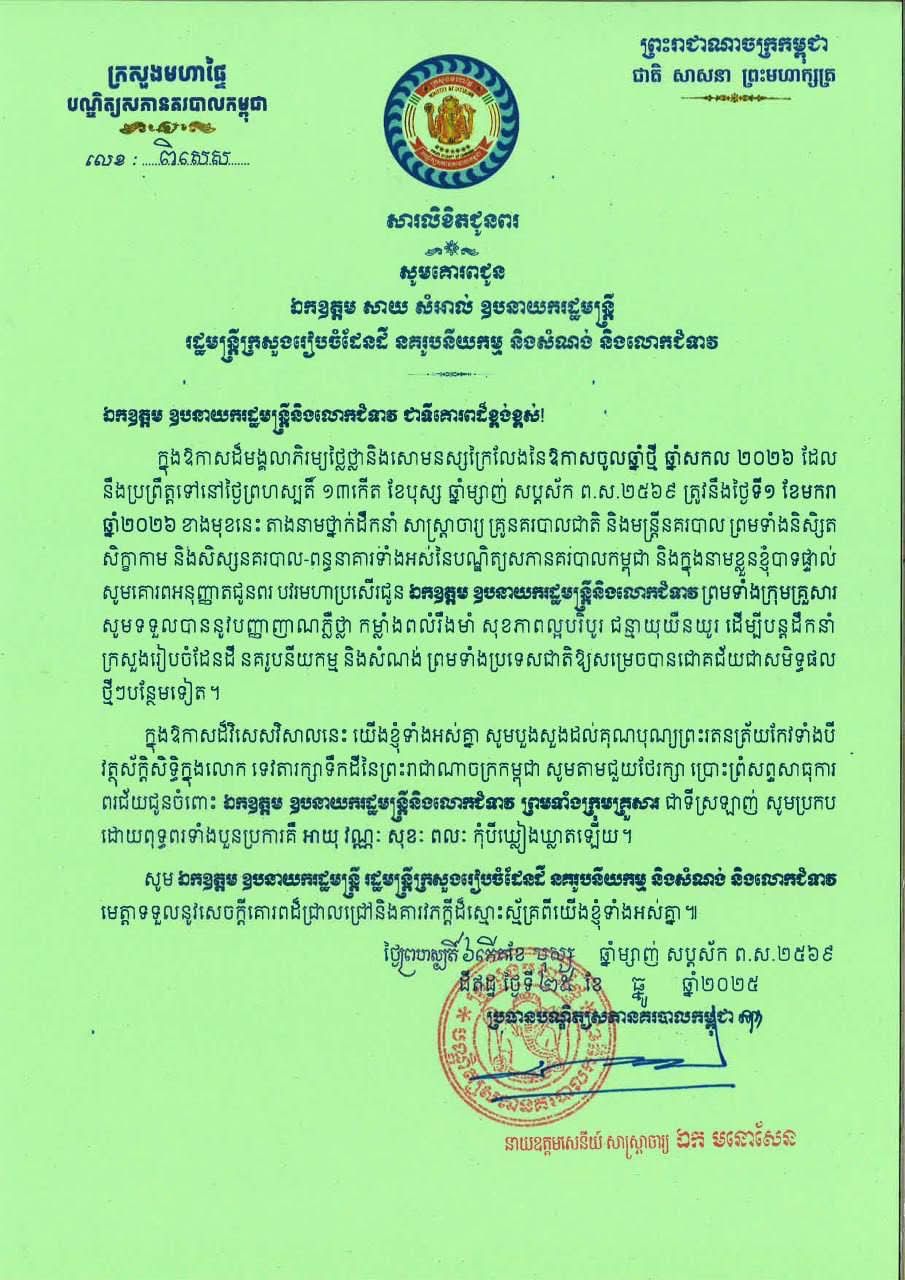 ឯកឧត្ដមនាយឧត្ដមសេនីយ៍ សាស្ដ្រាចារ្យ ឯក មនោសែន ប្រធានបណ្ឌិត្យសភានគរបាលកម្ពុជា និងថ្នាក់ដឹកនាំ សាស្ដ្រាចារ្យ មន្ដ្រី ព្រមទាំងនិស្សិត សិក្ខាកាម និងសិស្សនគរបាល-ពន្ធនាគារទាំងអស់ នៃបណ្ឌិត្យសភានគរបាលកម្ពុជា បានផ្ញើសារលិខិតគោរពជូនពរ ឯកឧត្តម សាយ សំអាល់ ឧបនាយករដ្ឋមន្រ្តី រដ្ឋមន្ត្រីក្រសួងរៀបចំដែនដី នគរូបនីយកម្ម និងសំណង់ និងលោកជំទាវ ក្នុងឱកាសចូលឆ្នាំថ្មី ឆ្នាំសកល ២០២៦។