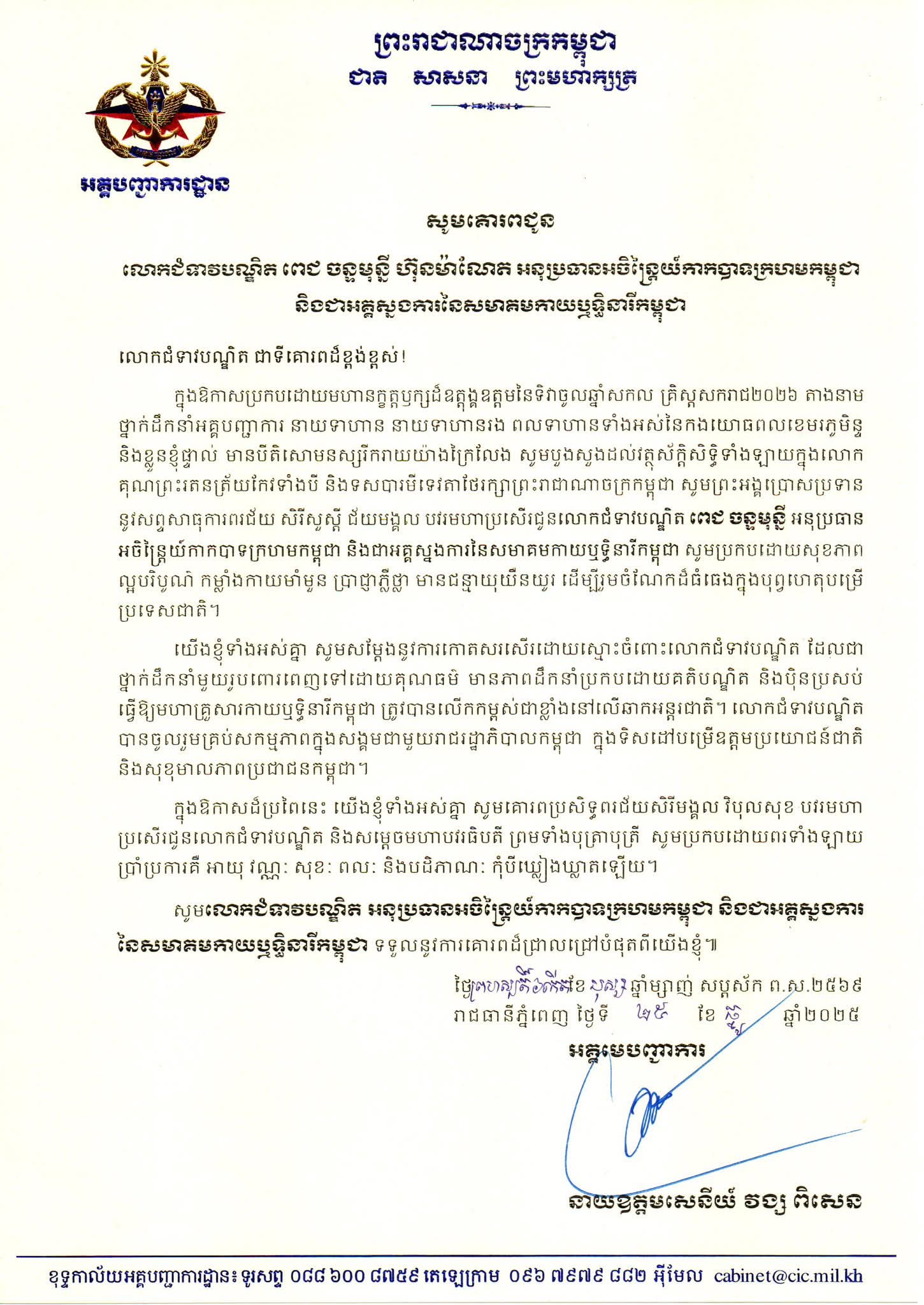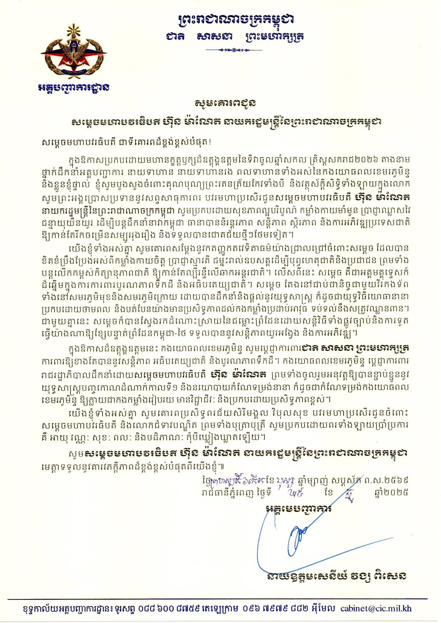 ឯកឧត្ដម នាយឧត្ដមសេនីយ៍ វង្ស ពិសេន អគ្គមេបញ្ជាការនៃកងយោធពលខេមរភូមិន្ទ ព្រមទាំងនាយទាហាន នាយទាហានរង និងពលទាហានទាំងអស់នៃកងយោធពលខេមរភូមិន្ទ បានផ្ញើសារលិខិតគោរពជូនពរ សម្តេចមហាបវរធិបតី ហ៊ុន ម៉ាណែត នាយករដ្ឋមន្រ្តីនៃព្រះរាជាណាចក្រកម្ពុជា និងលោកជំទាវបណ្ឌិត ពេជ ច័ន្ទមុន្នី ហ៊ុនម៉ាណែត ក្នុងឱកាសចូលឆ្នាំថ្មី ឆ្នាំសកល គ.ស.២០២៦។