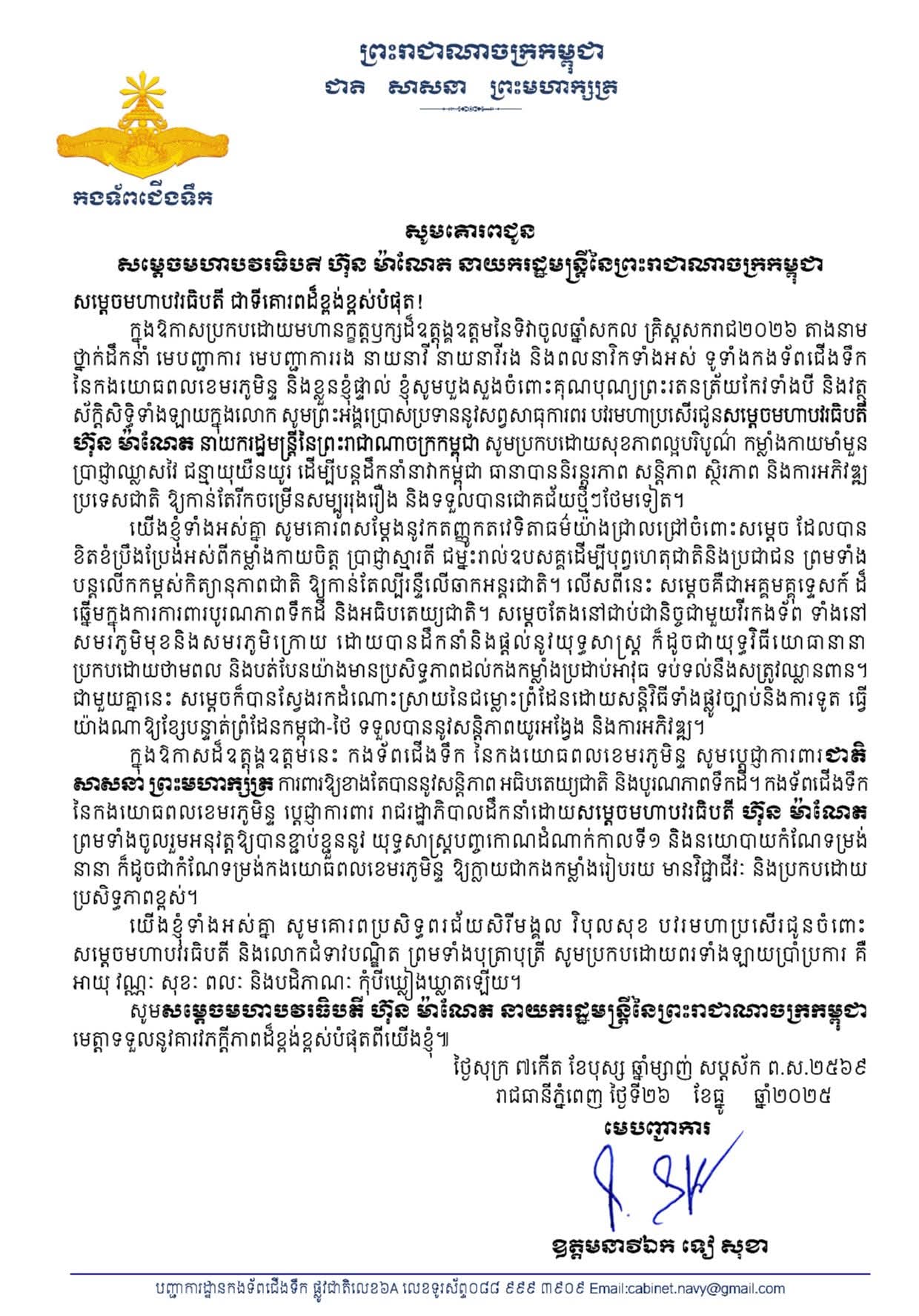 ឯកឧត្ដម ឧត្តមនាវីឯក ទៀ សុខា មេបញ្ជាការកងទ័ពជើងទឹក អនុប្រធានប្រចាំការ និងជាអគ្គលេខាធិការ នៃគណៈកម្មាធិការជាតិសន្តិសុខលម្ហសមុទ្រ ព្រមទាំងនាយនាវី នាយនាវីរង និងពលនាវិកទាំងអស់ ទូទាំងកងទ័ពជើងទឹក នៃកងយោធពលខេមរភូមិន្ទ បានផ្ញើសារលិខិតគោរពជូនពរ សម្តេចមហាបវរធិបតី ហ៊ុន ម៉ាណែត នាយករដ្ឋមន្រ្តី នៃព្រះរាជាណាចក្រកម្ពុជា និងលោកជំទាវបណ្ឌិត ពេជ ច័ន្ទមុន្នី ហ៊ុន ម៉ាណែត ក្នុងឱកាសចូលឆ្នាំថ្មី ឆ្នាំសកល គ.ស.២០២៦។