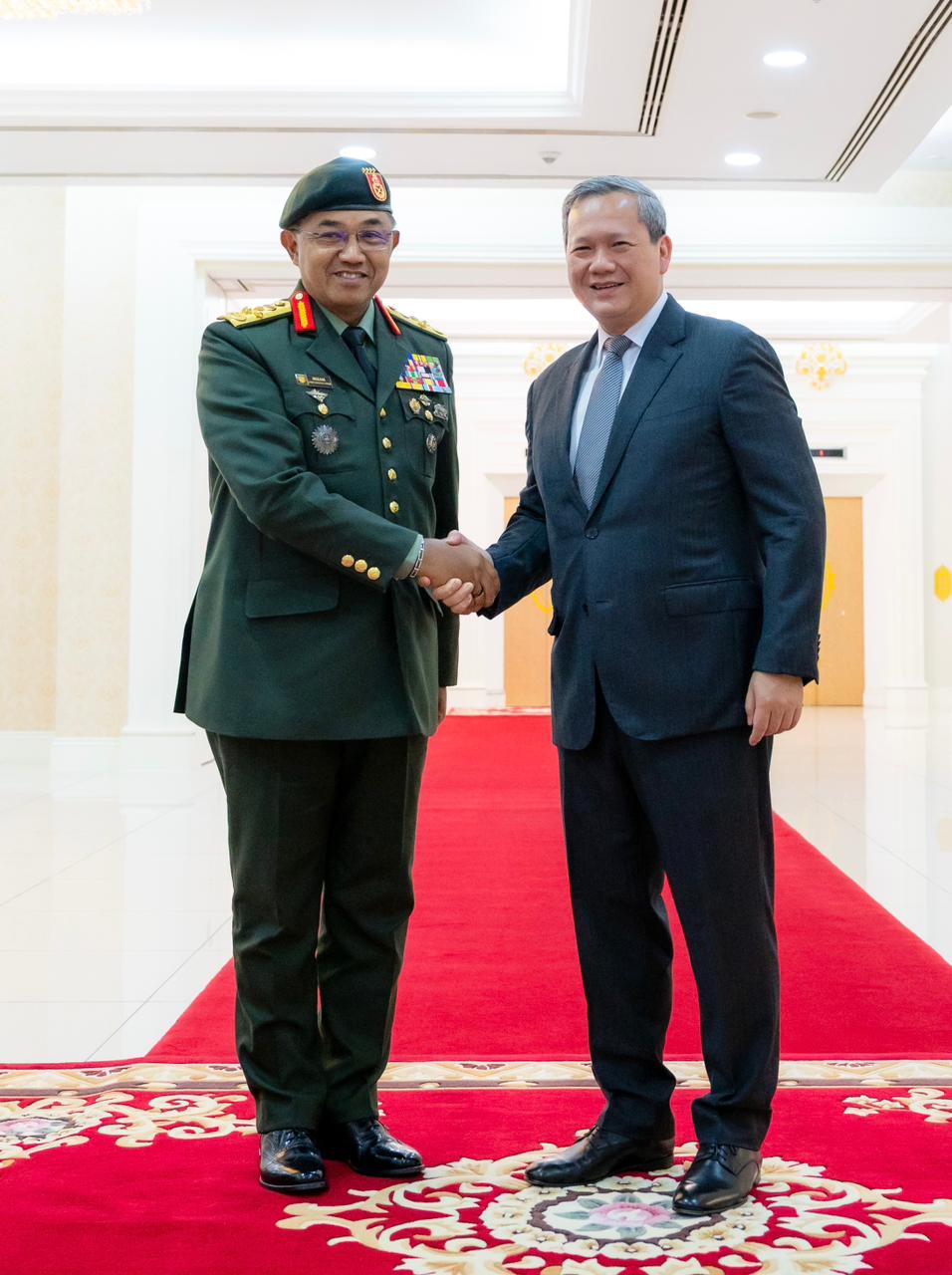 ឯកឧត្តមអគ្គមេបញ្ជាការកងទ័ពម៉ាឡេស៊ី ប្ដេជ្ញាសម្របសម្រួលការអនុវត្តតាមខ្លឹមសារ នៃសេចក្ដីថ្លែងការណ៍រួម កម្ពុជា-ថៃ នាព្រឹកថ្ងៃទី៧ ខែធ្នូ ឆ្នាំ២០២៥, សម្តេចមហាបវរធិបតី ហ៊ុន ម៉ាណែត នាយករដ្ឋមន្ត្រី នៃព្រះរាជាណាចក្រកម្ពុជា បានអនុញ្ញាតឱ្យ ឯកឧត្តម នាយឧត្តមសេនីយ៍ Tan Sri Hj Mohd Nizam bin Hj Jaffar អគ្គមេបញ្ជាការកងទ័ពម៉ាឡេស៊ី និង គណៈប្រតិភូចូលជួបសម្ដែងការគួរសម និងពិភាក្សាការងារ នៅវិមានសន្តិភាព។ ក្នុងឱកាសនៃជំនួបនេះ, ឯកឧត្តមអគ្គមេបញ្ជាការកងទ័ពម៉ាឡេស៊ី បានថ្លែងអំណរគុណយ៉ាងជ្រាលជ្រៅជូនចំពោះ សម្ដេចបវរធិបតី ដែលបានអនុញ្ញាតឱ្យរូបឯកឧត្តម និងគណៈប្រតិភូ ចូលជួបសម្ដែងការគួរសម និងពិភាក្សាការងារ។ ឯកឧត្តម ក៏បានថ្លែងអំណរគុណ និងវាយតម្លៃខ្ពស់ចំពោះកិច្ចសហការដ៏ល្អរបស់កម្ពុជា ក្នុងការសម្របសម្រួលដល់ការបំពេញការងាររបស់ក្រុមអ្នកសង្កេតការណ៍អាស៊ាន (AOT) ដើម្បីចុះអនុវត្តភារកិច្ចរបស់ខ្លួននៅកម្ពុជា នាពេលកន្លងមក។ ឯកឧត្តមអគ្គមេបញ្ជាការបានគូសបញ្ជាក់ថា ជីវិត និងសន្ដិភាព ពិតជាមានតម្លៃណាស់។ ក្នុងន័យនេះ, ឯកឧត្តមបានបញ្ជាក់អំពីកិច្ចខិតខំប្រឹងប្រែងរបស់ឯកឧត្តម ក្នុងការចូលរួមចំណែកសម្របសម្រួលឱ្យទទួលបាននូវសន្តិភាពនៃប្រទេសទាំងពីរ ក៏ដូចជាការប្ដេជ្ញាចិត្តក្នុងការបំពេញការងារប្រកបដោយអព្យាក្រឹតភាព ក្នុងការសម្របសម្រួលលើកិច្ចការនេះ។ ជាការឆ្លើយតប, សម្តេចបវរធិបតី បានសម្តែងនូវការស្វាគមន៍យ៉ាងកក់ក្ដៅចំពោះ ឯកឧត្តមអគ្គមេបញ្ជាការកងទ័ពម៉ាឡេស៊ី និងគណៈប្រតិភូ និងបានវាយតម្លៃខ្ពស់ចំពោះតួនាទីរបស់ប្រទេសម៉ាឡេស៊ី ជាពិសេស តួនាទីដ៏សំខាន់របស់ឯកឧត្ដមនាយករដ្ឋមន្រ្តី Anwar Ibrahim ដែលបានចូលរួមចំណែកជួយសម្របសម្រួលឱ្យមានបទឈប់បាញ់ កាលពីថ្ងៃទី២៨ ខែកក្កដា ឆ្នាំ២០២៥ និង ការឈានទៅសម្រេចបាននូវសេចក្ដីថ្លែងការណ៍រួម កម្ពុជា-ថៃ ដែលបានចុះហត្ថលេខានៅទីក្រុងគូឡាឡាំពួ ប្រទេសម៉ាឡេស៊ី កាលពីថ្ងៃទី២៦ ខែតុលា ឆ្នាំ២០២៥ ក៏ដូចជាអរគុណដល់តួនាទីដ៏សកម្មរបស់ ឯកឧត្តមអគ្គមេបញ្ជាការ ក្នុងការដឹកនាំ និងសម្របសម្រួលក្រុមអ្នកសង្កេតការណ៍អាស៊ាន ស្របតាមបទឈប់បាញ់កម្ពុជា-ថៃ, ស្មារតីនៃកិច្ចប្រជុំគណ:កម្មាធិការព្រំដែនទូទៅកម្ពុជា-ថៃ និងខ្លឹមសារនៃសេចក្ដីថ្លែងការណ៍រួម កម្ពុជា-ថៃ ដែលបានចុះហត្ថលេខានៅទីក្រុងគូឡាឡាំពួ។ ឆ្លៀតក្នុងឱកាសនេះ, សម្ដេចបវរធិបតី បានជម្រាបជូនឯកឧត្តមអគ្គមេបញ្ជាការកងទ័ពម៉ាឡេស៊ី អំពីស្ថានភាព និងការវិវត្ត នៃបញ្ហាព្រំដែន កម្ពុជា-ថៃ ព្រមទាំងបានគូសបញ្ជាក់អំពីការប្ដេជ្ញាចិត្ត និងជំហររបស់កម្ពុជាក្នុងការដោះស្រាយជម្លោះព្រំដែននេះដោយសន្តិវិធី ស្របតាមស្មារតីនៃសេចក្តីថ្លែងការណ៍រួមកម្ពុជា-ថៃ ព្រមទាំង