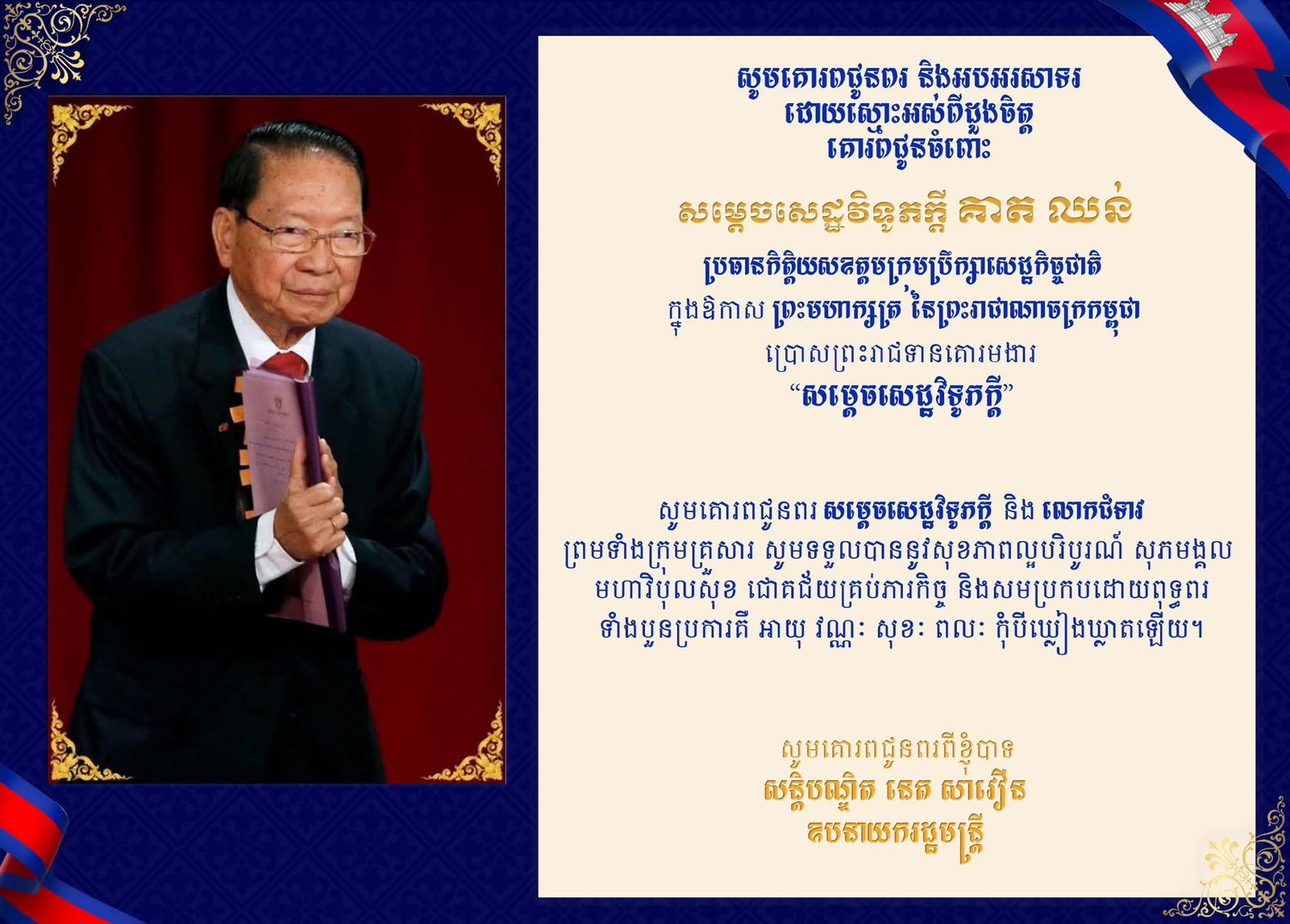 ឯកឧត្តមសន្តិបណ្ឌិត នេត សាវឿន ឧបនាយករដ្ឋមន្រ្តី សូមគោរពជូនពរ និងអបអរសាទរ គោរពជូនចំពោះ សម្តេចសេដ្ឋវិទូភក្ដី គាត ឈន់ ប្រធានកិត្តិយសឧត្តមក្រុមប្រឹក្សាសេដ្ឋកិច្ចជាតិ ក្នុងឱកាសព្រះមហាក្សត្រ ប្រោសព្រះរាជទានគោរមងារ សម្តេចសេដ្ឋវិទូភក្ដី