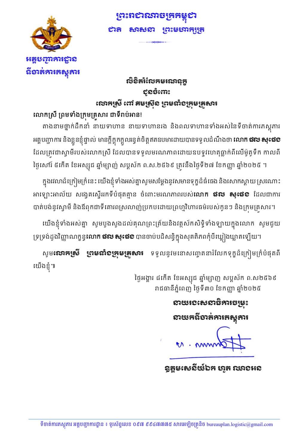 ឯកឧត្ដម ឧត្តមសេនីយ៍ឯក ហួត ឈាងអន នាយរងសេនាធិការចម្រុះ នាយកទីចាត់ការភស្តុភារ ព្រមទាំងថ្នាក់ដឹកនាំ នាយទាហាន នាយទាហានរង និងពលទាហានទាំងអស់នៃទីចាត់ការភស្តុភារ អគ្គបញ្ជាការ បានផ្ញើសារលិខិតរំលែកទុក្ខជូនលោកស្រី ពៅ គីមស្រ៊ុន ព្រមទាំងក្រុមគ្រួសារ ចំពោះមរណភាពលោក ផល សុផេង អនុប្រធាននាយកដ្ឋានអាម៉េរិក នៃក្រសួងការបរទេស និងសហប្រតិបត្តិការអន្តរជាតិ ដែលត្រូវជាស្វាមី ដែលបានទទួលមរណភាព នៅថ្ងៃទី២៧ ខែកញ្ញា ឆ្នាំ២០២៥៕