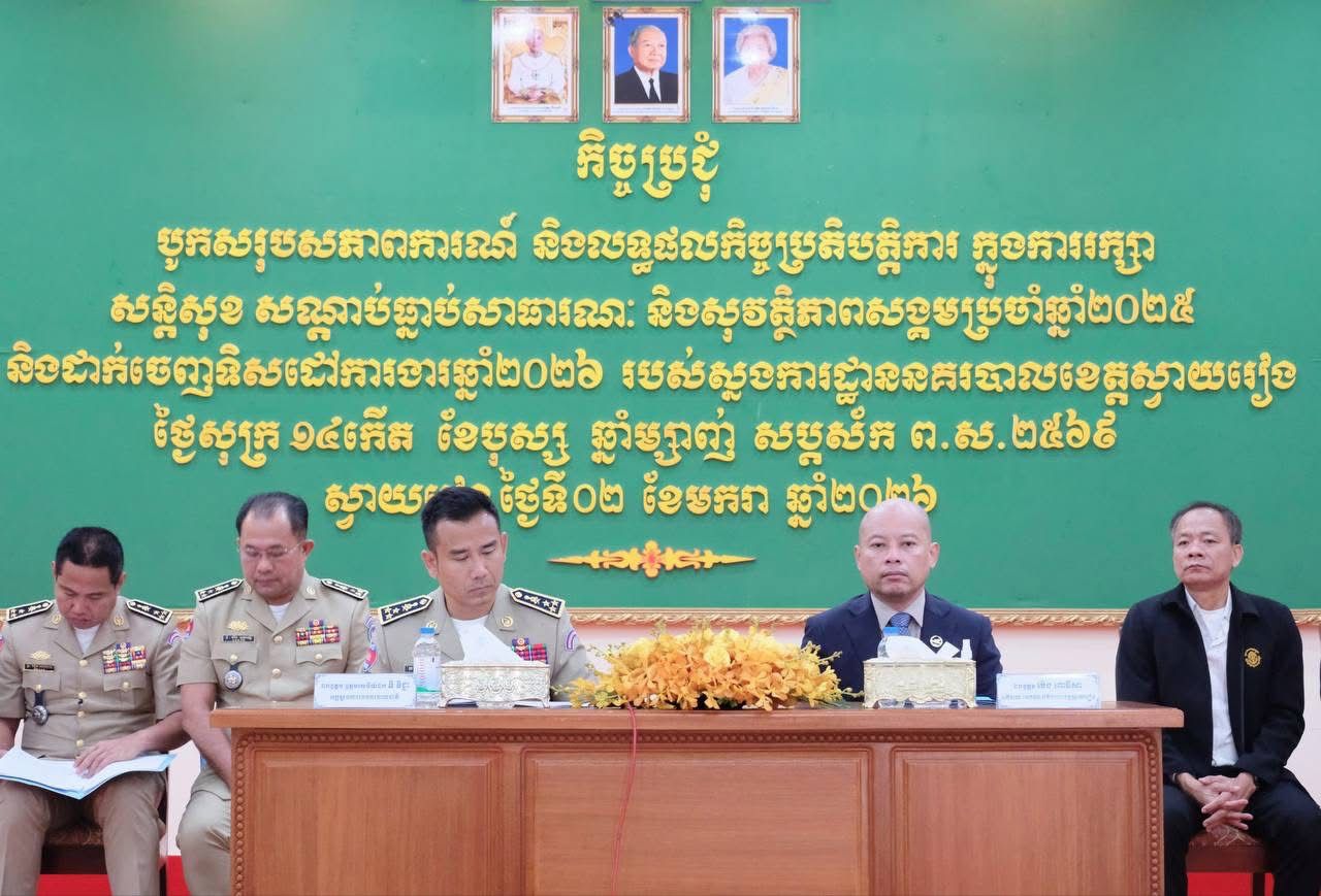 ឯកឧត្តម ឧត្តមសេនីយ៍ឯក ឌី វិជ្ជា អញ្ចើញជាអធិបតីភាពដឹកនាំកិច្ចប្រជុំបូកសរុបសភាពការណ៍ និងលទ្ធផលកិច្ចប្រតិបត្តិការ ក្នុងការរក្សាសន្តិសុខ សណ្តាប់ធ្នាប់សាធារណៈ ប្រចាំឆ្នាំ២០២៥ និងទិសដៅការងារឆ្នាំ២០២៦ របស់ស្នងការដ្ឋាននគរបាលខេត្តស្វាយរៀង================នៅព្រឹកថ្ងៃសុក្រ ១៤កើត ខែបុស្ស ឆ្នាំម្សាញ់ សប្តស័ក ពុទ្ធសករាជ ២៥៦៩ ត្រូវនឹងថ្ងៃទី២ ខែមករា ឆ្នាំ២០២៦ ឯកឧត្តម ឧត្តមសេនីយ៍ឯក ឌី វិជ្ជា អគ្គស្នងការរងនគរបាលជាតិ និងជាតំណាងដ៏ខ្ពង់ខ្ពស់ ឯកឧត្តម នាយឧត្តមសេនីយ៍ ស ថេត អគ្គស្នងការនគរបាលជាតិ និងឯកឧត្តម ប៉េង ពោធិ៍សា អភិបាលខេត្តស្វាយរៀង បានអញ្ចើញជាអធិបតីភាពដឹកនាំកិច្ចប្រជុំ "បូកសរុបសភាពការណ៍ និងលទ្ធផលកិច្ចប្រតិបត្តិការ ក្នុងការរក្សាសន្តិសុខ សណ្តាប់ធ្នាប់សាធារណៈ និងសុវត្ថិភាពសង្គមប្រចាំឆ្នាំ២០២៥ និងដាក់ចេញទិសដៅការងារឆ្នាំ២០២៦" របស់ស្នងការដ្ឋាននគរបាលខេត្តស្វាយរៀង