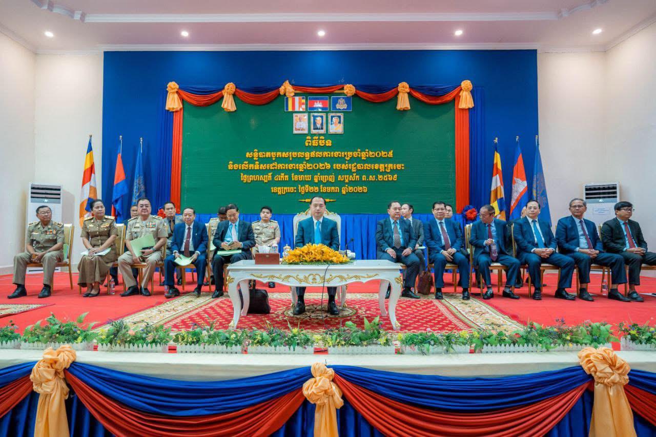 ឯកឧត្តម នេត្រ ភក្ត្រា រដ្ឋមន្ត្រីក្រសួងព័ត៌មាន និងជាប្រធានក្រុមការងាររាជរដ្ឋាភិបាលចុះមូលដ្ឋានខេត្តក្រចេះ អញ្ចើញជាអធិបតីភាពដ៏ខ្ពង់ខ្ពស់ក្នុងពិធីបិទសន្និបាតបូកសរុបលទ្ធផលការងារប្រចាំឆ្នាំ២០២៥ និងលើកទិសដៅការងារឆ្នាំ២០២៦ របស់រដ្ឋបាលខេត្តក្រចេះ=============ខេត្តក្រចេះ៖នៅថ្ងៃព្រហស្បតិ៍ ៤កើត ខែមាឃ ឆ្នាំម្សាញ់ សប្តស័ក ព.ស.២៥៦៩ ត្រូវនឹងថ្ងៃទី២២ ខែមករា ឆ្នាំ២០២៦ ឯកឧត្តម នេត្រ ភក្ត្រា រដ្ឋមន្ត្រីក្រសួងព័ត៌មាន និងជាប្រធានក្រុមការងាររាជរដ្ឋាភិបាលចុះមូលដ្ឋានខេត្តក្រចេះ បានអញ្ចើញជាអធិបតីភាពដ៏ខ្ពង់ខ្ពស់ក្នុងពិធីបិទសន្និបាតបូកសរុបលទ្ធផលការងារប្រចាំឆ្នាំ២០២៥ និងលើកទិសដៅការងារឆ្នាំ២០២៦ របស់រដ្ឋបាលខេត្តក្រចេះ ស្ថិតនៅសាលមហោស្រពខេត្ត ។ អង្គសន្និបាតក៏មានការអញ្ជើញចូលរួមពី ឯកឧត្ដម បណ្ឌិត ស៊ាង ប៊ុនលាង រដ្ឋលេខាធិការក្រសួងមហាផ្ទៃ ឯកឧត្តម អនុប្រធានក្រុមការងាររាជរដ្ឋាភិបាលចុះមូលដ្ឋានខេត្ត ឯកឧត្តម ហឿ សុីយ៉ែម ប្រធានក្រុមប្រឹក្សាខេត្ត និងឯកឧត្តម វ៉ា ថន អភិបាលខេត្ត ប្រធាន អនុប្រធានក្រុមការងាររាជរដ្ឋាភិបាលចុះមូលដ្ឋានក្រុង ស្រុក ឯកឧត្តម លោកជំទាវ ប្រតិភូក្រសួងមហាផ្ទៃ សមាជិកក្រុមប្រឹក្សាខេត្ត អភិបាលរងខេត្ត ប្រធានសាលាដំបូងខេត្ត ព្រះរាជអាជ្ញាអមសាលាដំបូងខេត្ត នាយក នាយករងរដ្ឋបាលខេត្ត មន្ត្រីរាជការនៃរដ្ឋបាលខេត្ត ប្រធាន អនុប្រធាន មន្ទីរ-អង្គភាពជុំវិញ កងកម្លាំងប្រដាប់អាវុធ ប្រធានក្រុមប្រឹក្សាក្រុង ស្រុក អភិបាលក្រុង ស្រុក មេឃុំចៅសង្កាត់ ស្មៀនឃុំ សង្កាត់ នាយប៉ុស្តិ៍នគរបាលឃុំ សង្កាត់ និងមន្ត្រីរាជការ។ឯកឧត្តម វ៉ា ថន អភិបាលខេត្តក្រចេះ បានធ្វើរបាយការណ៍ជម្រាបជូនពីដំណើរការនៃអង្គសន្និបាត បានពិភាក្សា និងស្ដាប់បទបង្ហាញពីក្រុមពិភាក្សាទាំង៦ ដោយបានបង្ហាញ ពីស្ថានភាពនៃការអនុវត្តជាក់ស្ដែង និងបញ្ហាប្រឈមដែលនៅសេសសល់ ហើយស្វែងរក ដំណោះស្រាយ និងប្រមូលធាតុចូលសំខាន់ៗ សម្រាប់កំណត់ទិសដៅអនុវត្តនាពេលខាងមុខ ៦រួមមាន៖ ១. វឌ្ឍនភាពនៃការអនុវត្តគោលនយោបាយ “ភូមិ-ឃុំ-សង្កាត់មានសុវត្ថិភាព” ២. វឌ្ឍនភាព នៃការពង្រឹង គុណភាព ការផ្តល់សេវាសុខាភិបាល៣. ពង្រឹងការអនុវត្តមុខងារអប់រំ នៃរដ្ឋបាលក្រុង-ស្រុក ៤.ការគ្រប់គ្រងតំបន់ការពារអភិរក្សធនធានធម្មជាតិ និងបរិស្ថាន និងការលើកកម្ពស់វិស័យទេសចរណ៍ ៥.ប្រសិទ្ធិភាពនៃការអនុវត្តគម្រោងមូលនិធិក្រុង-ស្រុកនិង ឃុំ-សង្កាត់ ៦. ការរៀបចំប្លង់គោលប្រើប្រាស់ដីថ្នាក់ក្រុង-ស្រុក និងការគ្រប់គ្រងសណ្តាប់ធ្នាប់សំណង់និងដីចំណីផ្លូវ ។អង្គសន្និបាតបានដាក់ចេញនូវវិធានការដោះស្រាយ ដោយខិតខំជំរុញពង្រឹងការអនុវត្តគោលនយោបាយ «ភូមិ ឃុំ-សង្កាត់មានសុ
