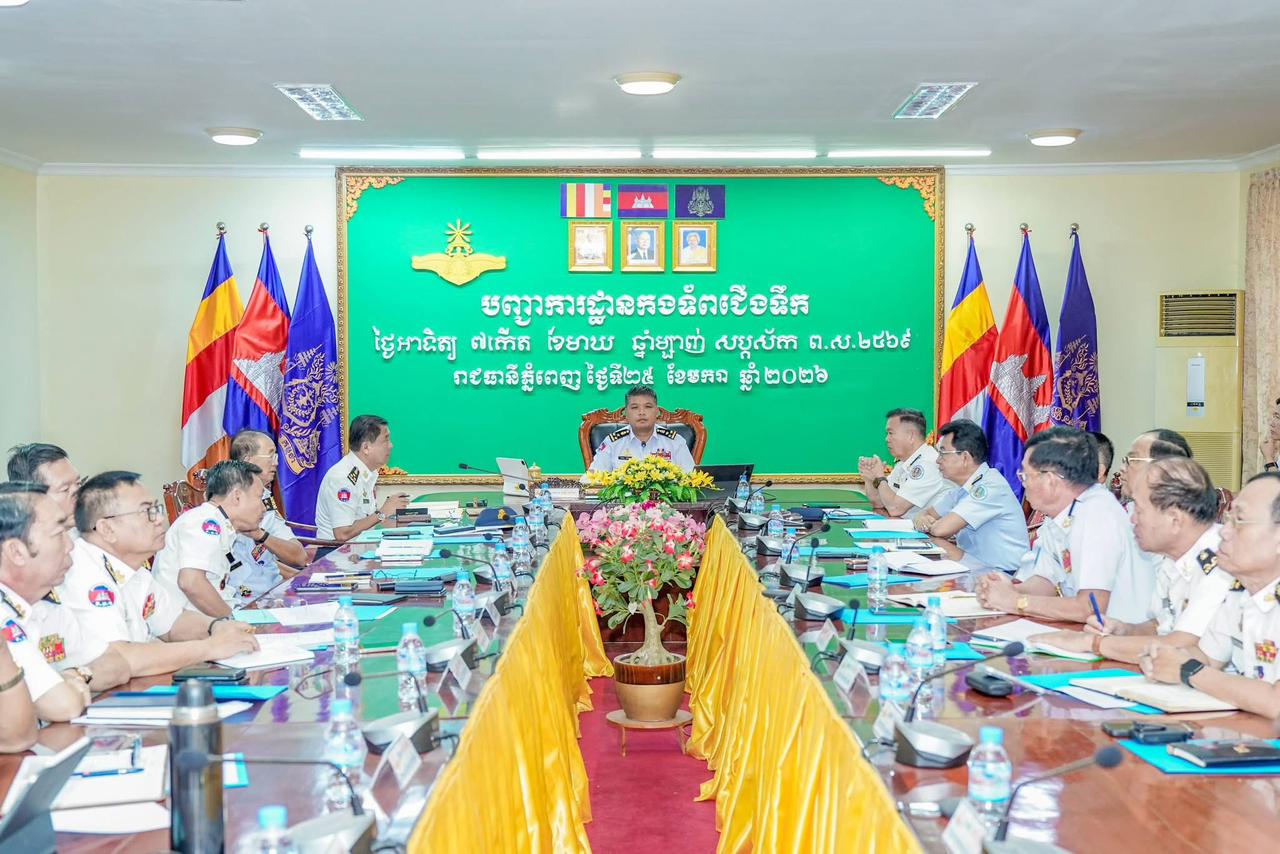 ឯកឧត្តម ឧត្តមនាវីឯក ទៀ សុខា មេបញ្ជាការកងទ័ពជើងទឹក អញ្ជើញដឹកនាំកិច្ចប្រជុំក្រុមការងារជំនាញ កងទ័ពជើងទឹក នៅសាលប្រជុំ បញ្ជាការដ្ឋានកងទ័ពជើងទឹក ជ្រោយចង្វារ ================(ភ្នំពេញ)៖នៅព្រឹកថ្ងៃចន្ទ ៨កើត ខែមាឃ ឆ្នាំម្សាញ់ សប្តស័ក ពុទ្ធសករាជ ២៥៦៩ ត្រូវនិងថ្ងៃទី២៦ ខែមករា ឆ្នាំ២០២៦ ឯកឧត្តម ឧត្តមនាវីឯក ទៀ សុខា មេបញ្ជាការកងទ័ពជើងទឹក អនុប្រធានប្រចាំការ និងជាអគ្គលេខាធិការ នៃគណៈកម្មាធិការជាតិសន្តិសុខលម្ហសមុទ្រ អញ្ជើញដឹកនាំកិច្ចប្រជុំក្រុមការងារជំនាញ កងទ័ពជើងទឹក នៅសាលប្រជុំ បញ្ជាការដ្ឋានកងទ័ពជើងទឹក ជ្រោយចង្វារ រាជធានីភ្នំពេញ។