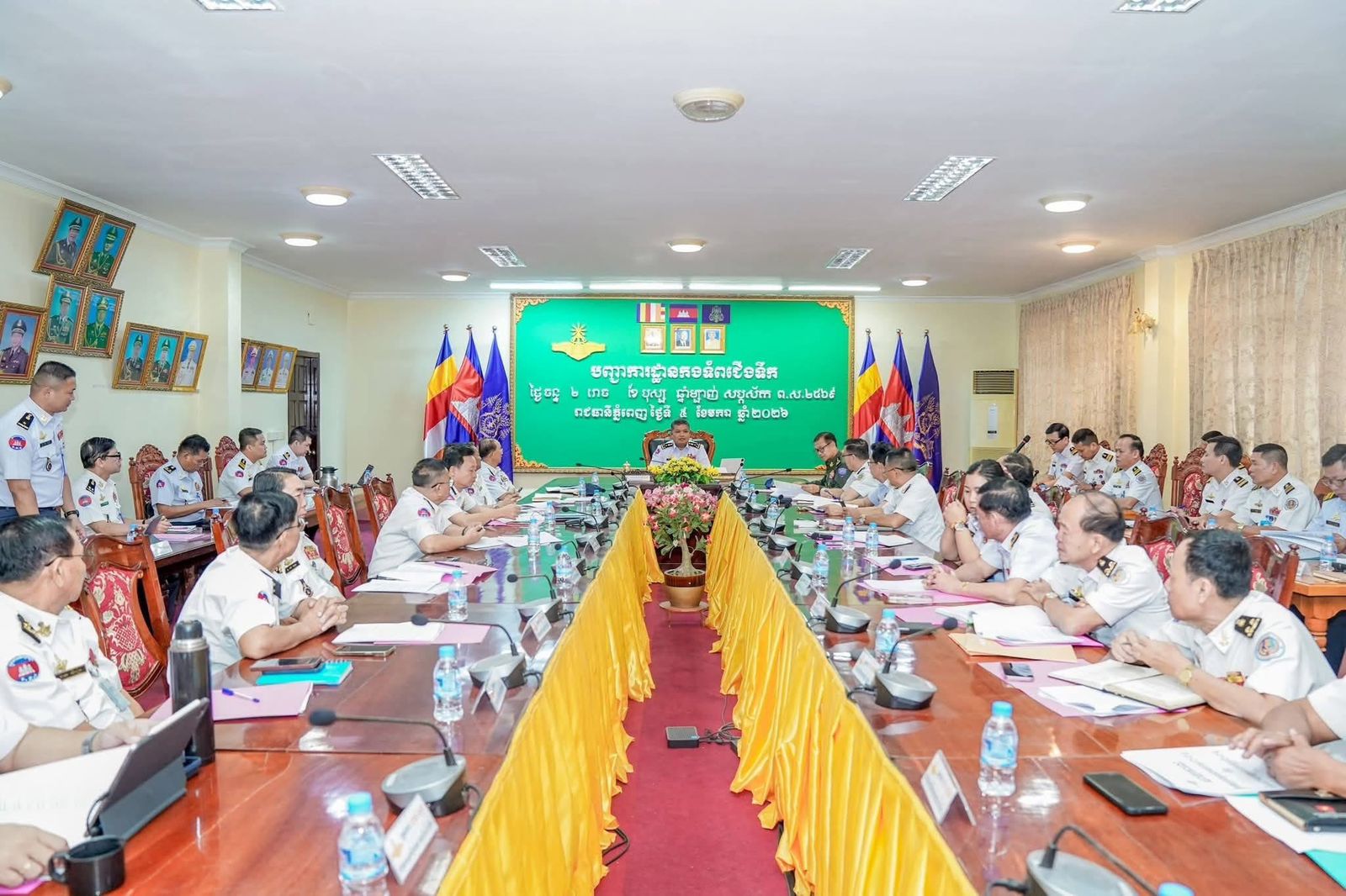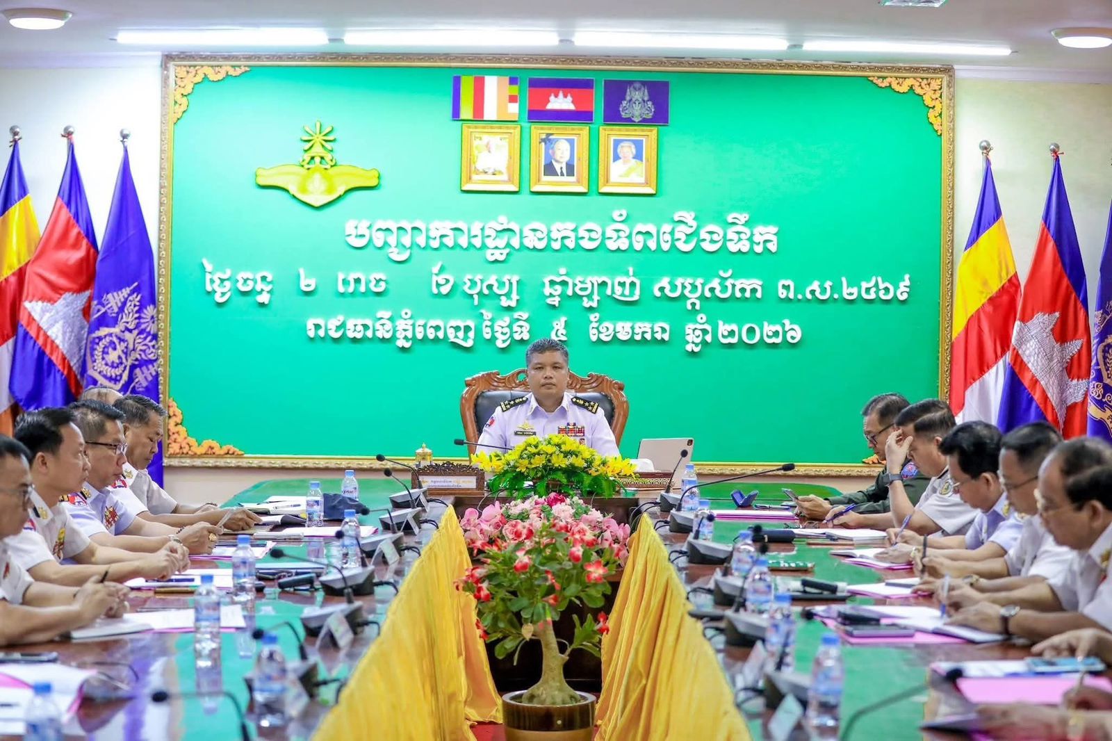 ឯកឧត្តម ឧត្តមនាវីឯក ទៀ សុខា អញ្ជើញដឹកនាំកិច្ចប្រជុំឆ្លងសេចក្តីព្រាងរបាយការណ៍បូកសរុបលទ្ធផលការងារឆ្នាំ២០២៥ ទិសដៅអនុវត្តការងារឆ្នាំ២០២៦ របស់កងទ័ពជើងទឹក================រាជធានីភ្នំពេញ៖នៅថ្ងៃចន្ទ ២រោច ខែបុស្ស ឆ្នាំម្សាញ់ សប្តស័ក ពុទ្ធសករាជ ២៥៦៩ ត្រូវនិងថ្ងៃទី៥ ខែមករា ឆ្នាំ២០២៦ ឯកឧត្តម ឧត្តមនាវីឯក ទៀ សុខា មេបញ្ជាការកងទ័ពជើងទឹក អនុប្រធានប្រចាំការ និងជាអគ្គលេខាធិការ នៃគណៈកម្មាធិការជាតិសន្តិសុខលម្ហសមុទ្រ បានអញ្ជើញជាអធិបតីភាពដឹកនាំកិច្ចប្រជុំឆ្លងសេចក្តីព្រាងរបាយការណ៍បូកសរុបលទ្ធផលការងារឆ្នាំ២០២៥ ទិសដៅអនុវត្តការងារឆ្នាំ២០២៦ របស់កងទ័ពជើងទឹក នៅបញ្ជាការដ្ឋានកងទ័ពជើងទឹក ជ្រោយចង្វារ។