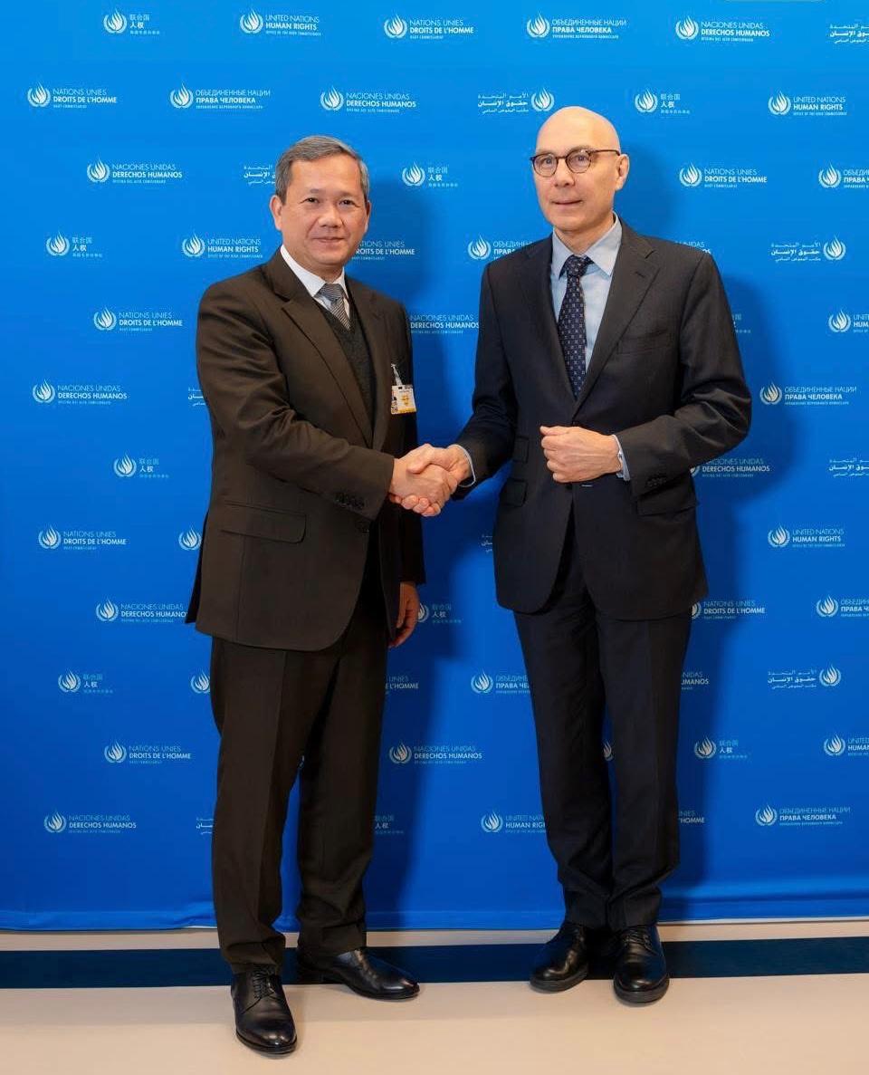 សម្ដេចមហាបវរធិបតី ហ៊ុន ម៉ាណែត អញ្ចើញជួបជាមួយឯកឧត្តម Volker Türk ឧត្តមស្នងការសហប្រជាជាតិទទួលបន្ទុកសិទ្ធិមនុស្ស ក្នុងជំនួបសម្តែងការគួរសម និងពិភាក្សាការងារ នៅប្រទេសស្វីស=============ប្រទេសស្វីស៖នៅព្រឹកថ្ងៃចន្ទ ៧កើត ខែផល្គុន ឆ្នាំម្សាញ់ សប្តស័ក ព.ស.២៥៦៩ ត្រូវនឹងថ្ងៃទី២៣ ខែកុម្ភៈ ឆ្នាំ២០២៦ សម្ដេចមហាបវរធិបតី ហ៊ុន ម៉ាណែត នាយករដ្នមន្ត្រីនៃព្រះរាជាណាចក្រកម្ពុជា អញ្ចើញជួបជាមួយ ឯកឧត្តម Volker Türk ឧត្តមស្នងការសហប្រជាជាតិទទួលបន្ទុកសិទ្ធិមនុស្ស ក្នុងជំនួបសម្តែងការគួរសម និងពិភាក្សាការងារ។