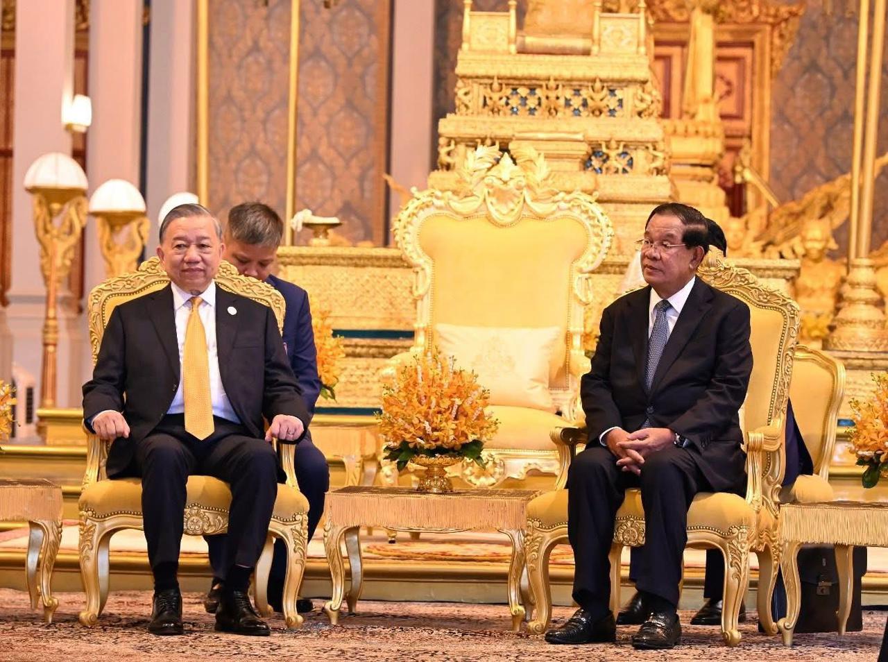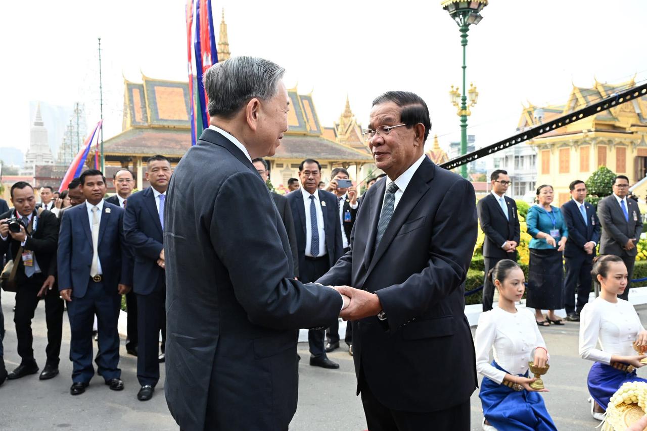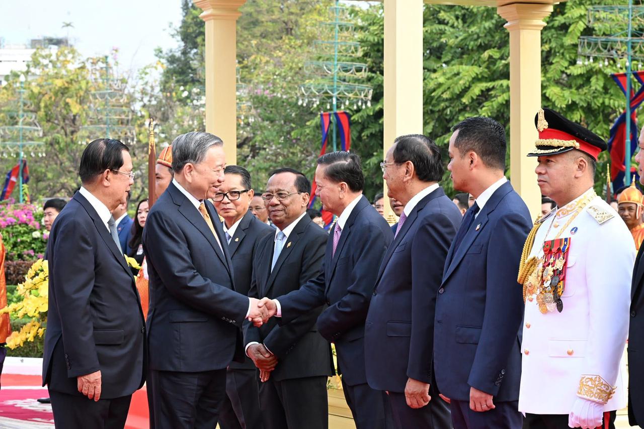 ឯកឧត្តមសន្តិបណ្ឌិត នេត សាវឿន ឧបនាយករដ្ឋមន្ត្រី បានអញ្ជើញអមសម្តេចអគ្គមហាសេនាបតីតេជោ ហ៊ុន សែន អញ្ជើញជាព្រះរាជតំណាងដ៏ខ្ពង់ខ្ពស់បំផុតរបស់ ព្រះមហាក្សត្រ ក្នុងពិធីទទួលបដិសណ្ឋារកិច្ចផ្លូវរដ្ឋជូន ឯកឧត្តម តូ ឡឹម អគ្គលេខាធិការ នៃគណៈកម្មាធិការមជ្ឈិមគណបក្សកុម្មុយនីស្តវៀតណាម ==================(ភ្នំពេញ): នាព្រឹកថ្ងៃសុក្រ ៤រោច ខែមាឃ ឆ្នាំម្សាញ់ សប្តស័ក ព.ស.២៥៦៩ ត្រូវនឹងថ្ងៃទី៦ ខែកុម្ភៈ ឆ្នាំ២០២៦ ឯកឧត្តមសន្តិបណ្ឌិត នេត សាវឿន ឧបនាយករដ្ឋមន្ត្រី បានអញ្ជើញអមសម្តេចអគ្គមហាសេនាបតីតេជោ ហ៊ុន សែន ប្រធានព្រឹទ្ធសភា និងជាប្រធានក្រុមឧត្តមប្រឹក្សាផ្ទាល់ព្រះមហាក្សត្រ នៃព្រះរាជាណាចក្រកម្ពុជា អញ្ជើញជាព្រះរាជតំណាងដ៏ខ្ពង់ខ្ពស់បំផុតរបស់ ព្រះករុណាព្រះបាទសម្តេចព្រះបរមនាថ នរោត្តម សីហមុនី ព្រះមហាក្សត្រ នៃព្រះរាជាណាចក្រកម្ពុជា ក្នុងពិធីទទួលបដិសណ្ឋារកិច្ចផ្លូវរដ្ឋជូន ឯកឧត្តម តូ ឡឹម អគ្គលេខាធិការ នៃគណៈកម្មាធិការមជ្ឈិមគណបក្សកុម្មុយនីស្តវៀតណាម នៅខាងមុខព្រះទីនាំងទេវាវិនិច្ឆ័យ ព្រះបរមរាជវាំង។