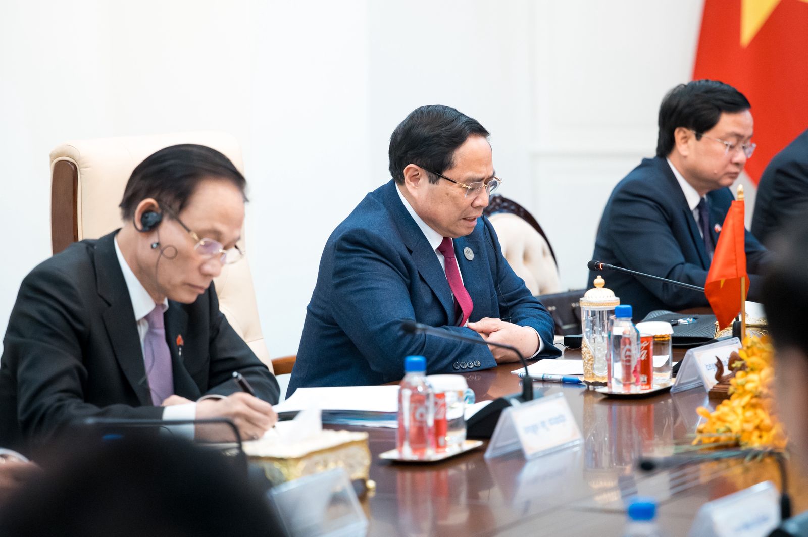 ក្នុងឱកាសនៃជំនួប, សម្ដេចបវរធិបតី បានសម្ដែងនូវសេចក្ដីសោមនស្សរីករាយ និងការស្វាគមន៍យ៉ាងកក់ក្ដៅជូនចំពោះ ឯកឧត្តម ផាម មិញជិញ និងគណៈប្រតិភូ ដែលបានអញ្ជើញចូលរួមកិច្ចប្រជុំកំពូលបីគណបក្ស លើកទី៤ ដែលកម្ពុជាធ្វើជាម្ចាស់ផ្ទះ បន្ទាប់ពីកិច្ចប្រជុំលើកទី៣ កាលពីខែកុម្ភៈ ឆ្នាំ២០២៥ ទីក្រុងហូជីមិញ នៃសាធារណរដ្ឋសង្គមនិយមវៀតណាម។