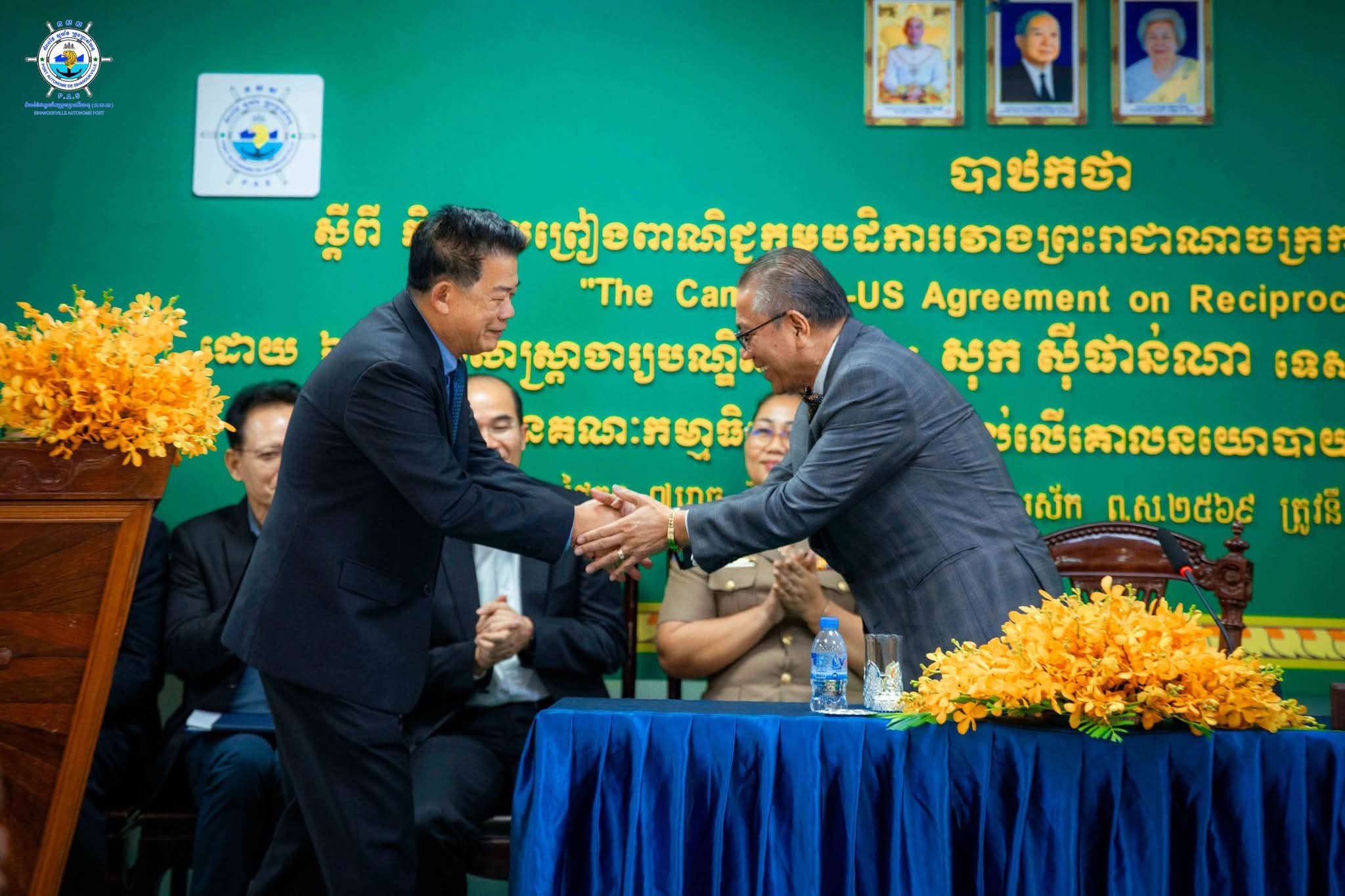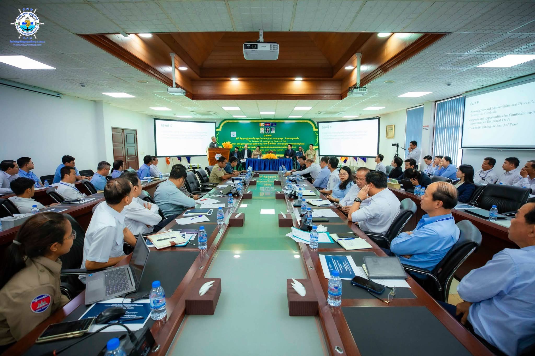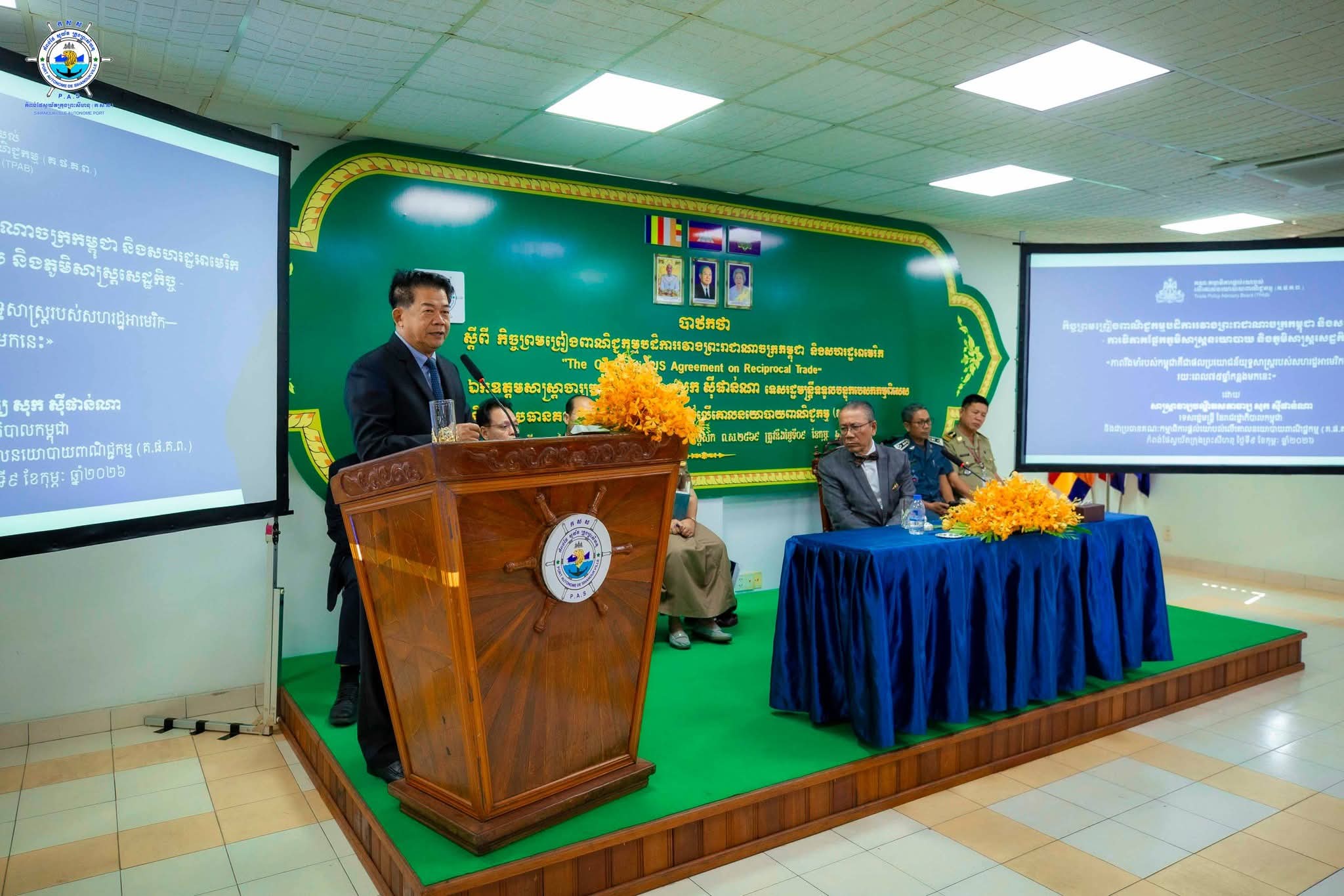 បាឋកថាស្តីពី “កិច្ចព្រមព្រៀងពាណិជ្ជកម្មបដិការរវាង ព្រះរាជាណាចក្រកម្ពុជា និងសហរដ្ឋអាមេរិក ក្រោមអាណត្តិ លោកប្រធានាធិបតី ដូណាល់ត្រាំ" នៅកំពង់ផែស្វយ័តក្រុងព្រះសីហនុ============កំពង់ផែស្វយ័តក្រុងព្រះសីហនុ (កសស) ៖ នាវេលាម៉ោង ៩ ព្រឹក ថ្ងៃចន្ទ ៧ រោច ខែមាឃ ឆ្នាំម្សាញ់ សប្តស័ក ពុទ្ធសករាជ ២៥៦៩ ត្រូវនឹងថ្ងៃទី០៩ ខែកុម្ភៈ ឆ្នាំ២០២៦ នៅសាលប្រជុំធំ កសស ឯកឧត្តម សាស្ត្រាចារ្យបណ្ឌិតសភាចារ្យ សុក ស៊ីផាន់ណា ទេសរដ្ឋមន្ត្រី ទទួលបន្ទុកបេសកកម្មពិសេស និងជាប្រធានគណៈកម្មាធិការផ្តល់យោបល់លើគោលនយោបាយ បានអញ្ជើញជាអធិបតីភាព ក្នុងការធ្វើបាឋកថា ស្តីពី “កិច្ចព្រមព្រៀងពាណិជ្ជកម្មបដិការរវាង ព្រះរាជាណាចក្រកម្ពុជា និងសហរដ្ឋអាមេរិក ក្រោមអាណត្តិ លោកប្រធានាធិបតី ដូណាល់ត្រាំ" ជូនចំពោះ ឯកឧត្តម លូ គឹមឈន់ ប្រតិភូរាជរដ្ឋាភិបាលកម្ពុជា ទទួលបន្ទុកជាប្រធានអគ្គនាយក កំពង់ផែស្វយ័តក្រុងព្រះសីហនុ រួមទាំង ថ្នាក់ដឹកនាំ កសស ក្រុមការងារ កសស មន្ត្រីសាលាខេត្តព្រះសីហនុ មន្ត្រីសាខាគយ និងរដ្ឋាករកំពង់ផែអន្តរជាតិខេត្តព្រះសីហនុ និងនគរបាលអន្តោប្រវេសន៍ច្រកទ្វារកំពង់ផែអន្តរជាតិខេត្តព្រះសីហនុ។