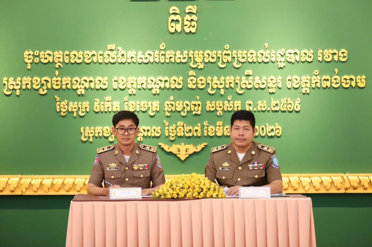 លោក ប៊ិន ឡាដា អភិបាលស្រុកស្រីសន្ធរ អញ្ចើញដឹកនាំក្រុមការងារចូលរួមពិធីចុះហត្ថលេខាលើឯកសារកែសម្រួលព្រំប្រទល់រដ្ឋបាល រវាងស្រុកស្រីសន្ធរ ខេត្តកំពង់ចាម និងស្រុកខ្សាច់កណ្តាល ខេត្តកណ្តាល================នៅព្រឹកថ្ងៃសុក្រ ទី២៧ ខែមីនា ឆ្នាំ២០២៦ លោក ប៊ិន ឡាដា អភិបាល នៃគណៈអភិបាលស្រុកស្រីសន្ធរ បានដឹកនាំក្រុមការងារ មេឃុំ មេភូមិពាក់ព័ន្ធ រួមជាមួយតំណាងមន្ទីររៀបចំដែនដី នគរូបនីយកម្ម សំណង់ និងសុរិយោដីខេត្តកំពង់ចាម ចូលរួមពិធីចុះហត្ថលេខាលើឯកសារកែសម្រួលព្រំប្រទល់រដ្ឋបាល រវាងស្រុកស្រីសន្ធរ ខេត្តកំពង់ចាម និងស្រុកខ្សាច់កណ្តាល ខេត្តកណ្តាល ដឹកនាំដោយលោក ចេង ឌីណា អភិបាល នៃគណៈអភិបាលស្រុកខ្សាច់កណ្តាល និងលោក ប៊ិន ឡាដា អភិបាល នៃគណៈអភិបាលស្រុកស្រីសន្ធ ដែលប្រព្រឹត្តទៅនៅសាលប្រជុំសាលាស្រុកខ្សាច់កណ្តាល។