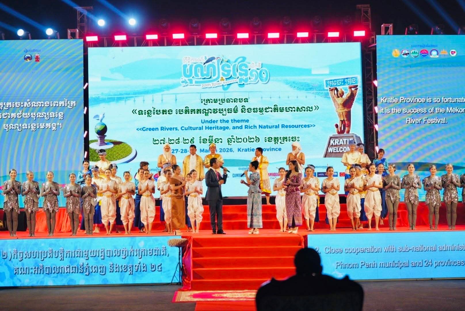 ឯកឧត្តមសន្តិបណ្ឌិត នេត សាវឿន ឧបនាយករដ្ឋមន្ត្រី អញ្ជើញជាអធិបតីដ៏ខ្ពង់ខ្ពស់ ក្នុងពិធីបើកជាផ្លូវការនៃព្រឹត្តិការណ៍បុណ្យទន្លេលើកទី១០ ឆ្នាំ២០២៦ ក្រោមប្រធានបទ «ទន្លេបៃតង បេតិកភណ្ឌវប្បធម៌ និងធម្មជាតិមហាសាល» នៅខេត្តក្រចេះ=============(ខេត្តក្រចេះ): នាល្ងាចថ្ងៃសៅរ៍ ១០កើត ខែចេត្រ ឆ្នាំម្សាញ់ សប្តស័ក ព.ស.២៥៦៩ ត្រូវនឹងថ្ងៃទី២៨ ខែមីនា ឆ្នាំ២០២៦ ឯកឧត្តមសន្តិបណ្ឌិត នេត សាវឿន ឧបនាយករដ្ឋមន្ត្រី និងជាប្រធានអាជ្ញាធរជាតិប្រយុទ្ធប្រឆាំងគ្រឿងញៀន តំណាងដ៏ខ្ពង់ខ្ពស់សម្តេចមហាបវរធិបតី ហ៊ុន ម៉ាណែត នាយករដ្ឋមន្ត្រី នៃព្រះរាជាណាចក្រកម្ពុជា បានអញ្ជើញជាអធិបតីដ៏ខ្ពង់ខ្ពស់ក្នុងពិធីបើកជាផ្លូវការនៃព្រឹត្តិការណ៍បុណ្យទន្លេលើកទី១០ ឆ្នាំ២០២៦ ក្រោមប្រធានបទ «ទន្លេបៃតង បេតិកភណ្ឌវប្បធម៌ និងធម្មជាតិមហាសាល» នៅខេត្តក្រចេះ។ ពិធីបុណ្យទន្លេនេះ ប្រព្រឹត្តទៅមានរយៈពេលចំនួន ៣ថ្ងៃ គឺថ្ងៃទី២៧-២៩ ខែមីនា ឆ្នាំ២០២៦៕