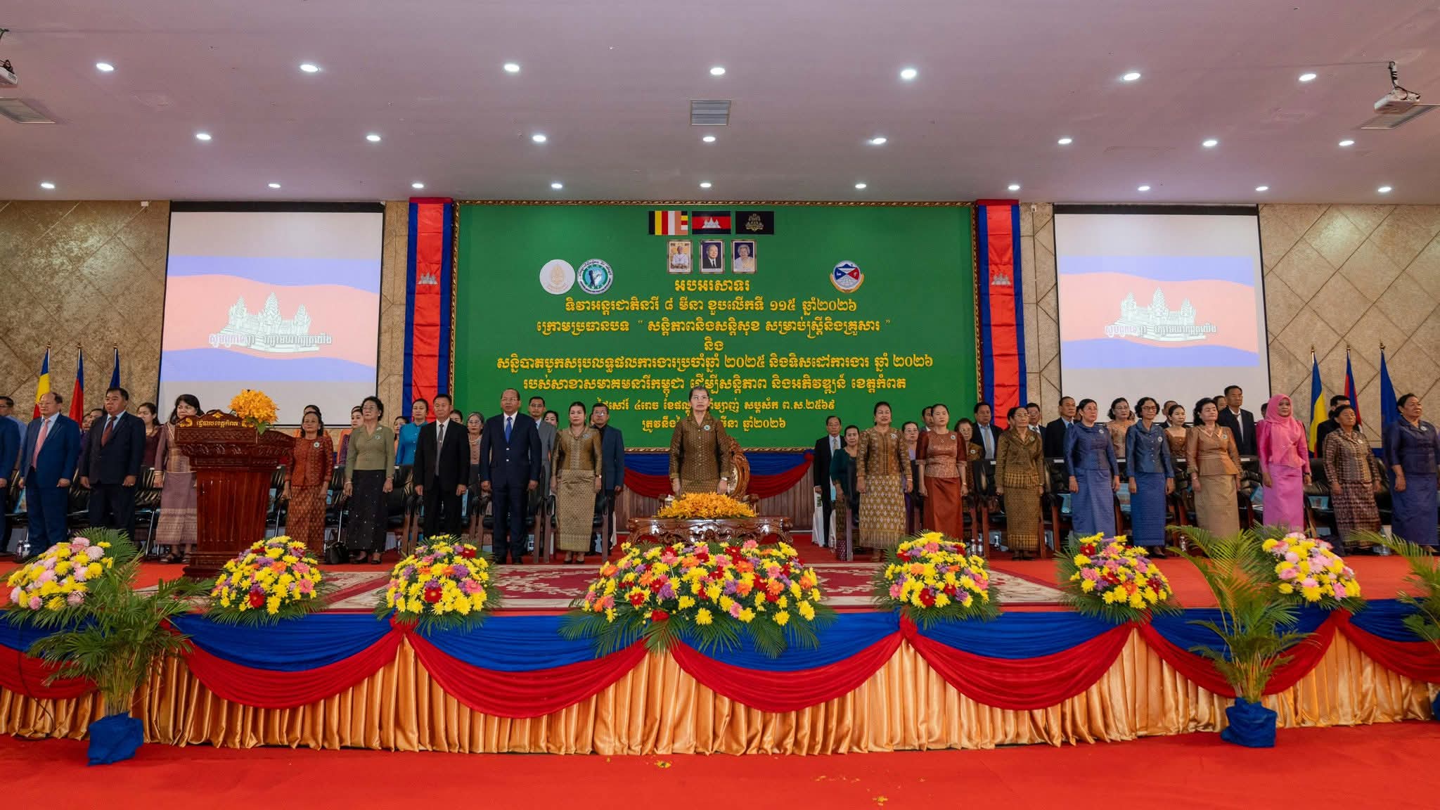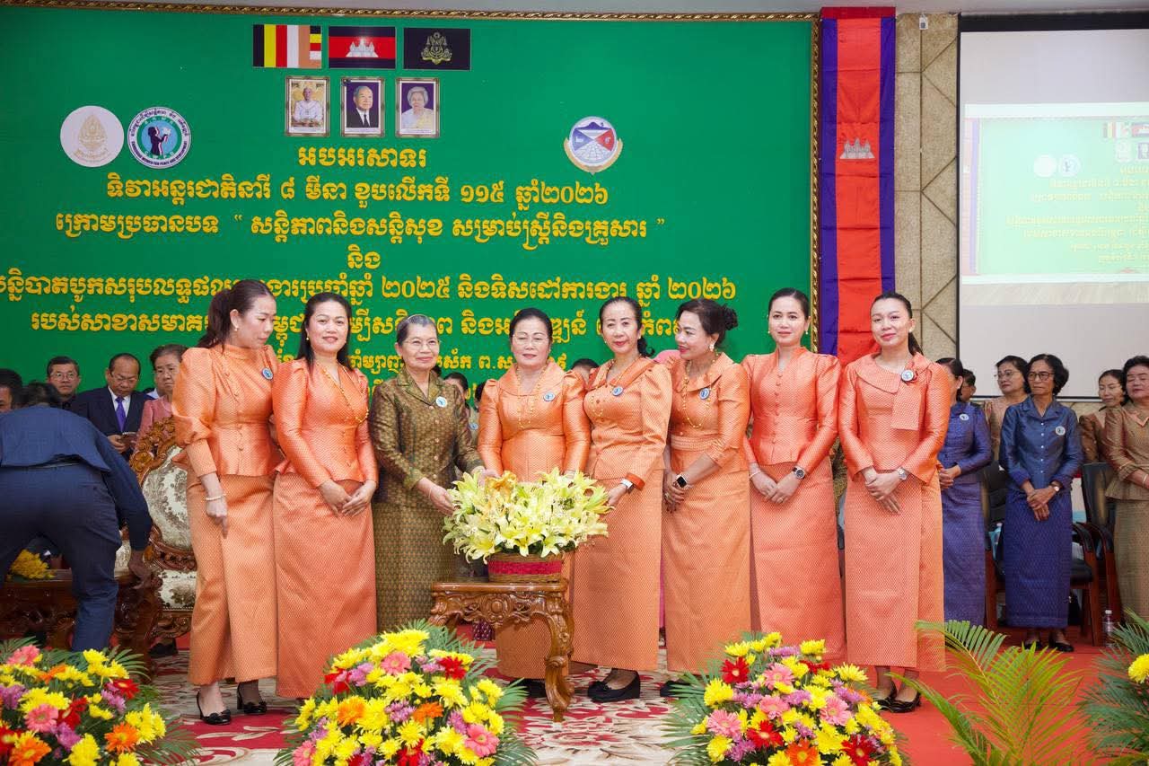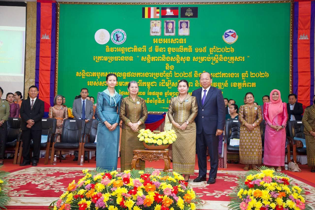 សម្តេច ម៉ែន សំអន ៖ ប្រធានបទ នៃទិវាអន្តរជាតិ ៨មិនា ខួបលើកទី ១១៥ បង្ហាញអំពីសារៈសំខាន់មិនអាចកាត់ថ្លៃបាននៃសន្តិភាព សន្តិសុខសម្រាប់ស្ត្រី ក្រុមគ្រួសារ និងការចូលរួមចំណែកយ៉ាងសកម្មរបស់ស្ត្រី ក្នុងកិច្ចខិតខំប្រឹងប្រែងដើម្បីកសាង និងថែរក្សាសន្តិភាព======================សម្តេចកិត្តិសង្គហបណ្ឌិត ម៉ែន សំអន ឧត្តមប្រឹក្សាផ្ទាល់ព្រះមហាក្សត្រ និងជាប្រធានសមាគមនារីកម្ពុជា ដើម្បីសន្តិភាព និងអភិវឌ្ឍន៍ បានអញ្ជើញជាអធិបតីក្នុងពិធីអបអរសាទរខួបលើកទី ១១៥ ទិវាអន្តរជាតិនារី ៨ មីនា ឆ្នាំ ២០២៦ ក្រោមប្រធានបទ “សន្តិភាព និងសន្តិសុខសម្រាប់ស្ត្រី និងគ្រួសារ” និងសន្និបាតបូកសរុបលទ្ធផលការងារប្រចាំឆ្នាំ ២០២៥ និងលើកទិសដៅបន្តឆ្នាំ ២០២៦ របស់សាខាសមាគមនារីកម្ពុជា ដើម្បីសន្តិភាព និងអភិវឌ្ឍន៍ខេត្តកំពត ដែលមានប្រសាសន៍ នាព្រឹកថ្ងៃសៅរ៍ ៤រោច ខែផល្គុន ឆ្នាំម្សាញ់ សប្តស័ក ព.ស.២៥៦៩ ត្រូវនឹងថ្ងៃទី៧ ខែមីនា ឆ្នាំ២០២៦។ថ្លែងក្នុងពិធិនោះ លោកជំទាវ ហ៊ុន ចាន់ធី មៅ ធនិន ប្រធាន កិត្តិយសសាខាសមាគមនារីកម្ពុជា ដើម្បីសន្តិភាព និងអភិវឌ្ឍន៍ខេត្តកំពត បានអនុវត្តតាមលក្ខន្តិកៈរបស់សមាគម គោលនយោបាយរបស់រាជរដ្ឋាភិបាល និងផែនការសកម្មភាពរបស់សាខាសមាគម ដោយសម្រេចបានបាននូវលទ្ធផលគួរជាទីមោទនៈ ដោយបានចូលរួមដោះស្រាយបាននូវបញ្ហាបានជាច្រើន ជាពិសេស ពាក់ព័ន្ធជាមួយនឹងស្ត្រី និងការដោះស្រាយក្រៅប្រព័ន្ធតុលាការ ជាដើម ។ល។មានប្រសាសន៍ក្នុងពិធីនោះ ឯកឧត្តមអភិបាលខេត្ត បានលើកឡើងថា រដ្ឋបាលខេត្តបានយកចិត្តិទុកដាក់ខ្ពស់ក្នុងការលើកកម្ពស់សិទ្ធិ អំណាច និងបង្កើ់នភាពអង់អាចដល់ស្ត្រី រីឯរាល់កិច្ចអភិវឌ្ឍន៍លើកគ្រប់វិស័យនៅទូទាំងខេត្ត គឺមិនអាចខ្វះបាននូវការចូលរួមចំណែកពីស្ត្រីនៅគ្រប់ជាន់ថ្នាក់។ បច្ចុប្បន្ននេះ ខេត្តកំពត មាន ៖ ស្ត្រីជាក្រុមប្រឹក្សាខេត្ត ០៤រូប អភិបាលស្រុក ក្រុង ០២រូប មេឃុំ ៧រូប ក្រុមប្រឹក្សាឃុំសង្កាត់ ៥៦១រូប (មានស្ត្រី ១១១រូប)។ សម្តេចកិត្តិសង្គហបណ្ឌិត ក៏បានថ្លែងកោតសសើរចំពោះ លោកជំទាវ ហ៊ុន ចាន់ធី មៅ ធនិន បានខិតខំប្រឹងប្រែងអស់ពីសមត្ថភាព កម្លាំងកាយ ចិត្ត ប្រាជ្ញា ស្មារតីអនុវត្តឱ្យបាននូវទិសដៅ ភារកិច្ច ដោយឈរលើ សាមគ្គីភាព ឯកភាព សហការគ្នាល្អ និងមានទំនាក់ទំនងជិតស្និទ្ធជាមួយអាជ្ញាធរគ្រប់លំដាប់ថ្នាក់ ដៃគូពាក់ព័ន្ធ ព្រមទាំងប្រជាពលរដ្ឋ។ ពិសេស ទទួលបានការគាំទ្រពី ឯកឧត្តម ម៉ៅ ធនិន អភិបាលនៃគណៈអភិបាលខេត្តកំពត ដែលបានជម្រុញលើកទឹកចិត្ត។នៅក្នុងឱកាសនោះ សម្តេចកិត្តិសង្គហបណ្ឌិត បានលើកឡើងថា ទិវានារីអន្តរជាតិ៨មីនា ឆ្នាំ២០២៦នេះ ត្រូវបានប្រារព្ធធ្វើឡើងក្រោមប្រធានបទ «សន្តិភាព និងសន្តិសុខសម្រាប់ស្ត្រី និងគ្រួ