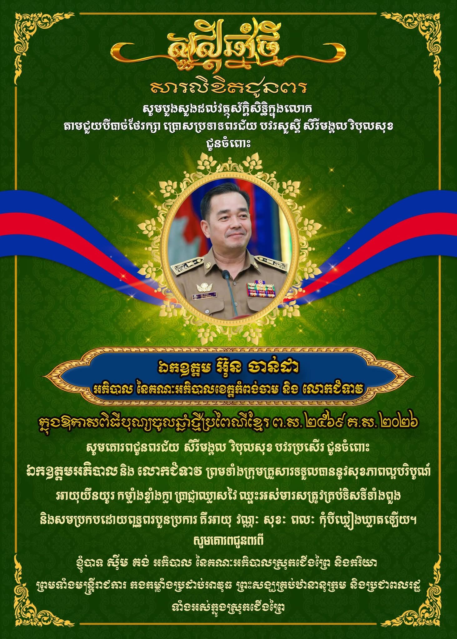 លោក ស៊ីម គង់ អភិបាល នៃគណៈអភិបាលស្រុកជើងព្រៃ ព្រះសង្ឃ មន្ត្រីរាជការរដ្ឋបាលស្រុក រដ្ឋបាលឃុំ កម្លាំងទាំង៣ និងប្រជាពលរដ្ឋទូទាំងស្រុកជើងព្រៃ ប្រគេនពរ និងគោរពជូនពរ បវរសួស្តី ជ័យមង្គល វិបុលសុខ ជូនចំពោះ ឯកឧត្តម អ៊ុន ចាន់ដា អភិបាល នៃគណៈអភិបាលខេត្តកំពង់ចាម ក្នុងឱកាសបុណ្យចូលឆ្នាំថ្មី ប្រពៃណីជាតិខ្មែរ ឆ្នាំមមី អដ្ឋស័ក ព.ស.២៥៧០។