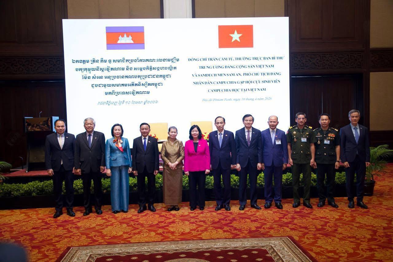 សម្ដេចកិត្តិសង្គហបណ្ឌិត ម៉ែន សំអន និង ឯកឧត្តម ត្រឡិន កឹមទូ សមាជិកប្រចាំការគណៈលេខាមជ្ឈិមបក្សកុម្មុយនីស្តវៀតណាម អញ្ជើញជួបសំណេះសំណាលជាមួយអតីតនិស្សិតកម្ពុជា ដែលទទួលបានការបណ្តុះបណ្តាល នៅប្រទេសវៀតណាម ===========នារសៀលថ្ងៃសុក្រ ទី១០ ខែមេសា ឆ្នាំ២០២៦ សម្តេចកិត្តិសង្គហបណ្ឌិត ម៉ែន សំអន អនុប្រធានគណបកហសប្រជាជនកម្ពុជា និងជាប្រធានសមាគមមិត្តភាពកម្ពុជា-វៀតណាម និង ឯកឧត្តម ត្រឡិន កឹមទូ សមាជិកប្រចាំការគណៈលេខាមជ្ឈិមបក្សកុម្មុយនីស្តវៀតណាម បានអញ្ជើញជាអអិបតីភាពដ៏ខ្ពង់ខ្ពស់ក្នុងពិធីជួបសំណេះសំណាលជាមួយអតីតនិស្សិតកម្ពុជា ដែលទទួលបានការបណ្តុះបណ្តាលនៅប្រទេសវៀតណាម នៅសណ្ឋាគារសូហ្វីតែល ភូគីត្រា រាជធានីភ្នំពេញ។លោក អ៊ុច លាង ប្រធានសមាគមអតីតនិស្សិតកម្ពុជាមកពីប្រទេសវៀតណាម បានធ្វើសេចក្តីរាយការណ៍អំពី វឌ្ឍនភាព ការងាររបស់សមាគម ព្រមទាំងបានលើកឡើងអំពីកិច្ចខិតខំប្រឹងប្រែងក្នុងការផ្សារភ្ជាប់ទំនាក់ទំនង ពិសេសការជួយសម្របសម្រួលរាល់ការងារពាក់ព័ន្ធនឹងនិស្សិតកម្ពុជាដែលទទួលបានការបណ្តុះបណ្តាលនៅវៀតណាម។មានប្រសាសន៍ទៅកាន់អង្គពិធី សម្តេចកិត្តិសង្គហបណ្ឌិត បានលើកឡើងថា ទំនាក់ទំនងរវាងកម្ពុជា-វៀតណាម គឺជាទំនាក់ទំនងដែលមានចរិតលក្ខណៈប្រវត្តិសាស្ត្រ រួមសុខរួមទុក្ខ និងជួយគ្នាទៅវិញទៅមកក្នុងគ្រប់កាលៈទេសៈ ក្រោមទិសស្លោក «អ្នកជិតខាងល្អ មិត្តភាពជាប្រពៃណី កិច្ចសហប្រតិបត្តិការគ្រប់ជ្រុងជ្រោយ និងស្ថិរភាពយូរអង្វែង»។ ប្រទេសទាំងពីរបានពង្រឹងចំណងសាមគ្គីភាពកាន់តែស្អិតរមួតពីមួយថ្ងៃទៅមួយថ្ងៃ។ ក្នុងបរិបទនៃយុគសម័យឌីជីថល និងការប្រកួតប្រជែងសកល វិស័យអប់រំគឺជាសសរស្តម្ភដ៏សំខាន់បំផុត។ ជាច្រើនទសវត្សរ៍កន្លងមកនេះ រដ្ឋាភិបាលវៀតណាមបានផ្ដល់អាហារូបករណ៍ដល់និស្សិតកម្ពុជារាប់ពាន់នាក់ទៅសិក្សានៅលើទឹកដីវៀតណាម ហើយក្មួយៗដែលវត្តមាននៅទីនេះ គឺជា "ធនធានមនុស្សដ៏មានសក្តានុពល" និងជាតម្លៃនៃកិច្ចសហប្រតិបត្តិការនេះ។សម្តេចកិត្តិសង្គហបណ្ឌិត ចាត់ទុកវត្តមានរបស់គណៈប្រតិភូជាន់ខ្ពស់វៀតណាមនាពេលនេះ គឺជាសក្ខីភាពបញ្ជាក់យ៉ាងច្បាស់អំពីការយកចិត្តទុកដាក់ខ្ពស់របស់បក្ស រដ្ឋ និងប្រជាជនវៀតណាម ដែលបានឧបត្ថម្ភគាំទ្រដល់កម្ពុជា ជាពិសេសលើវិស័យអប់រំ និងការបណ្ដុះបណ្ដាលធនធានមនុស្ស។ ការជួបជុំក្នុងឱកាសដ៏មានអត្ថន័យនេះ បង្ហាញឱ្យឃើញពីការបន្តពង្រឹងទំនាក់ទំនងមិត្តភាពប្រពៃណី ការយោគយល់គ្នា និងសហប្រតិបត្តិការរវាងប្រជាជននៃប្រទេសទាំងពីរ។ដោយឡែក ឯកឧត្តមសមាជិកប្រចាំការគណៈលេខាមជ្ឈិមបក្សកុម្មុយនីស្តវៀតណាម បានមានប្រសាសន៍ថា ទំនាក់ទំនងកិច្ចសហប្រតិបត្តិការរវាងកម្ពុជា-វៀតណាម មានការរីកចម្រើនលើគ