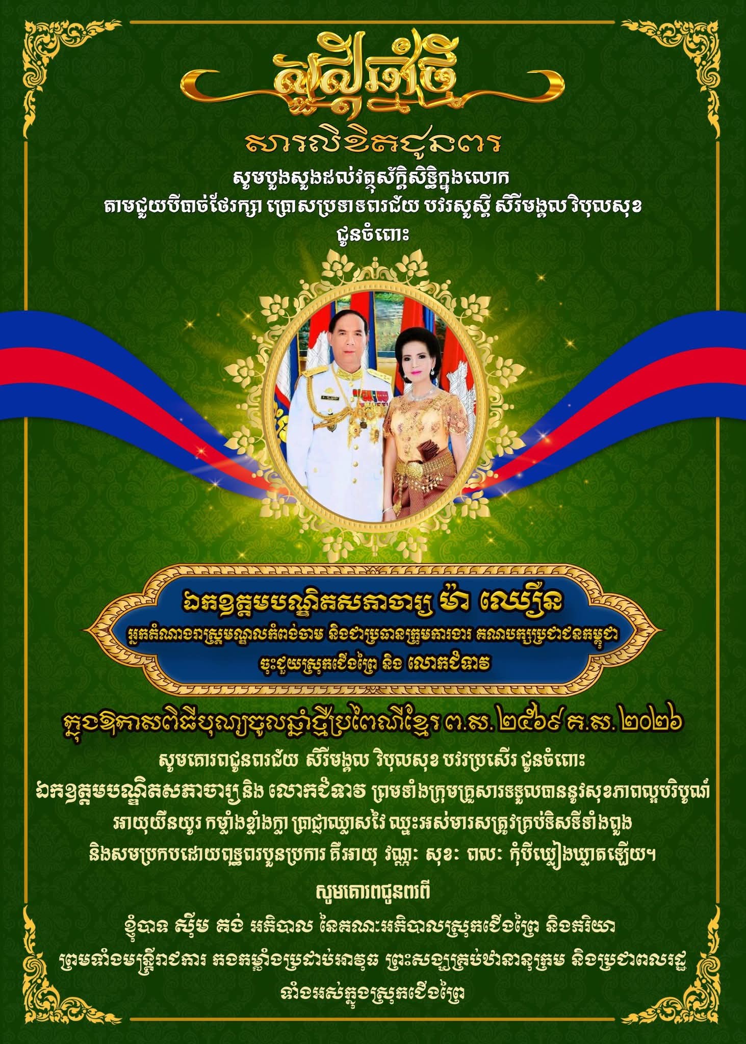 លោក ស៊ីម គង់ អភិបាល នៃគណៈអភិបាលស្រុកជើងព្រៃ គោរពជូនពរ បវរសួស្តី ជ័យមង្គល វិបុលសុខ ជូនចំពោះឯកឧត្តមបណ្ឌិតសភាចារ្យ ម៉ា ឈឿន និងលោកជំទាវបណ្ឌិត អ៊ុក ម៉ាលី ក្នុងឱកាសបុណ្យចូលឆ្នាំថ្មី ប្រពៃណីជាតិខ្មែរ ឆ្នាំមមី