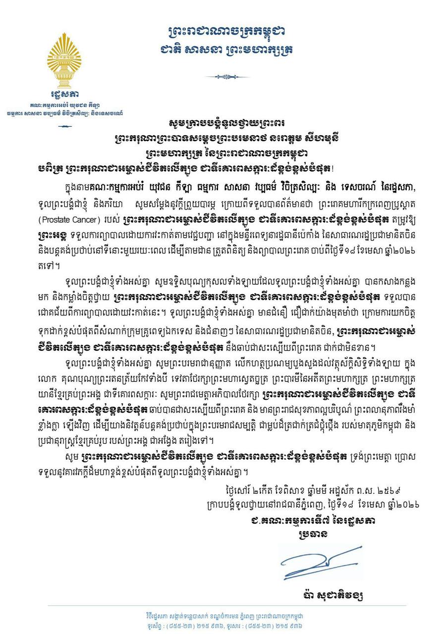 ឯកឧត្តម​ ប៉ា សុជាតិវង្ស ប្រធានគណៈកម្មការទី៧ នៃរដ្ឋសភា​ សូមក្រាបបង្គំទូលថ្វាយព្រះពរ ព្រះករុណា ព្រះបាទសម្តេច ព្រះបរមនាថ នរោត្តម សីហមុនី ព្រះមហាក្សត្រ នៃព្រះរាជាណាចក្រកម្ពុជា​ ក្នុងឱកាសដែលព្រះអង្គស្តេចយាងទទួលការវះកាត់ព្យាបាលព្រះរោគ នៅរដ្ឋធានីប៉េកាំង នាថ្ងៃទី១៨ ខែមេសា ឆ្នាំ២០២៦នេះ សូមព្រះបរមរាជានុញ្ញាតលើកហត្ថប្រណម្យបួងសួងដល់វត្ថុស័ក្តិសិទ្ធិក្នុងលោក សូមជួយបីបាច់ថែរក្សាអង្គព្រះមហាក្សត្រ ឱ្យកិច្ចការវះកាត់ទទួលបានជោគជ័យ និងសូមព្រះអង្គឆាប់បានជាសះស្បើយប្រកបដោយព្រះរាជសុខភាពល្អបរិបូណ៌ ដើម្បីគង់ប្រថាប់ជាម្លប់ដ៏ត្រជាក់ត្រជំដល់ប្រជានុរាស្ត្រខ្មែរតរៀងទៅ។