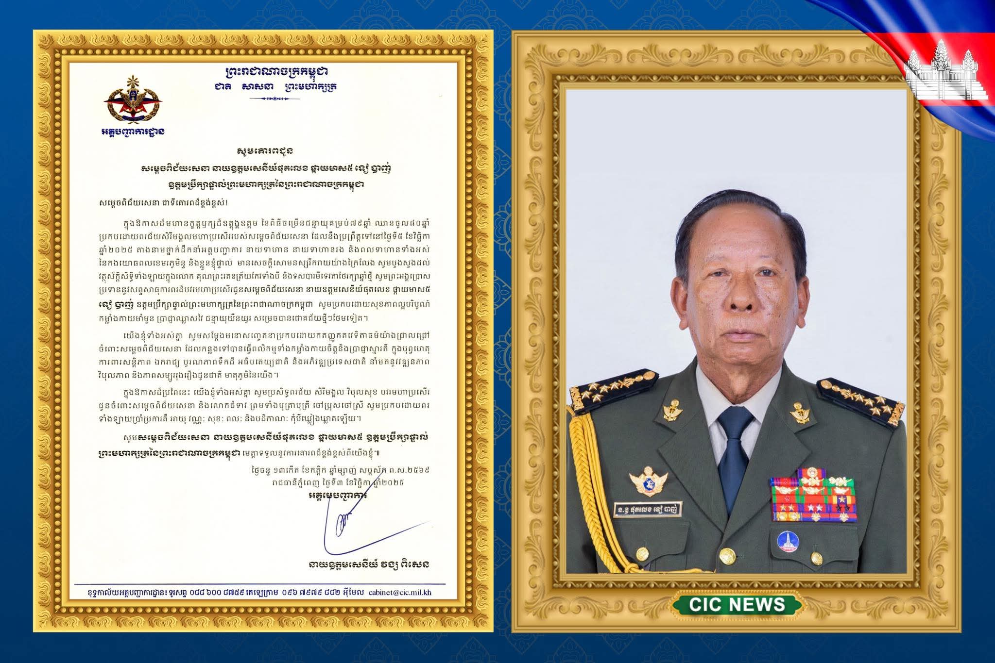 ឯកឧត្តម នាយឧត្ដមសេនីយ៍ វង្ស ពិសេន សូមផ្ញើសារលិខិតជូនពរគោរពជូន សម្ដេចពិជ័យសេនា នាយឧត្ដមសេនីយ៍ផុតលេខ ផ្កាយមាស៥ ទៀ បាញ់ ក្នុងឱកាសសិរីមង្គល នៃថ្ងៃខួបចម្រើនជន្មាយុ អានបន្ត