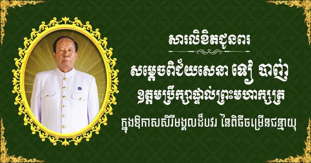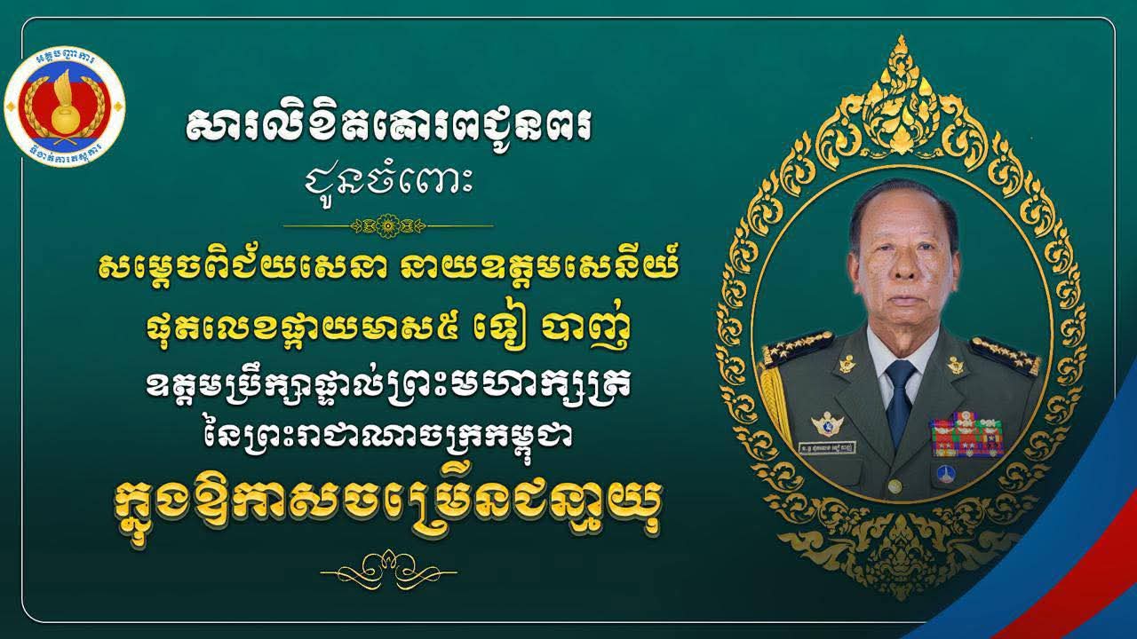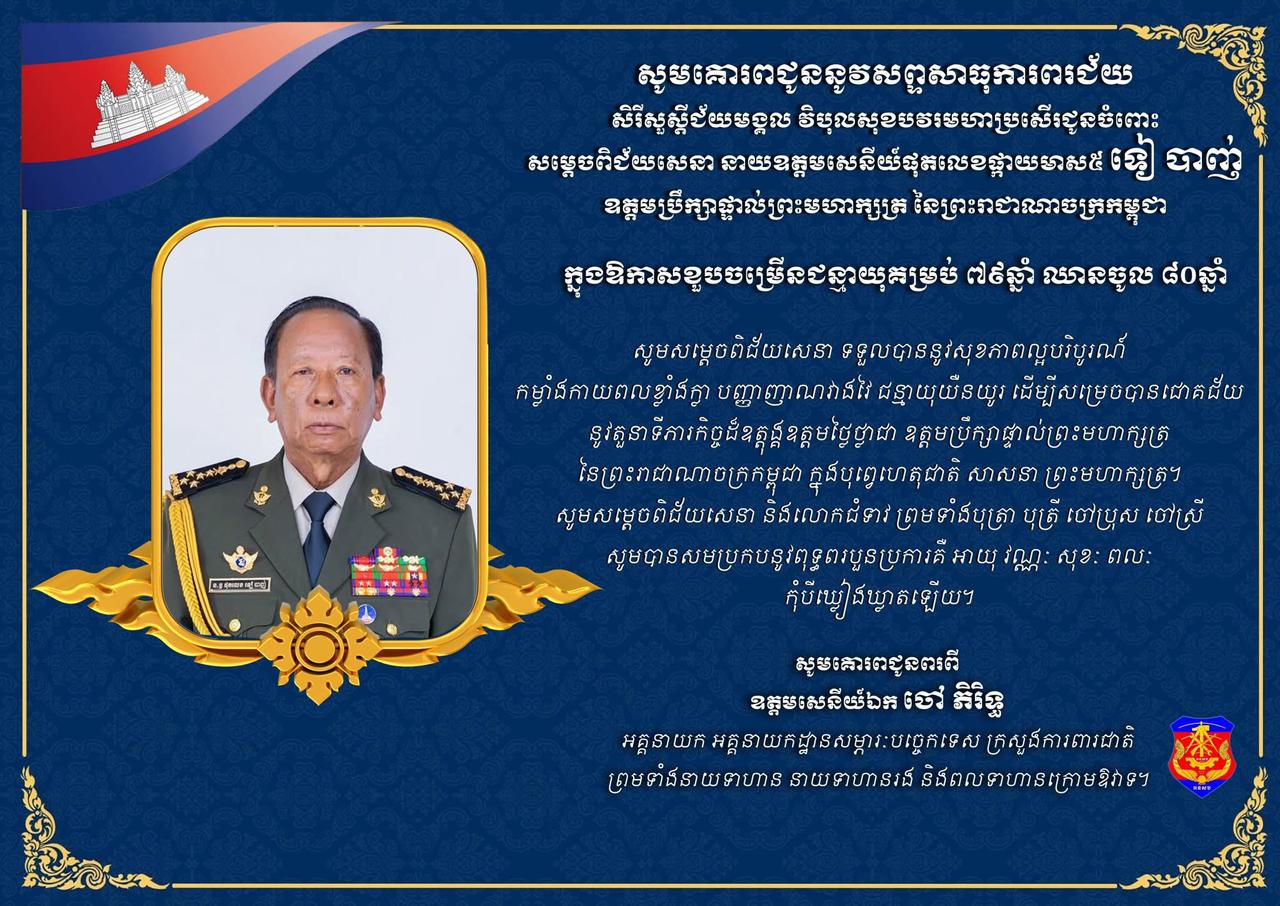 ឯកឧត្តម ឧត្តមសេនីយ៍ឯក ចៅ ភិរិទ្ធ អគ្គនាយក អគ្គនាយកដ្ឋានសម្ភារៈបច្ចេកទេស ក្រសួងការពារជាតិ សូមគោរពជូនពរជូនចំពោះសម្តេចពិជ័យសេនា នាយឧត្តមសេនីយ៍ផុតលេខផ្កាយមាស៥ ទៀ បាញ់ ក្នុងឱកាសខួបចម្រើនជន្មាយុ គម្រប់៧៩ឆ្នាំ ឈានចូល ៨០ឆ្នាំ អានបន្ត