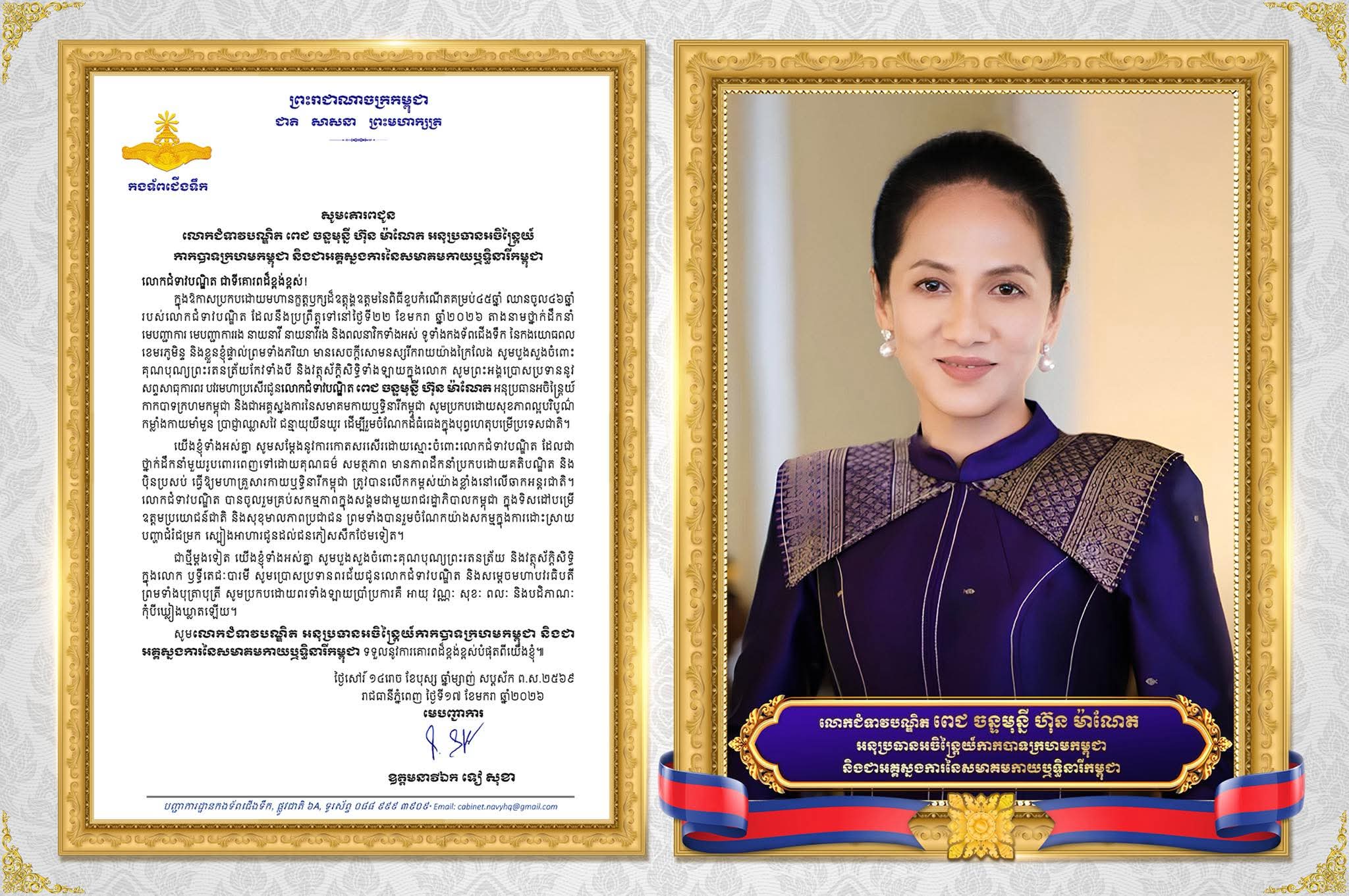 ឯកឧត្តម ឧត្តមសេនីយ៍ឯក ហួត ឈាងអន នាយរងសេនាធិការចម្រុះ នាយកទីចាត់ការភស្តុភារ អគ្គបញ្ជាការ ផ្ញើសារលិខិតជូនពរ គោរពជូន លោកជំទាវបណ្ឌិត ពេជ ចន្ទមុន្នី ហ៊ុន ម៉ាណែត ក្នុងឱកាសចម្រើនជន្មាយុគម្រប់៤៥ ឈានចូល ៤៦ឆ្នាំ នៅថ្ងៃទី២២ ខែមករា ឆ្នាំ២០២៦ អានបន្ត