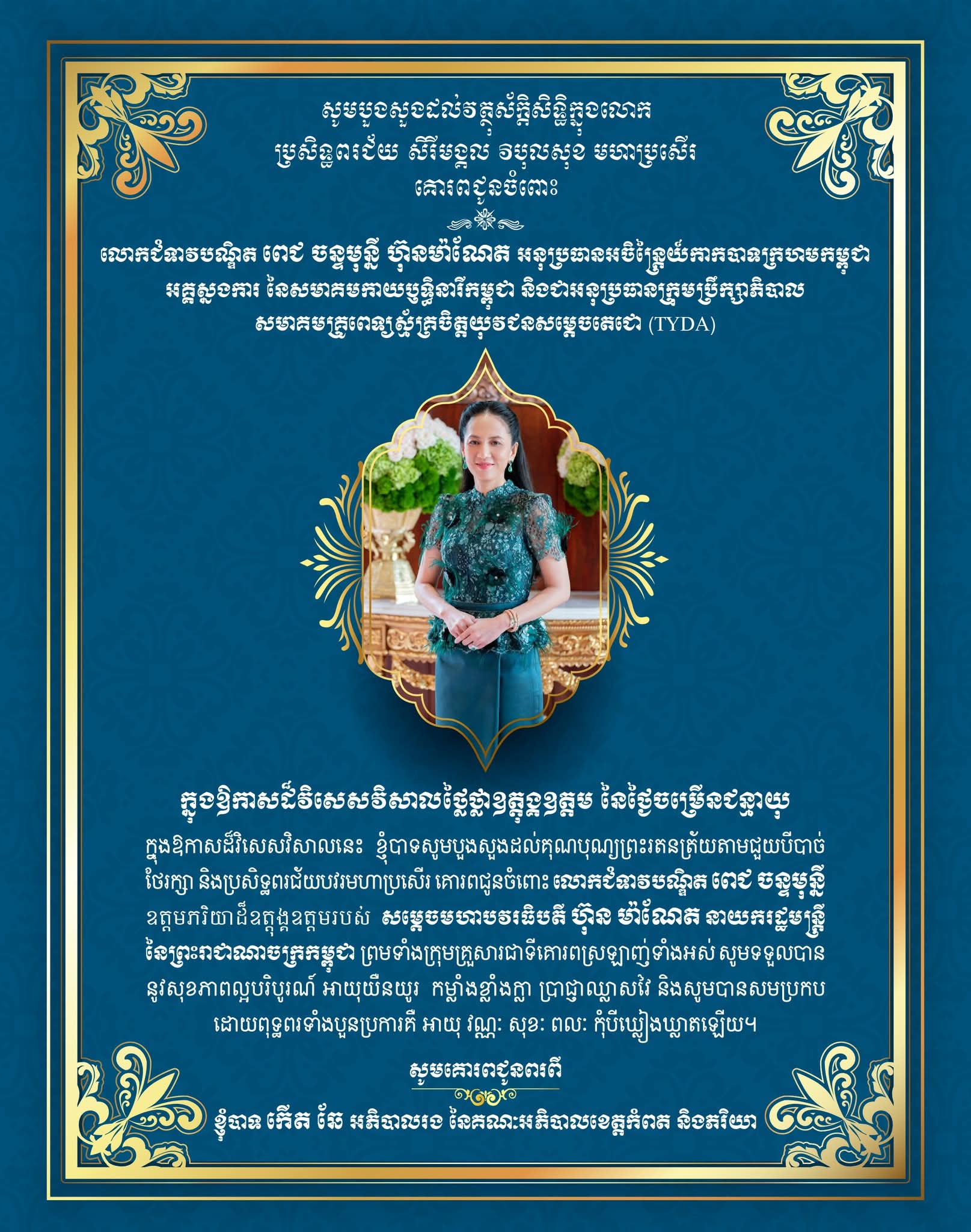 ឯកឧត្តម អ៊ុន ចាន់ដា អភិបាលខេត្តកំពង់ចាម ផ្ញើសារលិខិតជូនពរ សូមគោរពជូនឯកឧត្តមសន្តិបណ្ឌិត នេត សាវឿន ឧបនាយករដ្ឋមន្ត្រី ក្នុងឱកាស នៃខួបចម្រើនជន្មាយុ គម្រប់ ៦៦ ឈានចូល ៦៧ឆ្នាំ