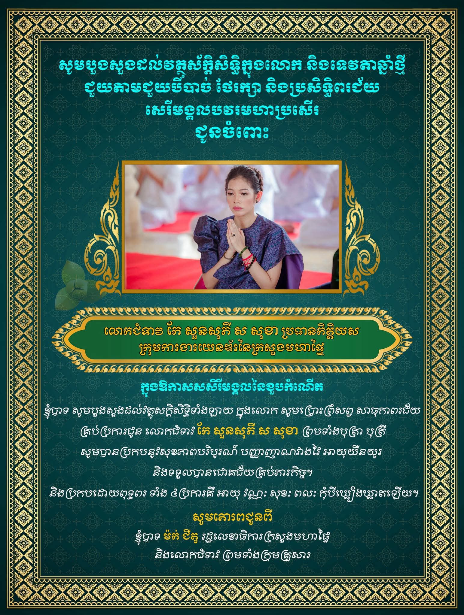 ឯកឧត្តមបណ្ឌិត ម៉ក់ ជីតូ រដ្នលេខាធិការក្រសួងមហាផ្ទៃ សូមគោរពជូនពរ លោកជំទាវ កែ សួនសុភី ស សុខា ប្រធានកិត្តិយសការងារយេនឌ័រ នៃក្រសួងមហាផ្ទៃ ក្នុងឱកាសខួបកំណើត អានបន្ត