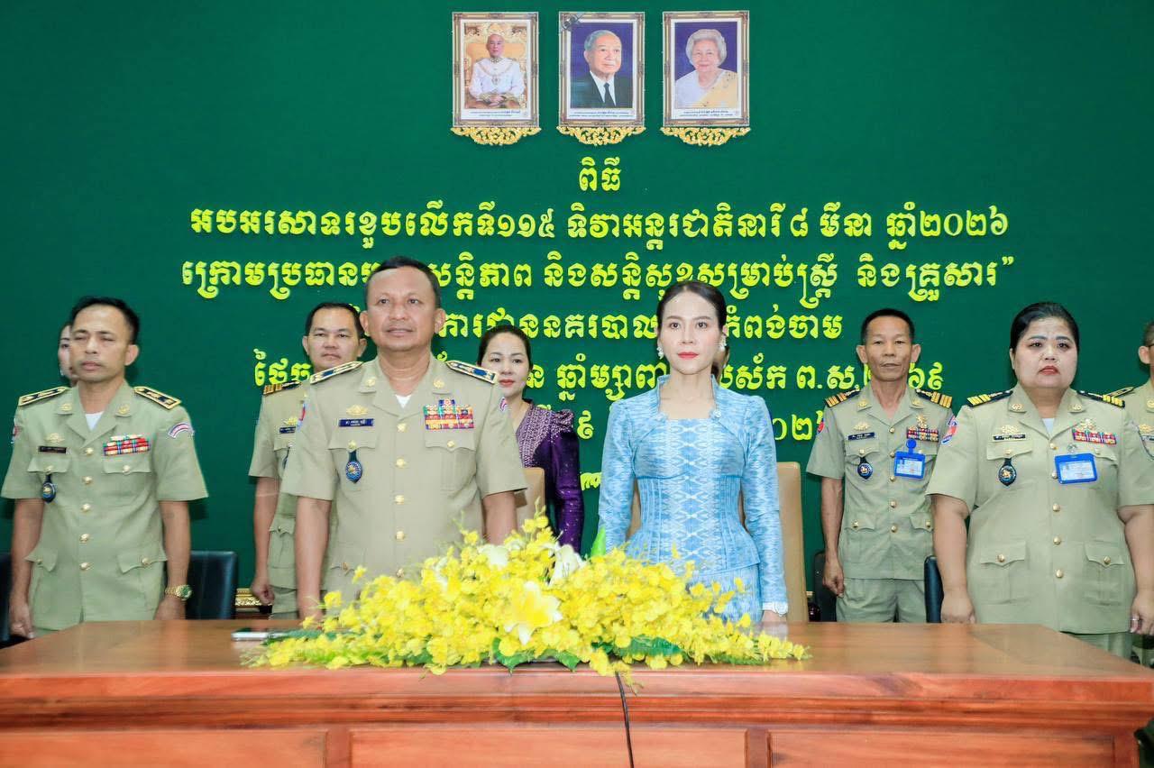 លោកឧត្តមសេនីយ៍ទោ ហេង វុទ្ធី និងលោកស្រី ឈាង ស្រីនាថ ប្រធានកិត្តិយសអនុសាខាសមាគមនារីកម្ពុជាដើម្បីសន្តិភាព និងអភិវឌ្ឍន៍ស្នងការដ្ឋាននគរបាលខេត្តកំពង់ចាម អញ្ជើញជាអធិបតីភាព ក្នុងពិធីអបអរសាទរខួបលើកទី ១១៥ ទិវាអន្តរជាតិនារី ៨ មីនា ក្រោមប្រធានបទ សន្តិភាព និងសន្តិសុខសម្រាប់ស្ត្រី និងគ្រួសារ អានបន្ត