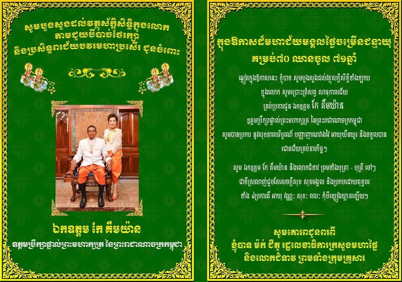 ឯកឧត្តមបណ្ឌិត ម៉ក់ ជីតូ រដ្ឋលេខាធិការក្រសួងមហាផ្ទៃ សូមគោរពជូនពរ ឯកឧត្ដម កែ គឹមយ៉ាន ឧត្តមប្រឹក្សាផ្ទាល់ព្រះមហាក្សត្រ ក្នុងឱកាសមហាជ័យមង្គលថ្ងៃចម្រើនជន្មាយុ គម្រប់៧០ ឈានចូល៧១ឆ្នាំ អានបន្ត