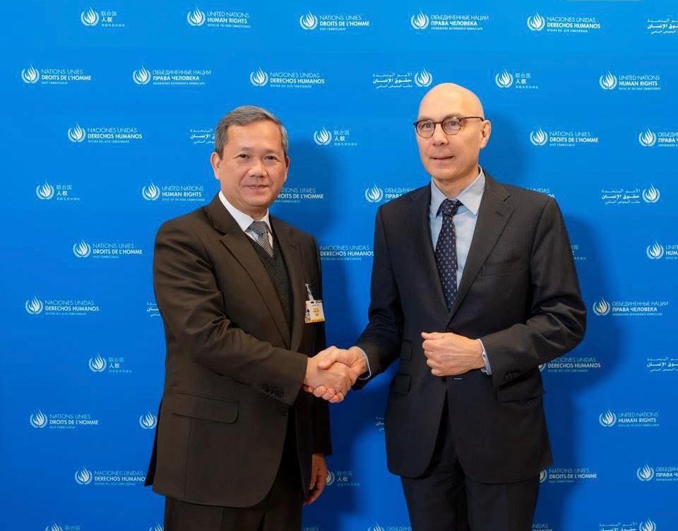 សម្ដេចមហាបវរធិបតី ហ៊ុន ម៉ាណែត នាយករដ្នមន្ត្រី នៃព្រះរាជាណាចក្រកម្ពុជា អញ្ចើញជួបជាមួយ ឯកឧត្តម Volker Türk ឧត្តមស្នងការសហប្រជាជាតិ ទទួលបន្ទុកសិទ្ធិមនុស្ស ក្នុងជំនួបសម្តែងការគួរសម និងពិភាក្សាការងារ នៅប្រទេសស្វីស អានបន្ត