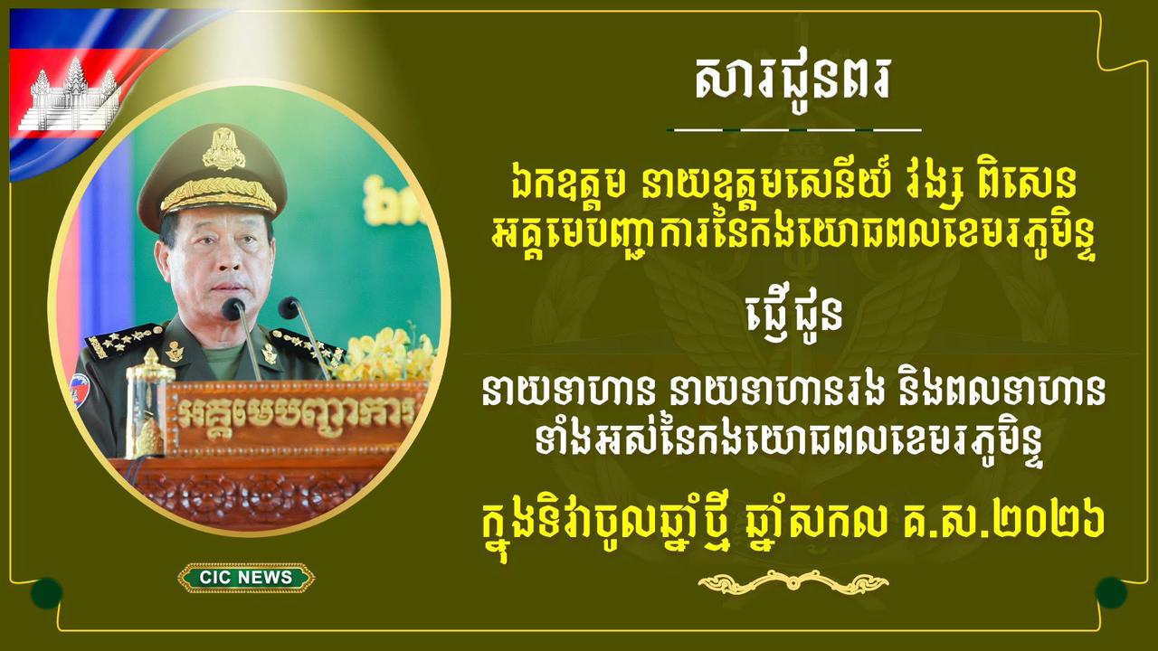 ឯកឧត្តម នាយឧត្តមសេនីយ៍ វង្ស ពិសេន អគ្គមេបញ្ជាការនៃកងយោធពលខេមរភូមិន្ទ ផ្ញើសារលិខិតជូនពរ នាយទាហាន នាយទាហានរង និងពលទាហានទាំងអស់ នៃកងយោធពលខេមរភូមិន្ទ ក្នុងទិវាចូលឆ្នាំសកល គ.ស ២០២៦ អានបន្ត