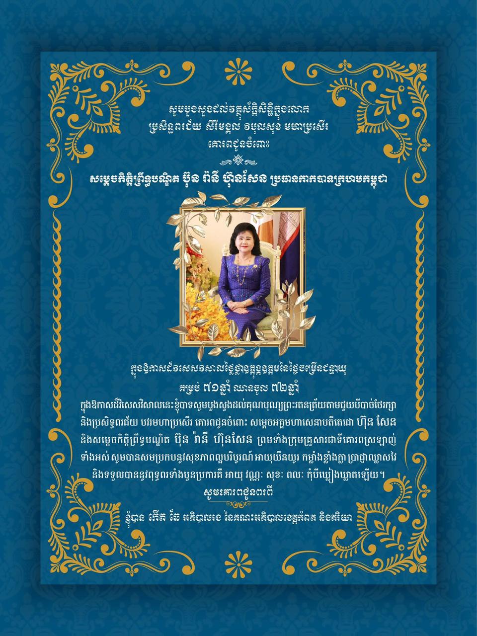 ឯកឧត្តម កើត ឆែ អភិបាលរងខេត្តកំពត និងលោកជំទាវ ផ្ញើសារលិខិតគោរពជូនពរ សម្តេចកិត្តិព្រឹទ្ធបណ្ឌិត ប៊ុន រ៉ានី ហ៊ុនសែន ប្រធានកាកបាទក្រហមកម្ពុជា ក្នុងឱកាសដ៏វិសេសថ្លៃថ្លាឧត្តុង្គឧត្តម ចម្រើនជន្មាយុគម្រប់ ៧១ឆ្នាំ ឈានចូល ៧២ឆ្នាំ អានបន្ត