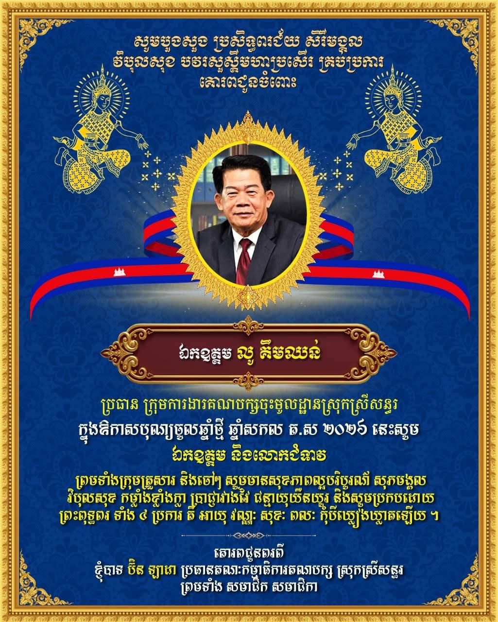 លោក ប៊ិន ឡាដា ប្រធាន គណៈគម្មាធិការ គណបក្សស្រុកស្រីសន្ធរ ព្រមទាំងសមាជិក សមាជិកា សូមគោរពជូនពរជ័យ ជូនចំពោះ ឯកឧត្តម លូ គឹមឈន់ ប្រធានក្រុមការងារគណបក្សចុះមូលដ្ឋានស្រុកស្រីសន្ធរ និងលោកជំទាវ ក្នុងឱកាសឆ្នាំថ្មី ឆ្នាំសកល គ.ស.២០២៦ អានបន្ត