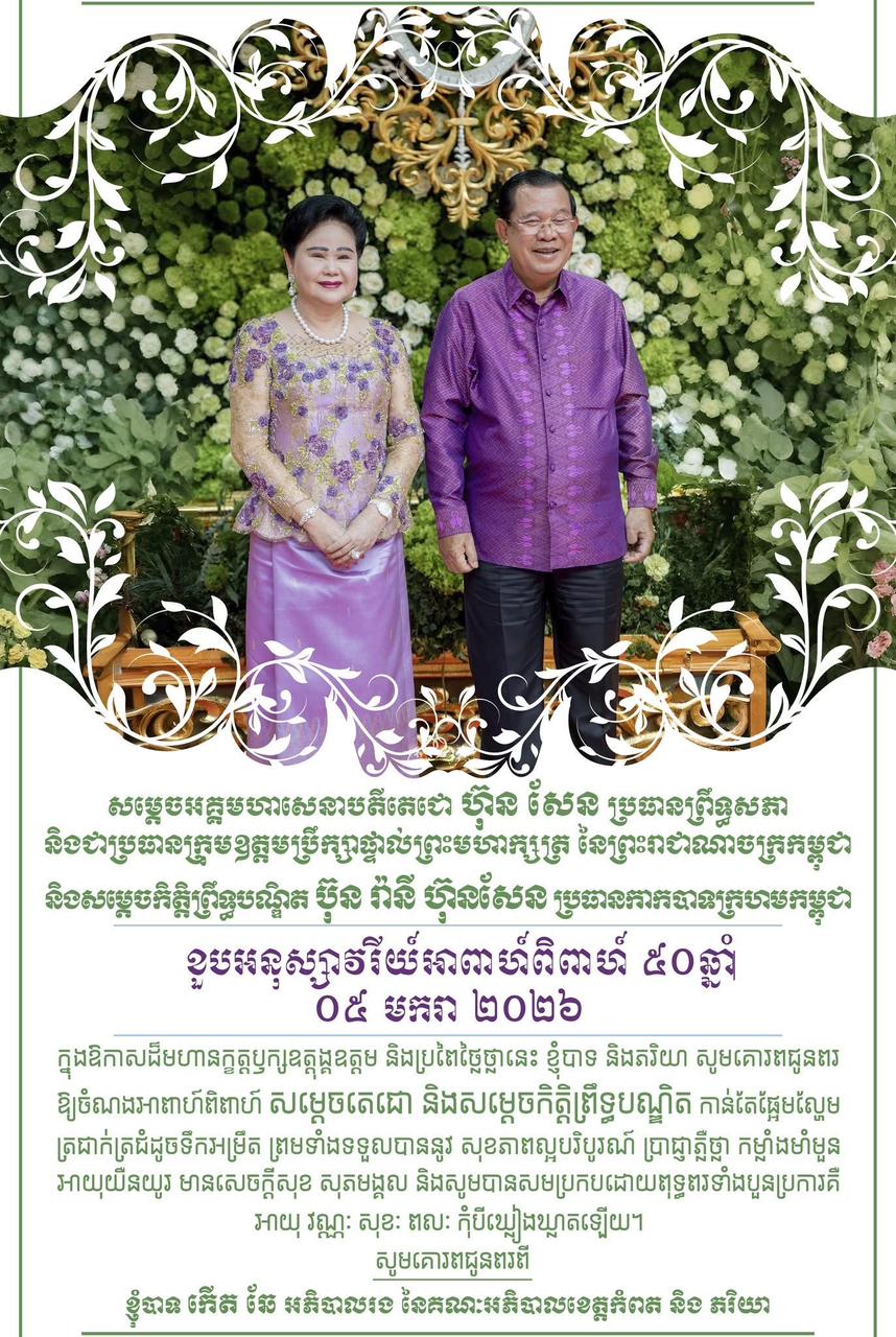 ឯកឧត្តម កើត ឆែ អភិបាលរងខេត្តកំពត និងលោកជំទាវ ផ្ញើសារគោរពជូនពរសម្តេចអគ្គមហាសេនាបតីតេជោ ហ៊ុន សែន និងសម្ដេចកិត្តិព្រឹទ្ធបណ្ឌិត ប៊ុន រ៉ានី ហ៊ុនសែន ក្នុងឱកាសប្រកបដោយ សិរីមង្គលប្រសើរថ្លៃថ្លា នៃចំណងអាពាហ៍ពិពាហ៍ខួប ៥០ឆ្នាំ អានបន្ត