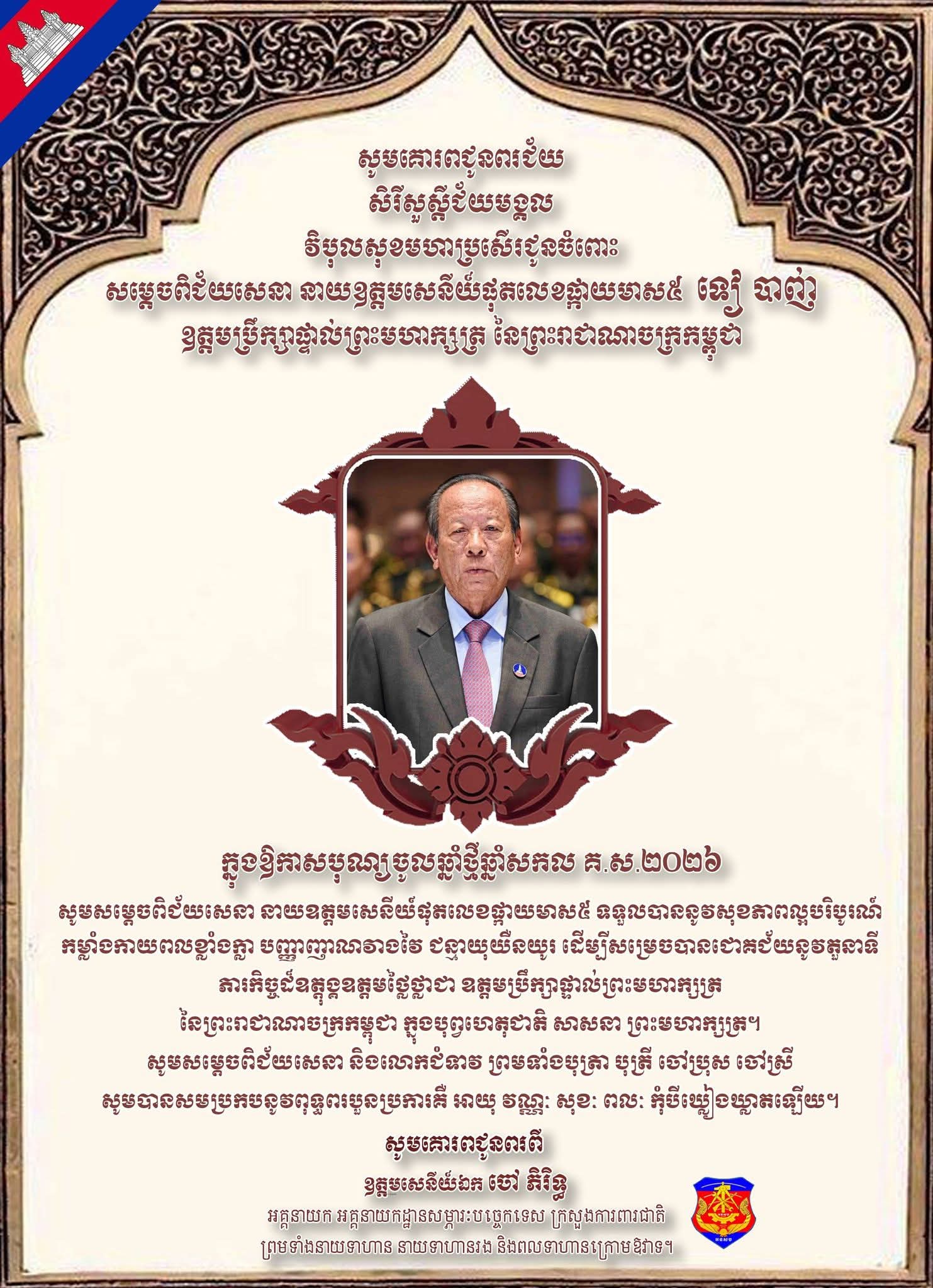 ឯកឧត្តម ឧត្តមសេនីយ៍ឯក ចៅ ភិរិទ្ធ អគ្គនាយក អគ្គនាយកដ្ឋានសម្ភារៈបច្ចេកទេស ក្រសួងការពារជាតិ សូមគោរពជូនពរជ័យ ជូនចំពោះ សម្តេចពិជ័យសេនា នាយឧត្តមសេនីយ៍ផុតលេខផ្កាយមាស៥ ទៀ បាញ់ ក្នុងឱកាសបុណ្យចូលឆ្នាំថ្មី ឆ្នាំសកល គ.ស.២០២៦ អានបន្ត