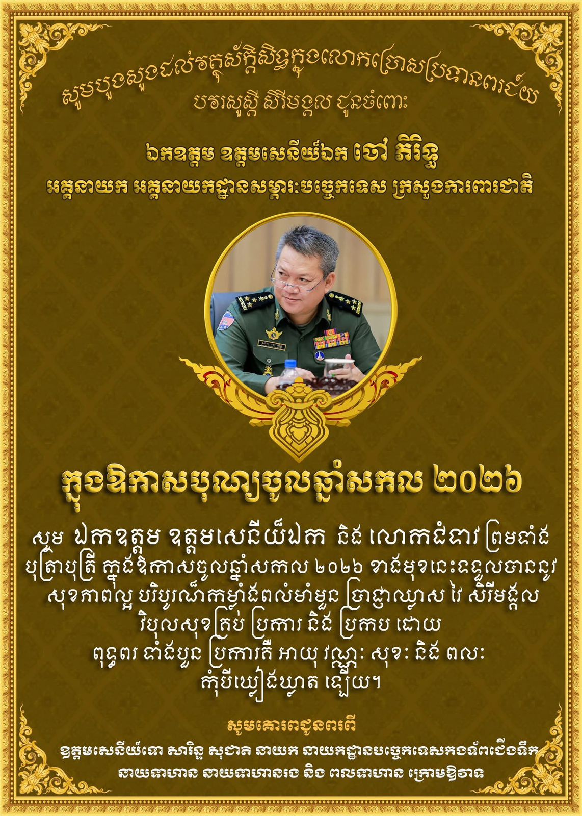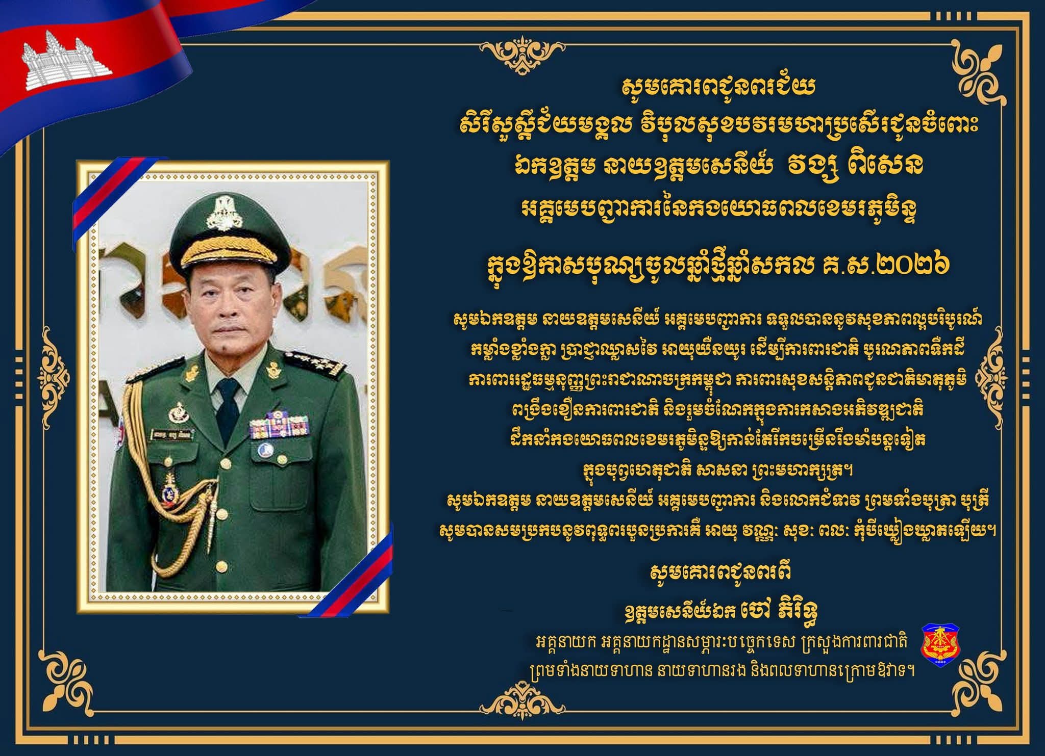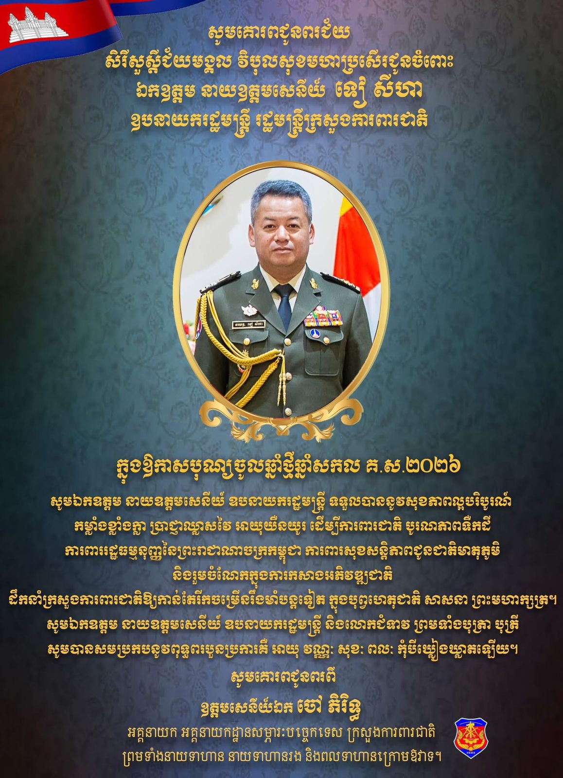 ឯកឧត្តម ឧត្តមសេនីយ៍ឯក ចៅ ភិរិទ្ធ អគ្គនាយក អគ្គនាយកដ្ឋានសម្ភារៈបច្ចេកទេស ក្រសួងការពារជាតិ សូមគោរពជូនពរជ័យ ជូនចំពោះ ឯកឧត្តម នាយឧត្តមសេនីយ៍ ទៀ សីហា ឧបនាយករដ្ឋមន្ត្រី រដ្ឋមន្ត្រីក្រសួងការពារជាតិ ក្នុងឱកាសបុណ្យចូលឆ្នាំថ្មី ឆ្នាំសកល គ.ស.២០២៦ អានបន្ត