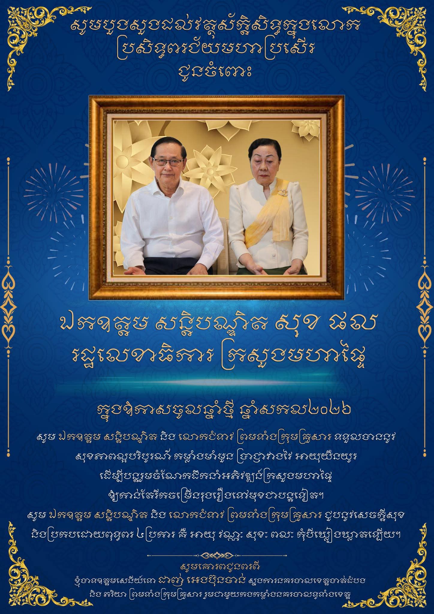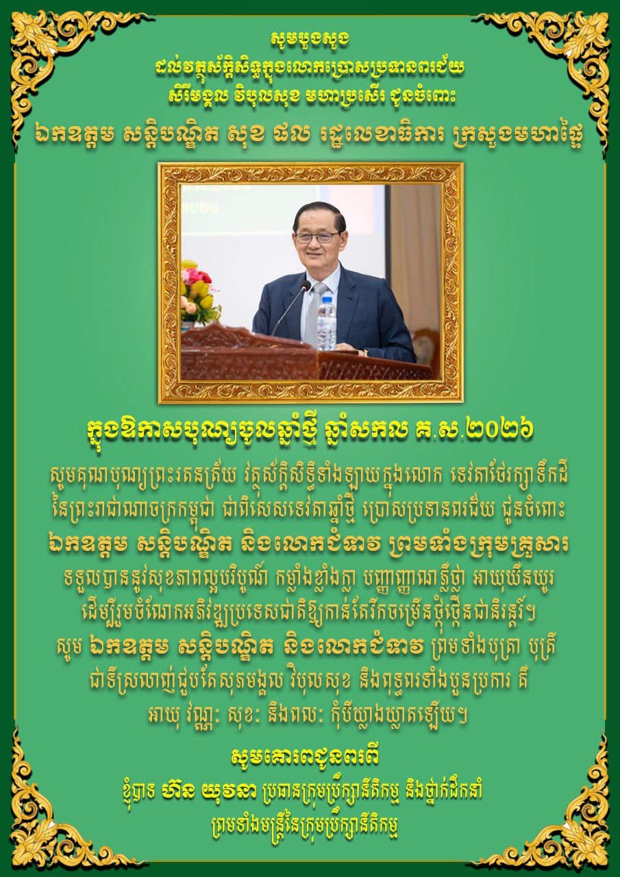 ថ្នាក់ដឹកនាំ និងមន្ត្រី នៃក្រុមប្រឹក្សានីតិកម្ម សូមគោរពជូនពរ ជូនចំពោះឯកឧត្តម សន្តិបណ្ឌិត សុខ ផល រដ្ឋលេខាធិការក្រសួងមហាផ្ទៃ និងលោកជំទាវ ព្រមទាំងក្រុមគ្រួសារ ក្នុងឱកាសចូលឆ្នាំថ្មី ឆ្នាំសកល ២០២៦ អានបន្ត