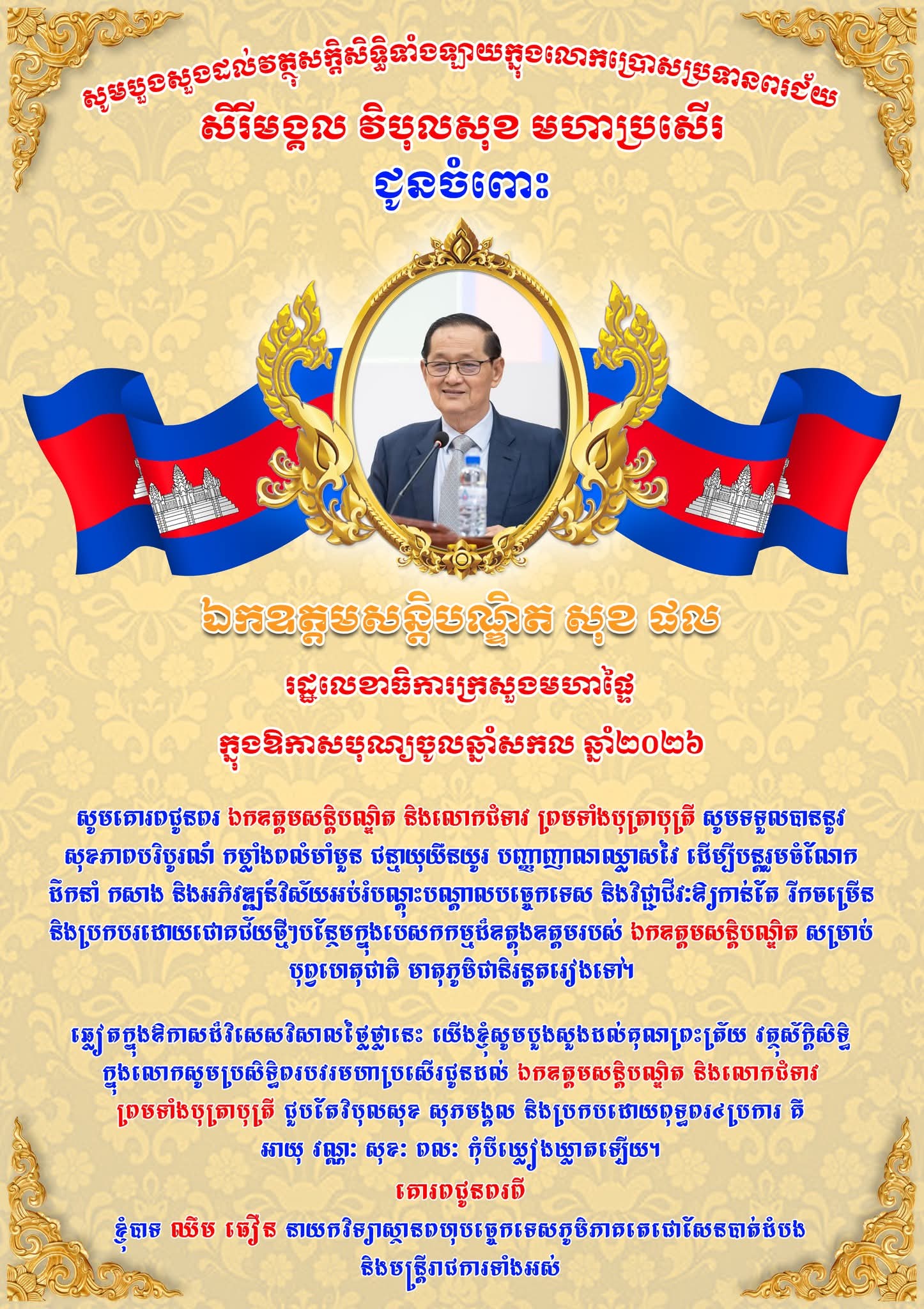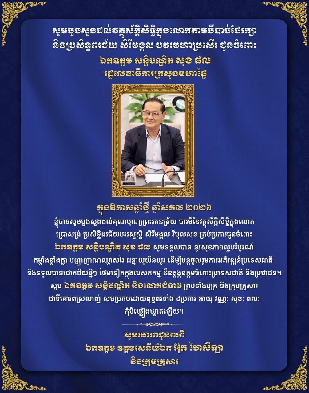 សម្តេចមហារដ្ឋសភាធិការធិបតី ឃួន សុដារី ប្រធានរដ្ឋសភា ផ្ញើសារលិខិតសូមគោរពជូនពរ សម្តេចកិត្តិសង្គហបណ្ឌិត ម៉ែន សំអន ឧត្តមប្រឹក្សាផ្ទាល់ព្រះមហាក្សត្រ ក្នុងឱកាសបុណ្យចូលឆ្នាំថ្មី ឆ្នាំសកល ២០២៦ អានបន្ត
