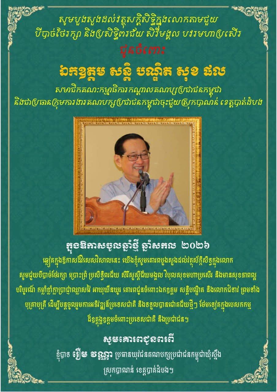 ប្រធានយុវជនគណបក្សប្រជាជនកម្ពុជាឃុំស្នឹង ផ្ញើសារលិខិតជូនពរ ឯកឧត្តមសន្តិបណ្ឌិត សុខ ផល សមាជិកគណៈកម្មាធិការកណ្ដាល និងជាប្រធានក្រុមការងារគណបក្សចុះមូលដ្ឋានស្រុកបាណន់ ក្នុងឱកាសឆ្នាំថ្មី ឆ្នាំសកល ២០២៦ អានបន្ត