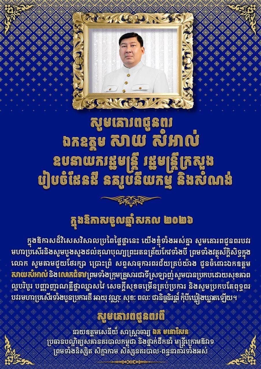 ឯកឧត្ដមនាយឧត្ដមសេនីយ៍ សាស្ដ្រាចារ្យ ឯក មនោសែន ប្រធានបណ្ឌិត្យសភានគរបាលកម្ពុជា ផ្ញើសារលិខិតគោរពជូនពរ ឯកឧត្តម សាយ សំអាល់ ឧបនាយករដ្ឋមន្រ្តី រដ្ឋមន្ត្រីក្រសួងរៀបចំដែនដី នគរូបនីយកម្ម និងសំណង់ និងលោកជំទាវ ក្នុងឱកាសចូលឆ្នាំថ្មី ឆ្នាំសកល ២០២៦ អានបន្ត