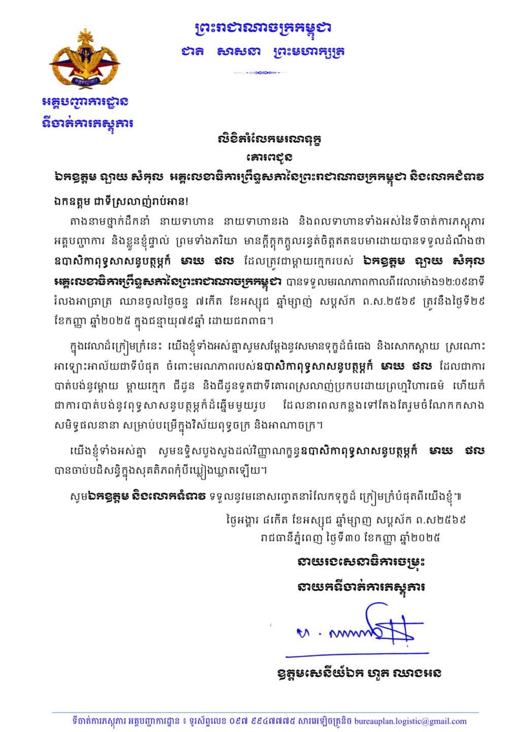 ឯកឧត្ដម ឧត្តមសេនីយ៍ឯក ហួត ឈាងអន នាយរងសេនាធិការចម្រុះ នាយកទីចាត់ការភស្តុភារ បានផ្ញើសារលិខិតរំលែកទុក្ខជូនលោកស្រី ពៅ គីមស្រ៊ុន ព្រមទាំងក្រុមគ្រួសារ ចំពោះមរណភាពលោក ផល សុផេង ដែលត្រូវជាស្វាមី អានបន្ត